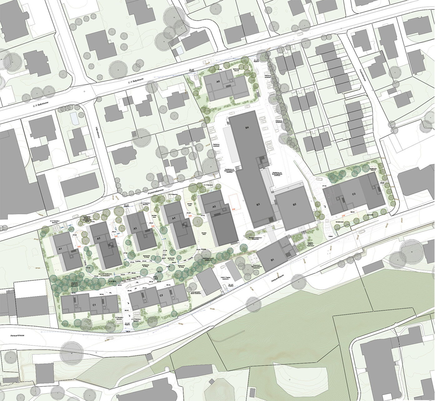 Die bestehenden Gewerbebauten werden weiterhin als solche genutzt werden. Daneben sind mehrheitlich Wohnbauten vorgesehen. Die Wohnbauten verfügen über eine planerische Flexibilität, die eine Justierung auf die Bestellung im Planungsprozess zulässt. Es sind sowohl Miet- wie auch Eigentumswohnungen vorgesehen. Die hohe Variabilität an Lösungen führt zu der Möglichkeit unterschiedlichster Wohnformen für eine Vielzahl denkbarer Lebensverhältnisse anbieten zu können: von der Singlewohnung über Wohnraum für junge Familien, Alters-WGs, Senioren- und Mehrgenerationenwohnen sowie Startwohnungen für Paare reicht das angebotene Spektrum. So kann die angestrebte soziale und altersmässige Durchmischung der Bewohnerstruktur optimal umgesetzt werden. Die Anordnung von gemeinschaftlichen Räumlichkeiten – Gewerbe, KITA, Gemeinschaftsräume, Ateliers - wird helfen, die Idee der generationenübergreifenden Gemeinschaft zusätzlich zu stärken.