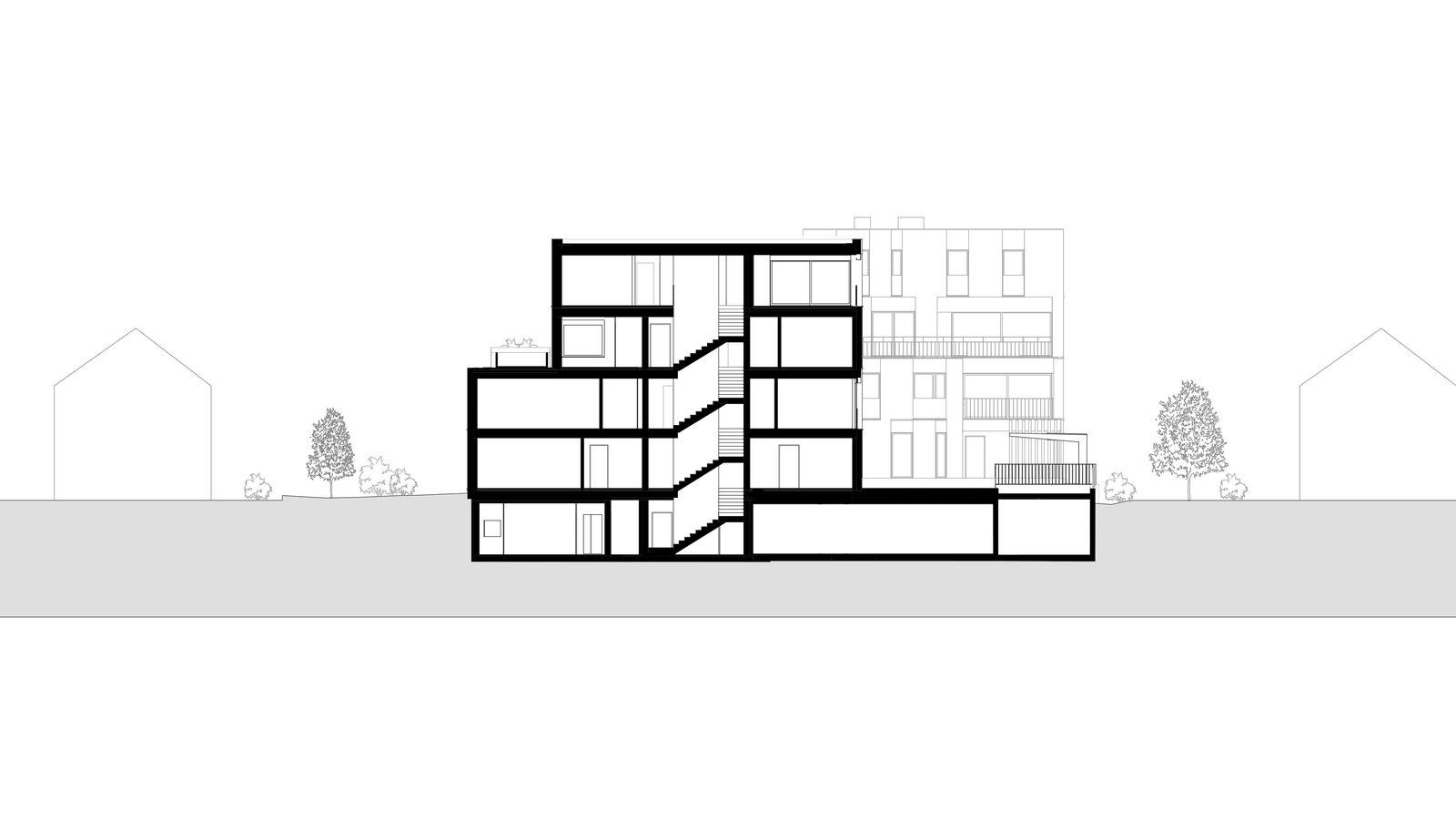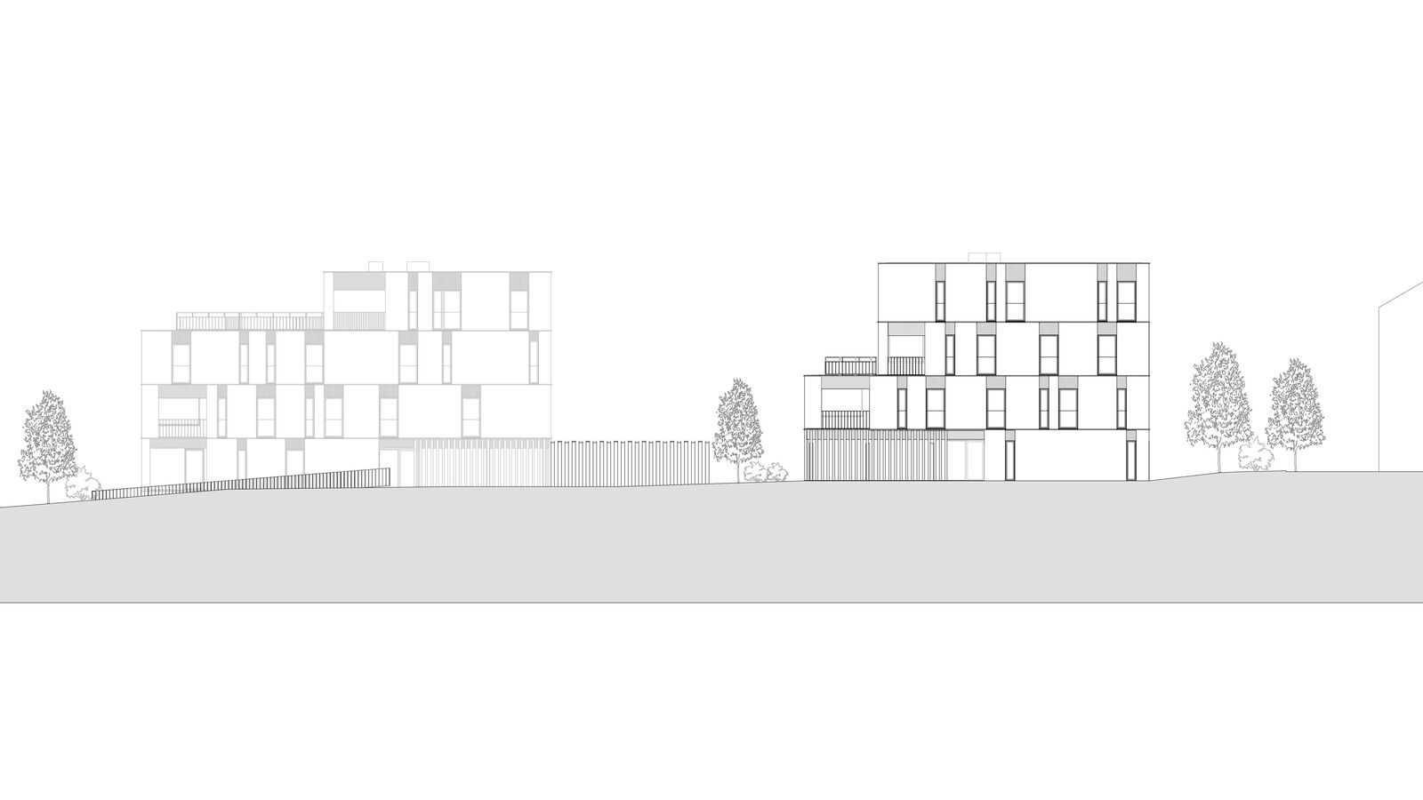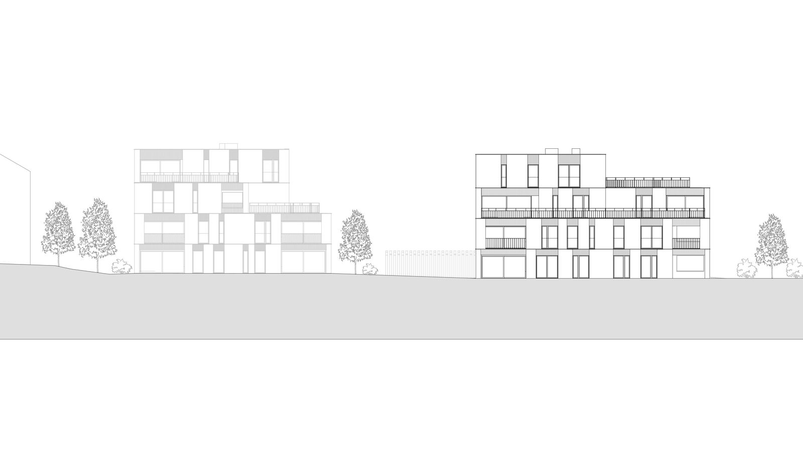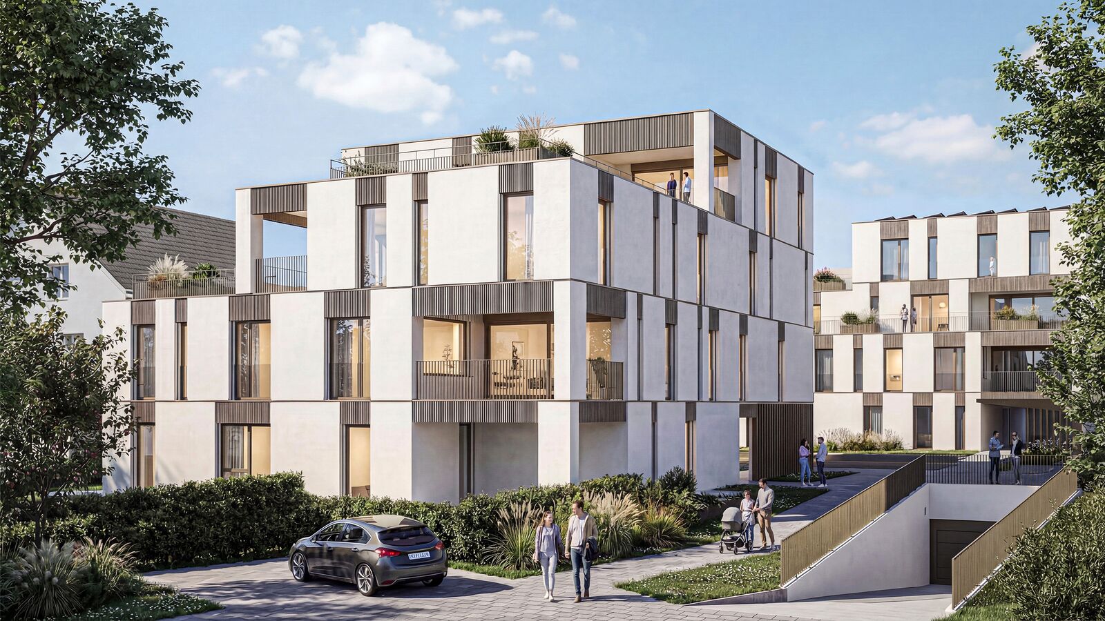 Die zwei geplanten Mehrfamilienhäuser fügen sich gut in den örtlichen Kontext ein indem die annähernd quadratischen Grundrisse angemessener Körnigkeit bringen. Zur optimierten Einordnung sind die beiden Neubauten in der Höhe gestaffelt. Die jeweils zweiten und dritten Obergeschosse sind reduziert, was eine interessante und unaufdringlich wirkende Volumetrie ergibt. Lediglich je ein Teil der Nord- und der Ostfassaden sind viergeschossig.