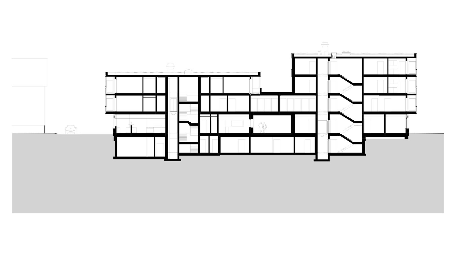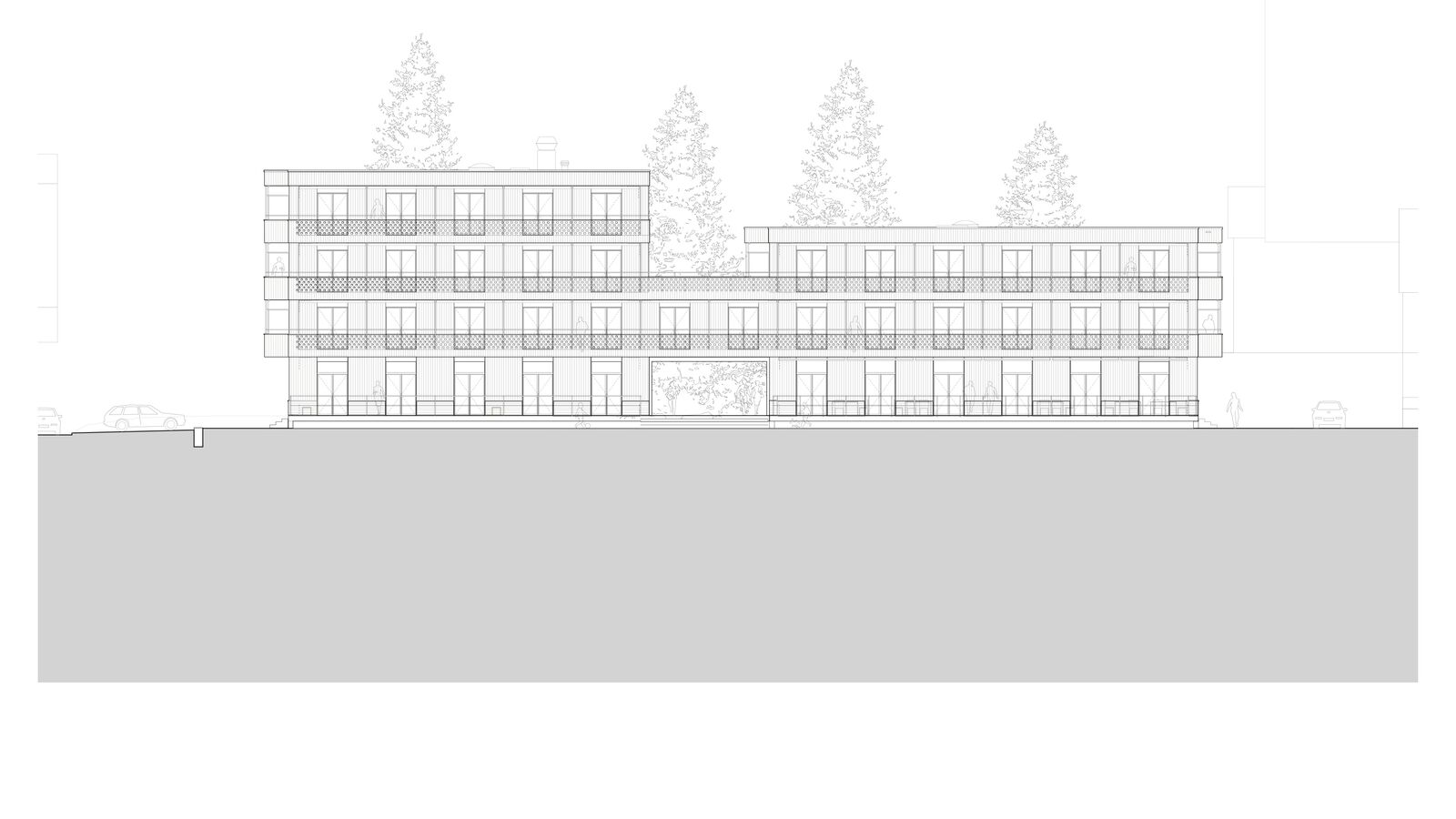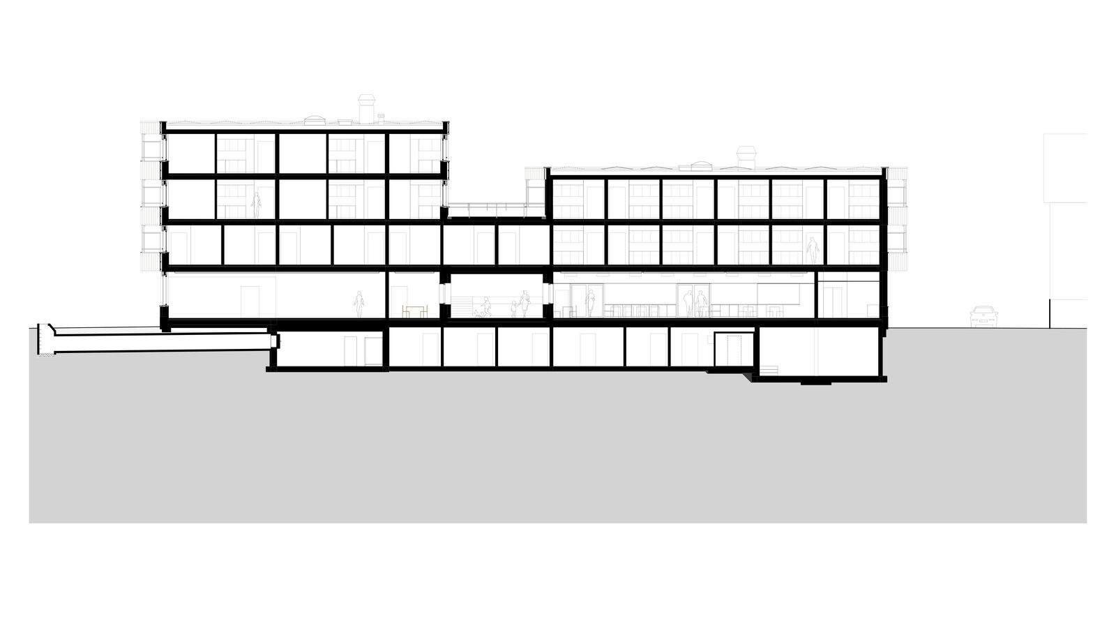 Der Ersatzneubau vereint das vielseitige Raumprogramm und passt sich den verschiedenen Massstäben des Kontextes an. Zwei rechteckige Gebäudeeinheiten werden im 1. Obergeschoss zu einem Gebäude verbunden, während im Erdgeschoss ein grosszügiger Durchgang frei bleibt. Ein zusammenhängendes Gebäude bringt aus betrieblicher Sicht Vorteile und ist für die vorgesehene Nutzung als Wohnheim nachvollziehbar. Das Raumprogramm ist dennoch kompakt angeordnet, dass der Baukörper einen vergleichsweisen geringen Fussabdruck aufweist. Die Volumetrie ist in der Höhe differenziert und im Grundriss versetzt und passt sich so der unmittelbaren Umgebung an.