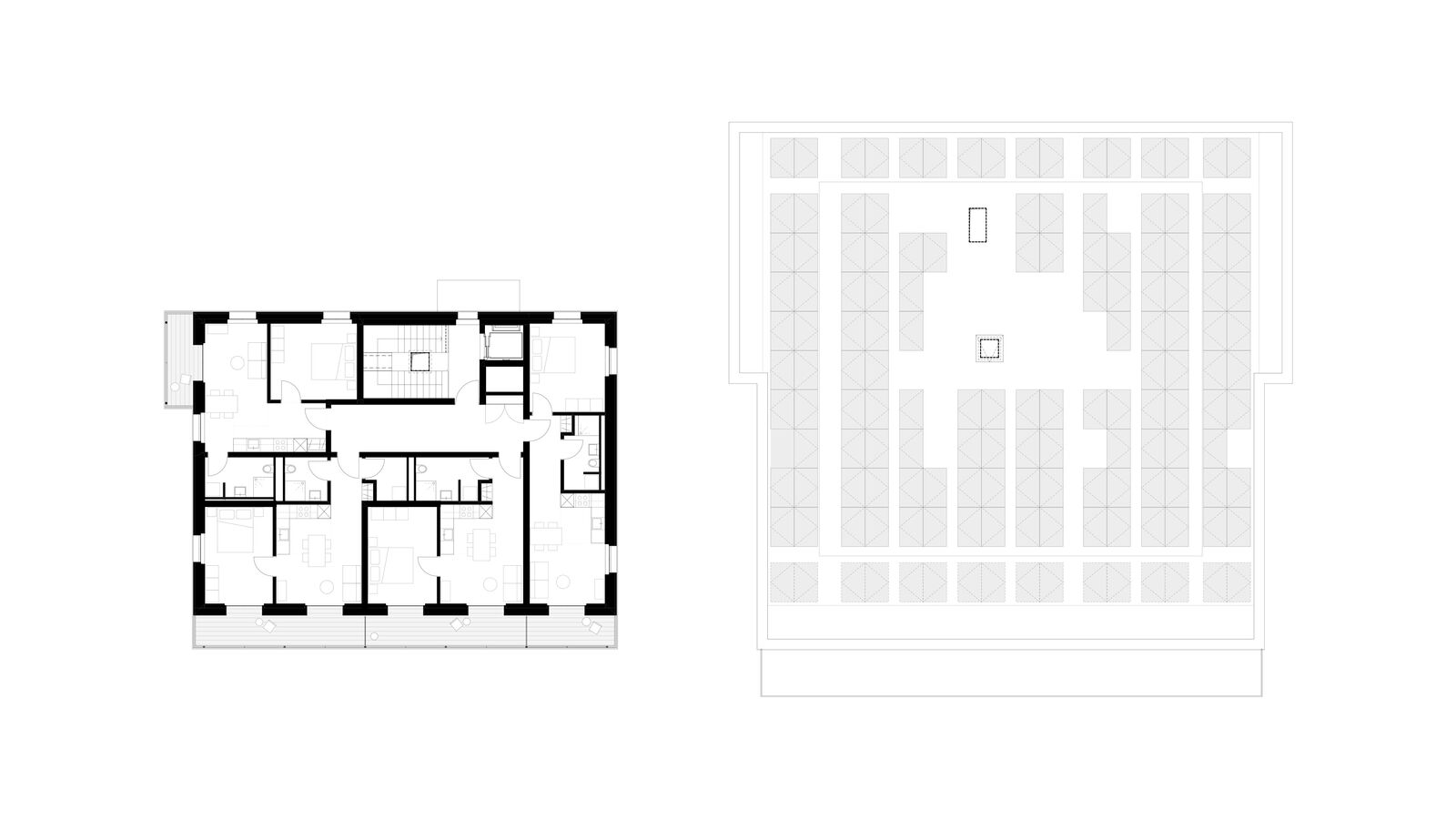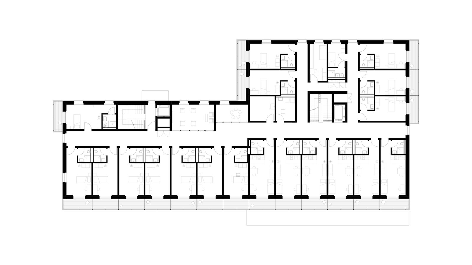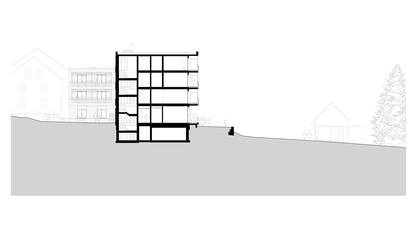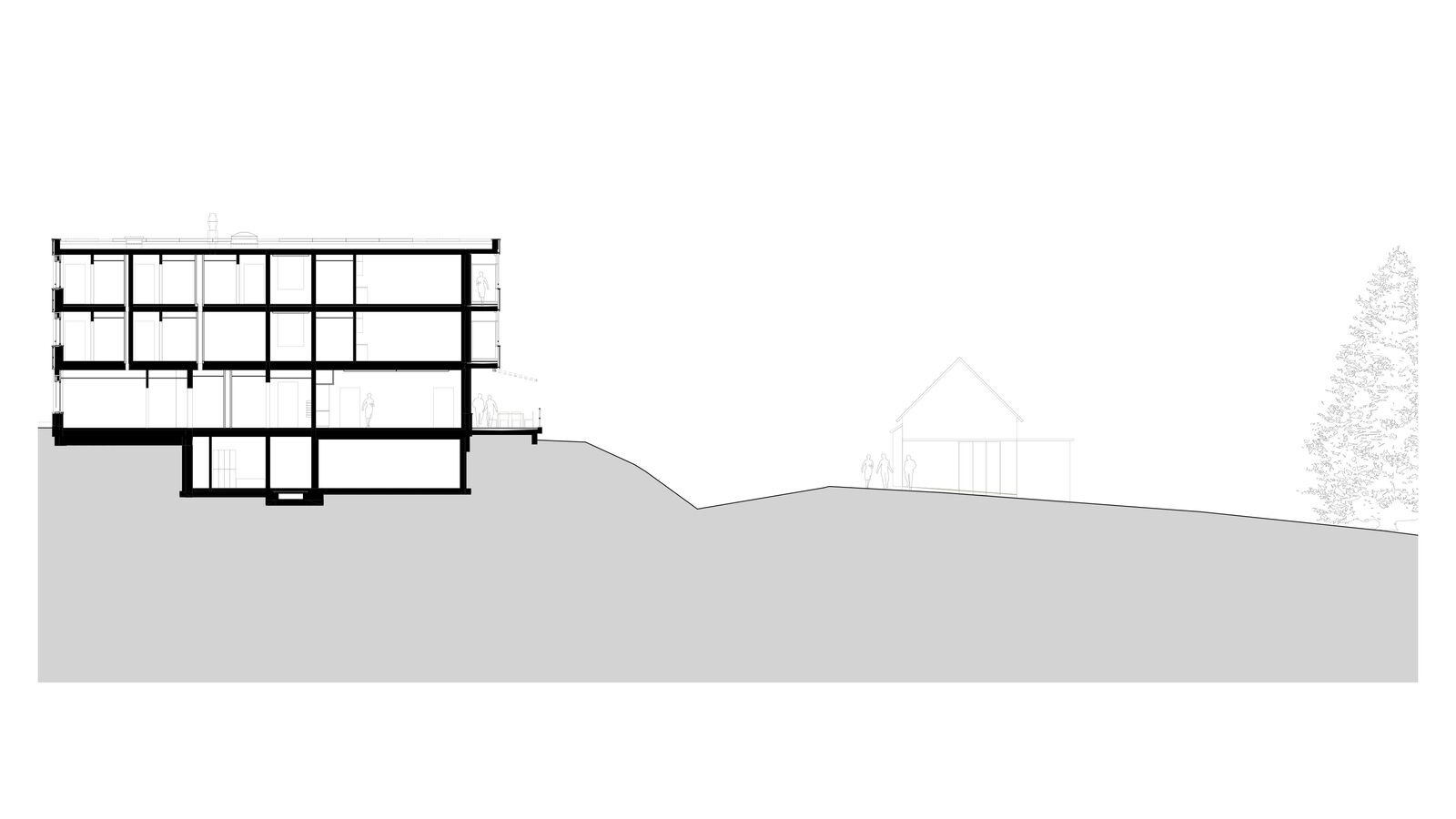 Der Ersatzneubau vereint das vielseitige Raumprogramm und passt sich den verschiedenen Massstäben des Kontextes an. Zwei rechteckige Gebäudeeinheiten werden im 1. Obergeschoss zu einem Gebäude verbunden, während im Erdgeschoss ein grosszügiger Durchgang frei bleibt. Ein zusammenhängendes Gebäude bringt aus betrieblicher Sicht Vorteile und ist für die vorgesehene Nutzung als Wohnheim nachvollziehbar. Das Raumprogramm ist dennoch kompakt angeordnet, dass der Baukörper einen vergleichsweisen geringen Fussabdruck aufweist. Die Volumetrie ist in der Höhe differenziert und im Grundriss versetzt und passt sich so der unmittelbaren Umgebung an.