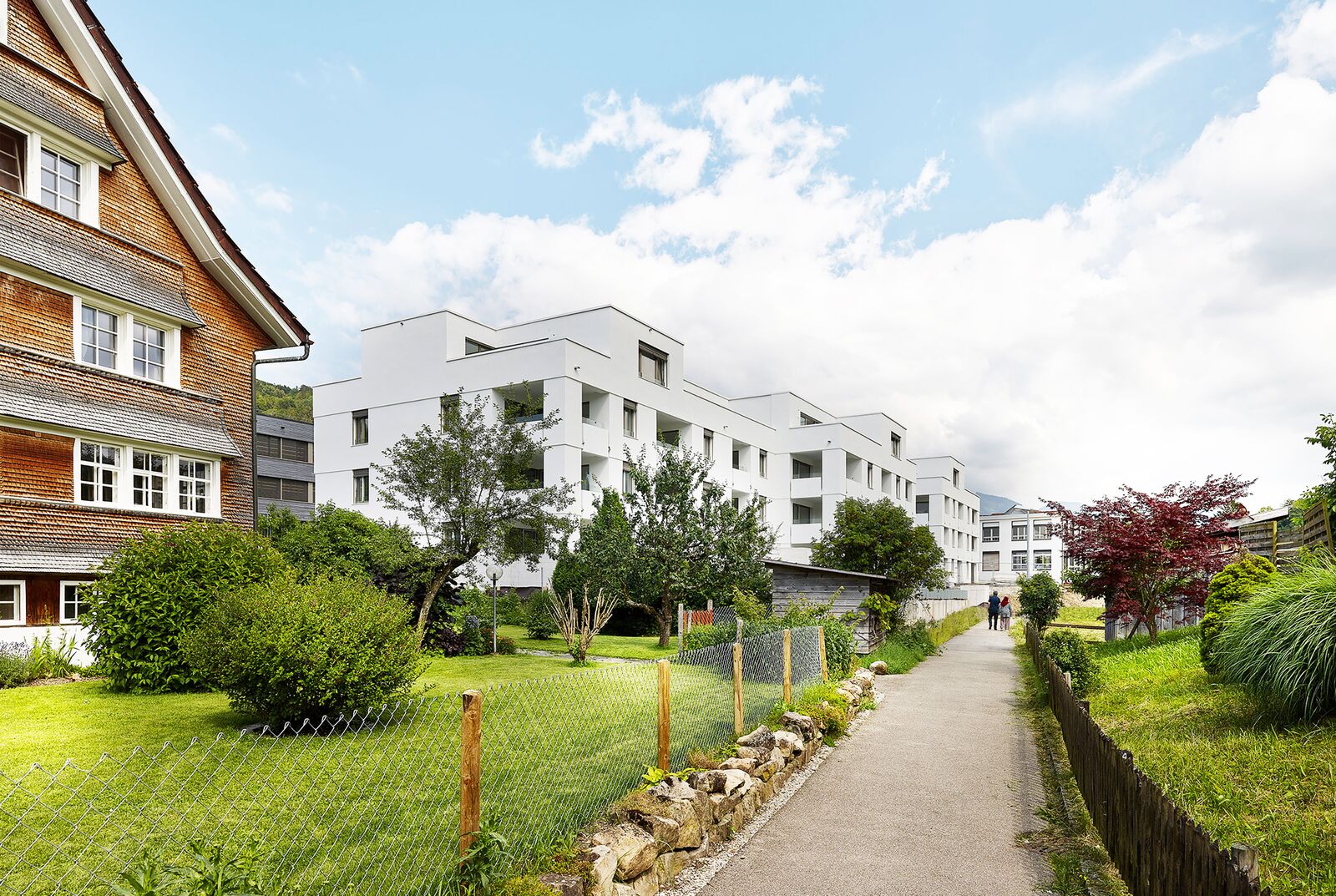 Die Architektur der Neubauten wirkt kompakt und mural. Dabei reagiert sie auf verschiedene charakteristische Elemente des Ortes. Die Häuser springen mit jedem Geschoss leicht nach aussen. Diese feine tektonische Zäsur schützt die Fassade und die Fenster vor Witterungseinflüssen und interpretiert so gestalterisch und funktional die im Dorf charakteristischen, friesartigen Verdachungen über den Fenstern neu. Gleichzeitig gliedert sie die Fassade horizontal und vermittelt so auch zu den neuen Schulbauten vis à vis der Rosenbüelstrasse mit den für Holzbauten charakteristischen geschossweisen Unterteilungen der Hinterlüftungsebene.