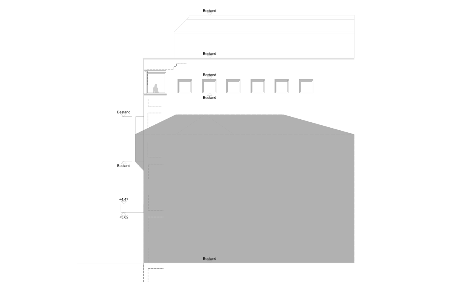 Unter Berücksichtigung der Kosten und der Wirtschaftlichkeit wurde im begleitenden Gremium der Entscheid gefällt, die Variante «zurück nach 1968» weiterzuverfolgen. Diese Variante reduziert die Komplexität der heutigen Fassade durch den Rückbau der Stahl-Glas-Konstruktionen aus den 80’er Jahren. Mittels einer Band-Verglasung im OG 3 werden die angrenzenden Räumlichkeiten gut belichtet und die Gebäudehöhe wird gegliedert und den Nachbarbauten angeglichen.