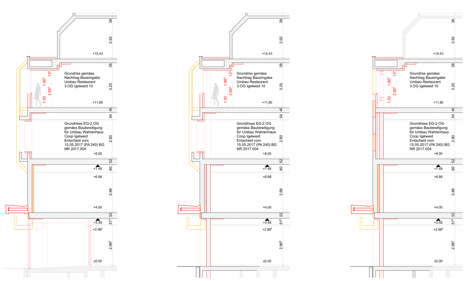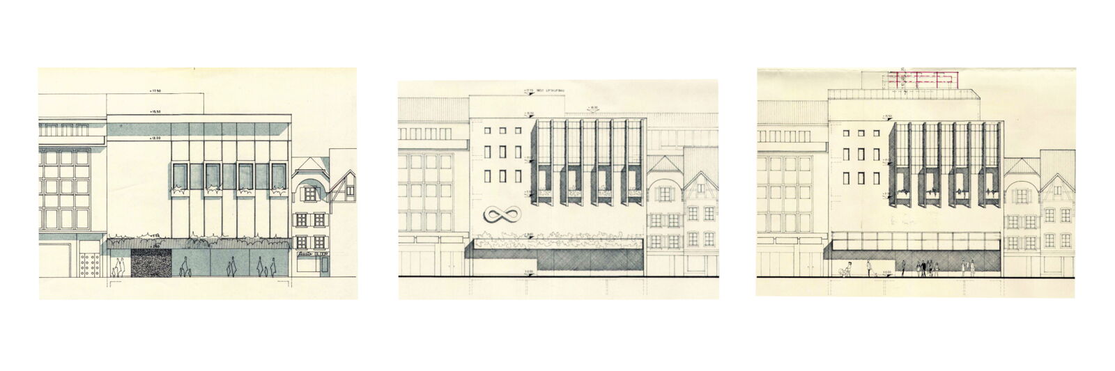 Aus den Nutzerbedürfnissen, den historischen Recherchen und den Forderungen der Behörden haben wir vier Strategien abgeleitet. Die Strategien untersuchten verschiedene Eingriffstiefen und Bezüge zu den angrenzenden Bauten.