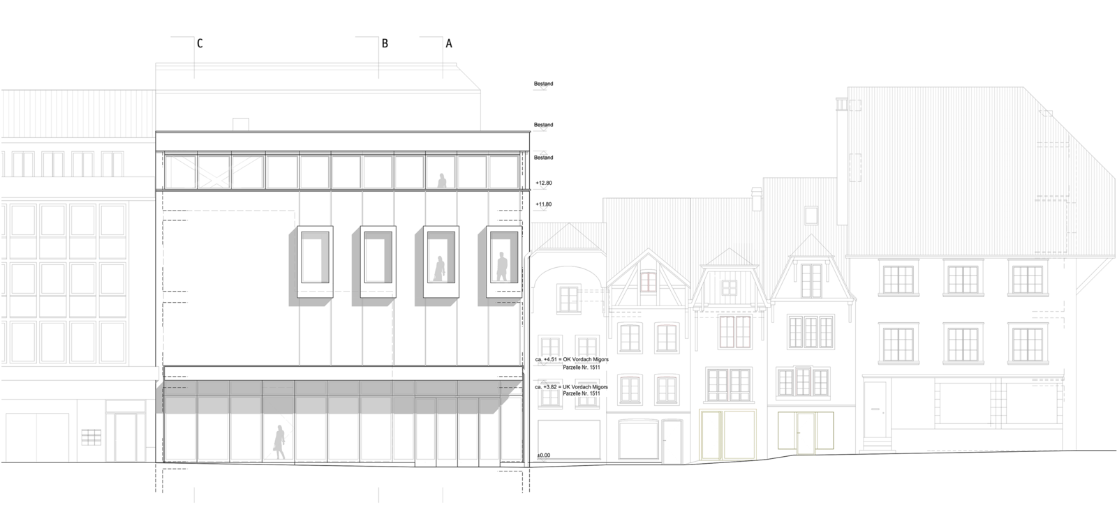 Der heute etwas «gedrängt» wirkende Eingangsbereich wird aufgewertet. Erreicht wird dies durch die Anhebung des Vordachbereichs. Das Vordach in Metall wird als Teil der Verglasung im Erdgeschoss gelesen und trägt so zu einer grosszügigen und einladenden Geste bei.