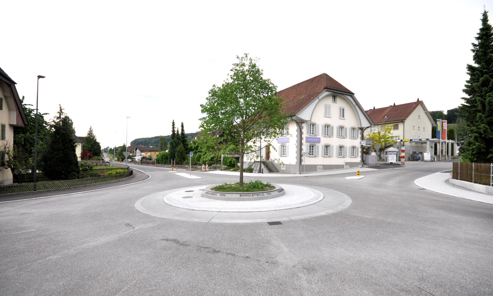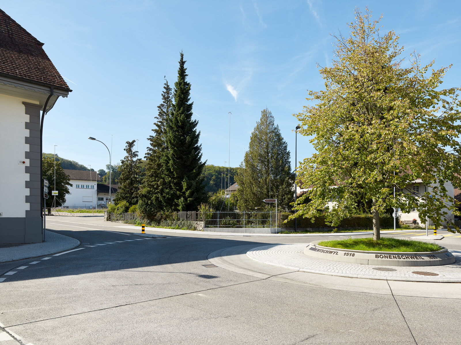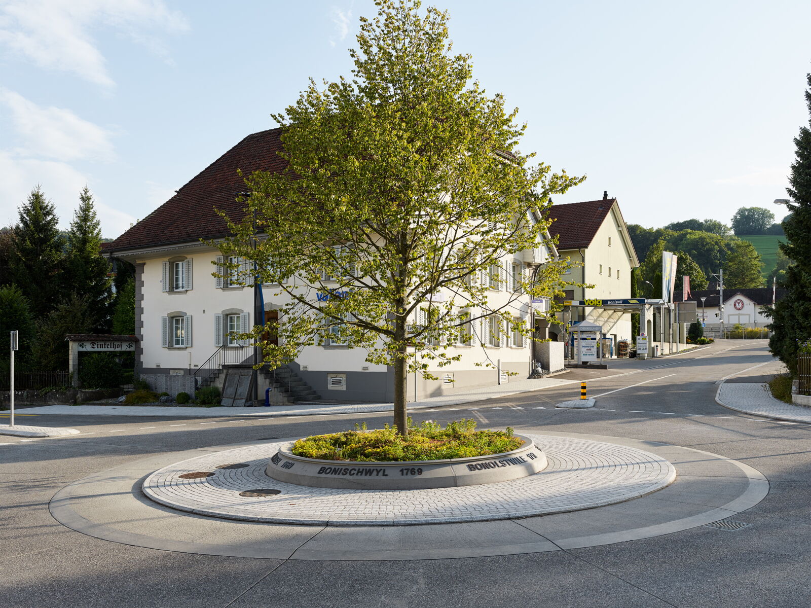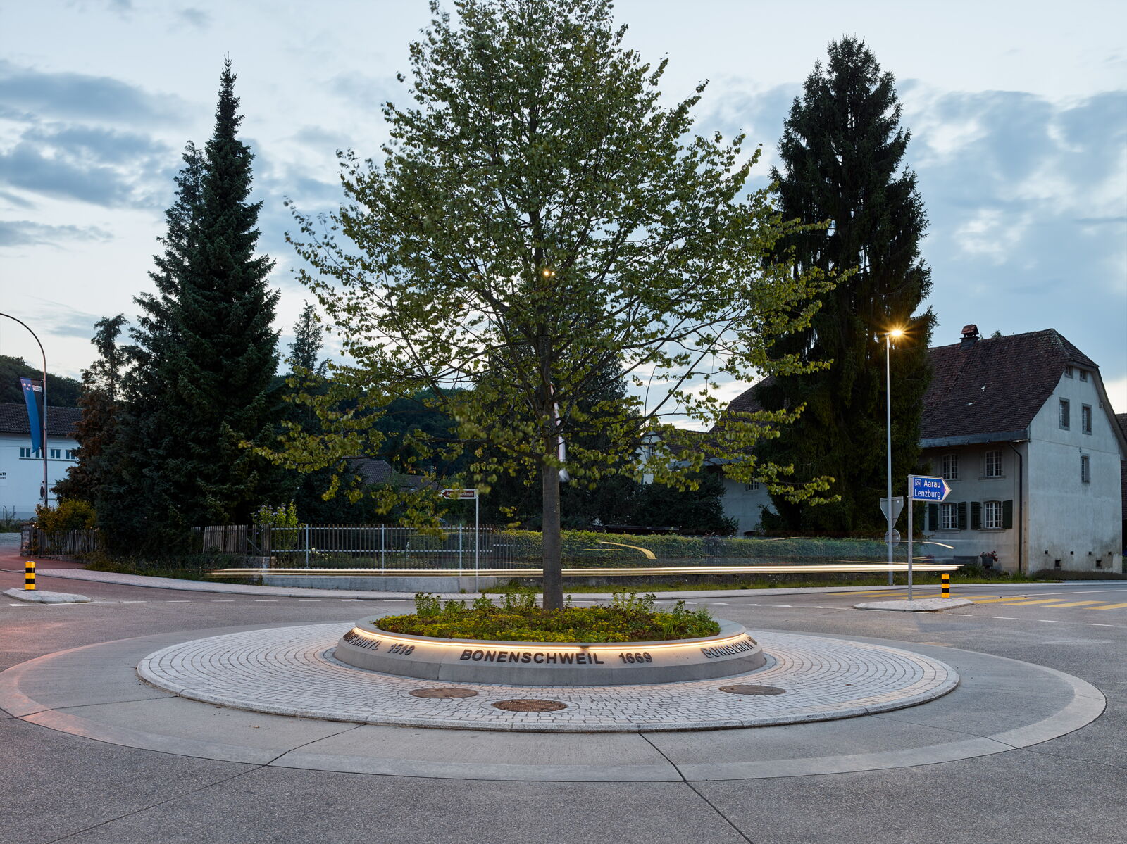 Das prägendes Element, der Baum (Winterlinde) im Strassenraum, hat neben der Wirkung auf die Verkehrsteilnehmer auch identitätsstiftenden Charakter und kammert die Räume, in deren Zentrum sich der Kreisverkehr befindet. Die historischen Ortsnamen, welche in bronzierten Buchstaben auf dem kreisrunden Betonelement angebracht sind, unterstützen die Verortung und komplettieren zusammen mit der Beleuchtung das gestalterische Konzept des Kreisverkehrs.
