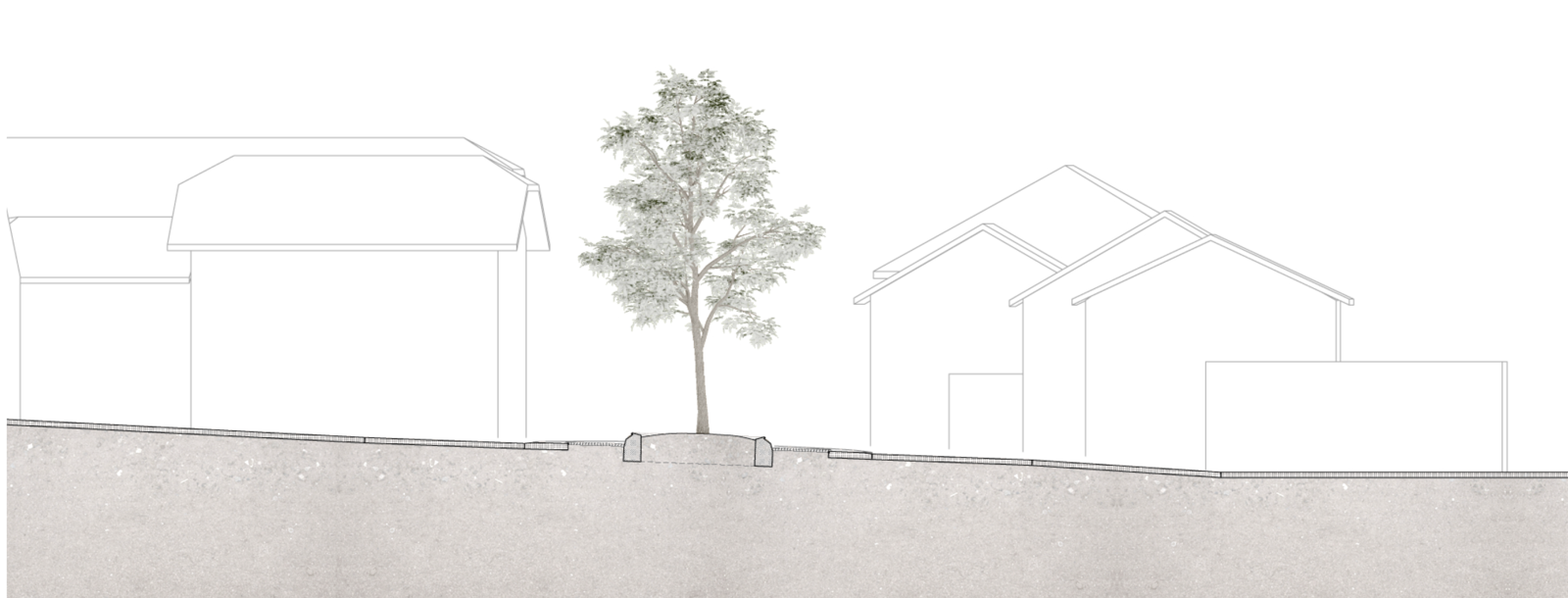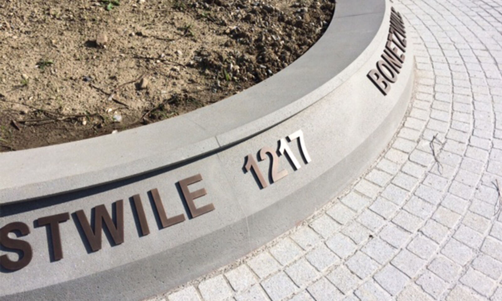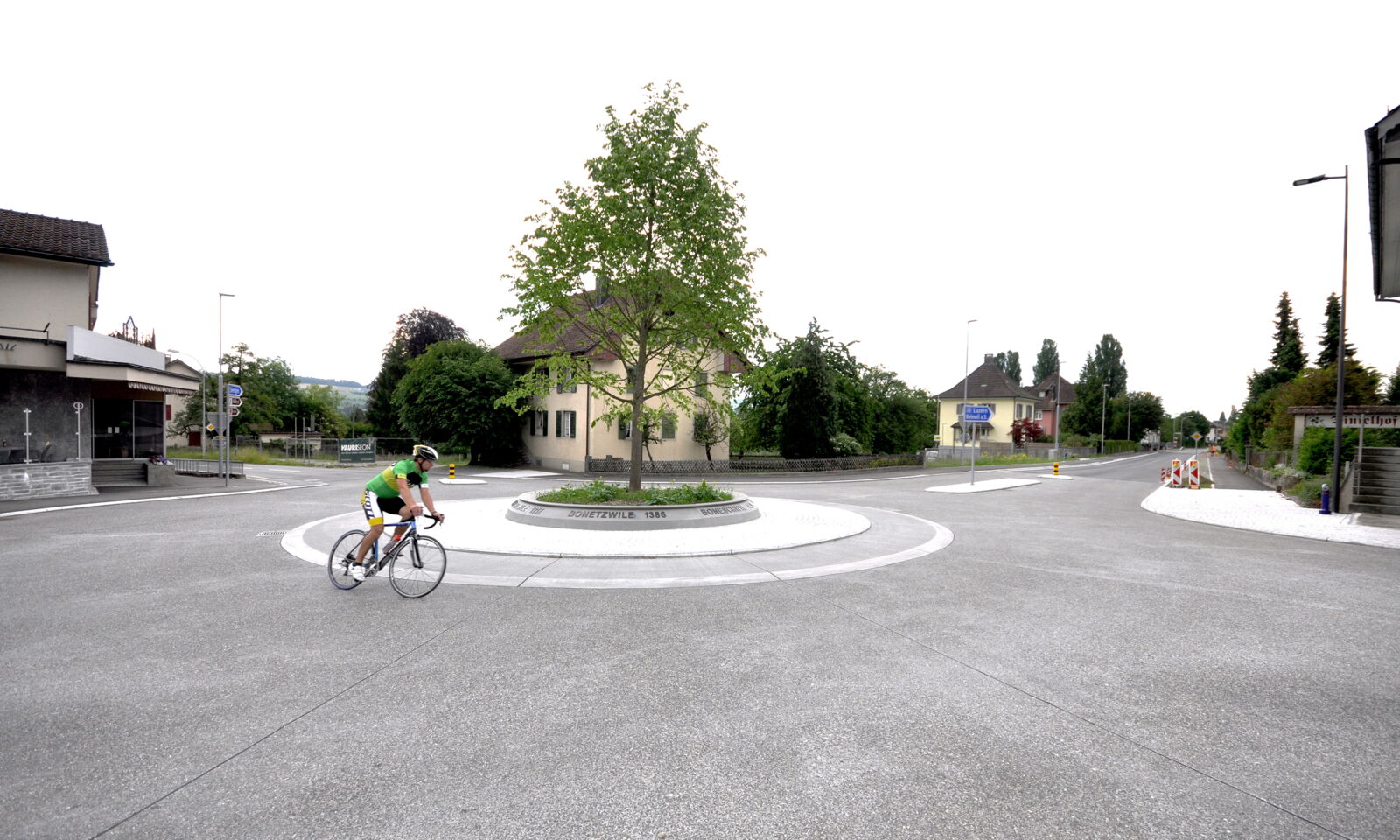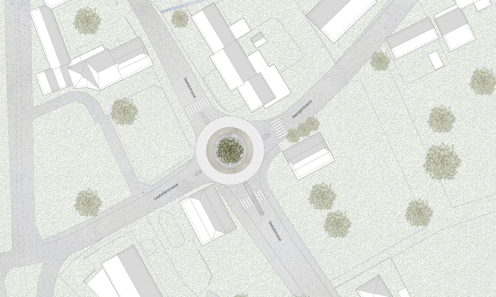 Das prägendes Element, der Baum (Winterlinde) im Strassenraum, hat neben der Wirkung auf die Verkehrsteilnehmer auch identitätsstiftenden Charakter und kammert die Räume, in deren Zentrum sich der Kreisverkehr befindet. Die historischen Ortsnamen, welche in bronzierten Buchstaben auf dem kreisrunden Betonelement angebracht sind, unterstützen die Verortung und komplettieren zusammen mit der Beleuchtung das gestalterische Konzept des Kreisverkehrs.