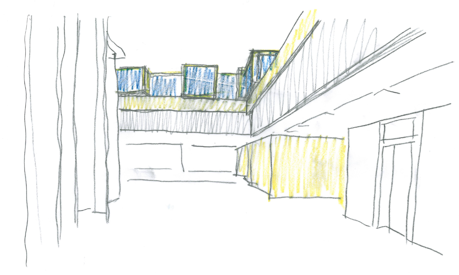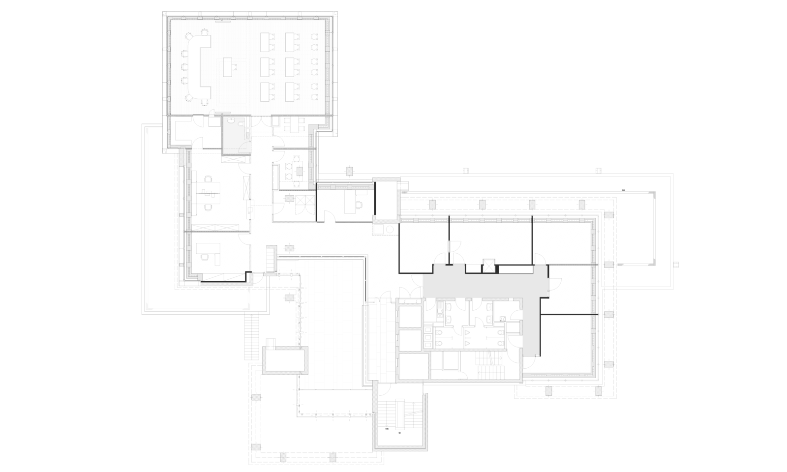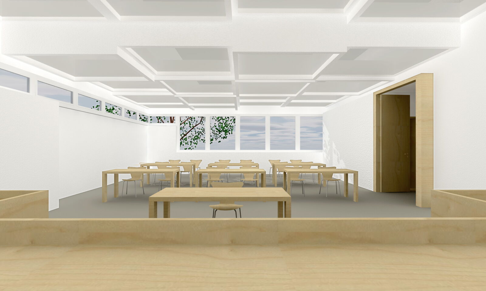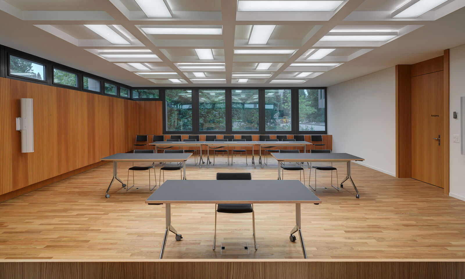 Der östliche Sockelbau, das einstige Rechenzentrum, wird zum neuen Verhandlungssaal des Verwaltungsgerichtes. Materialisierung und Farbigkeit haben wir aus dem Kanon des Bestandes entwickelt. Die Aufgabe bestand darin, Gericht und Saal einen, der Nutzung entsprechenden, Auftritt mit adäquater Atmosphäre zu verleihen.
