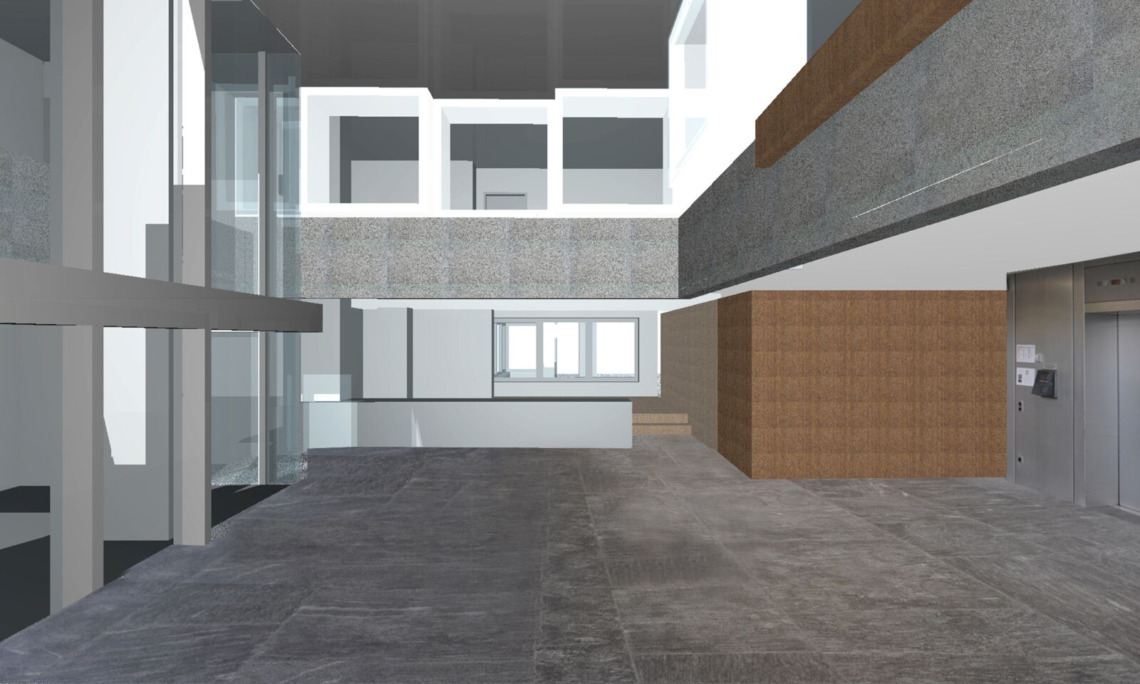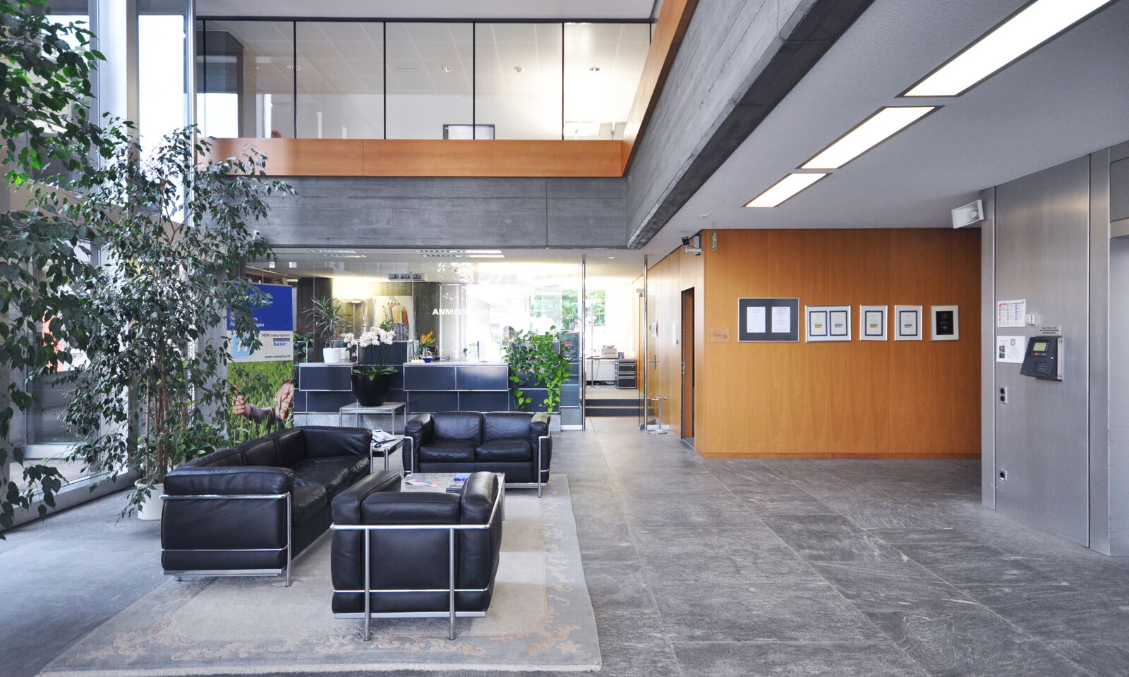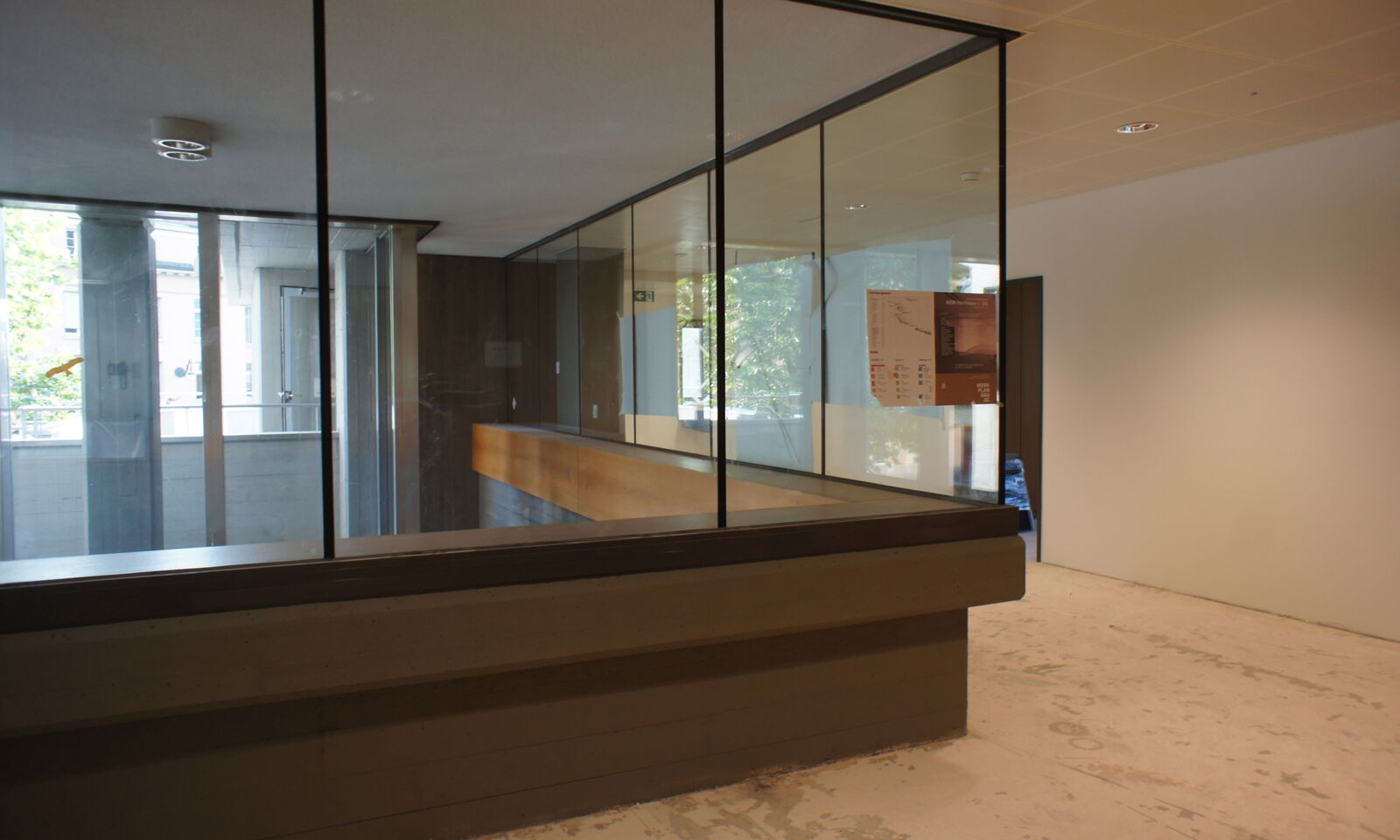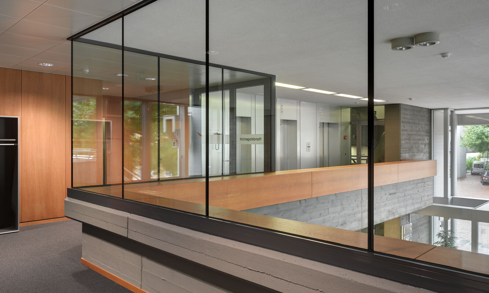 Aus Sicherheits- und Diskretionsgründen wurde das vom Haupteingang des Hochhauses her einsichtige Foyer im 1. Obergeschoss mit einem Stahl-Glas-Abschluss versehen.