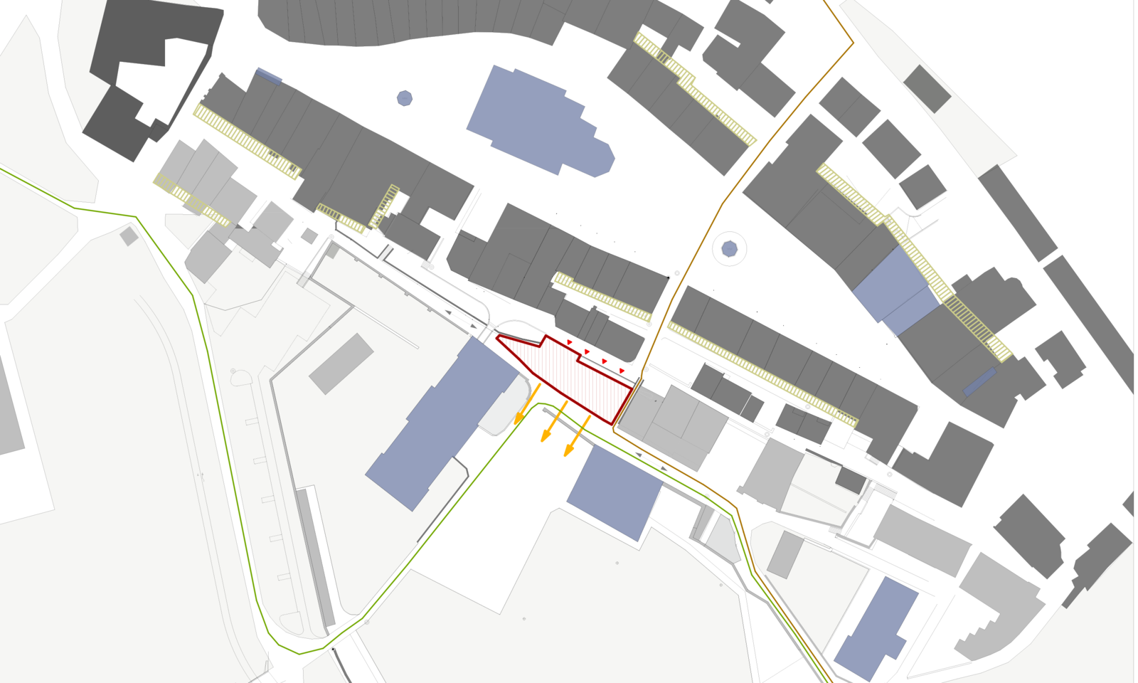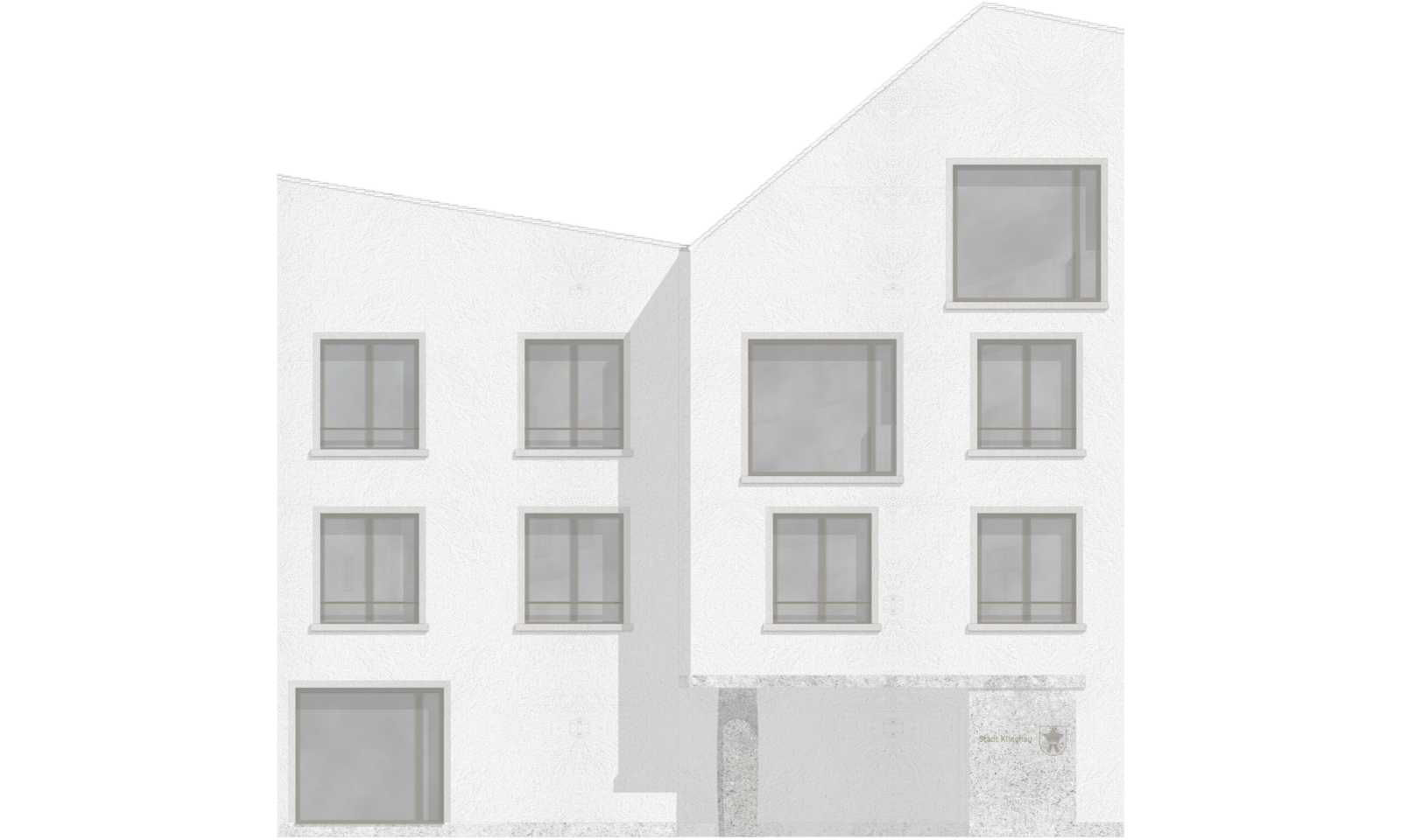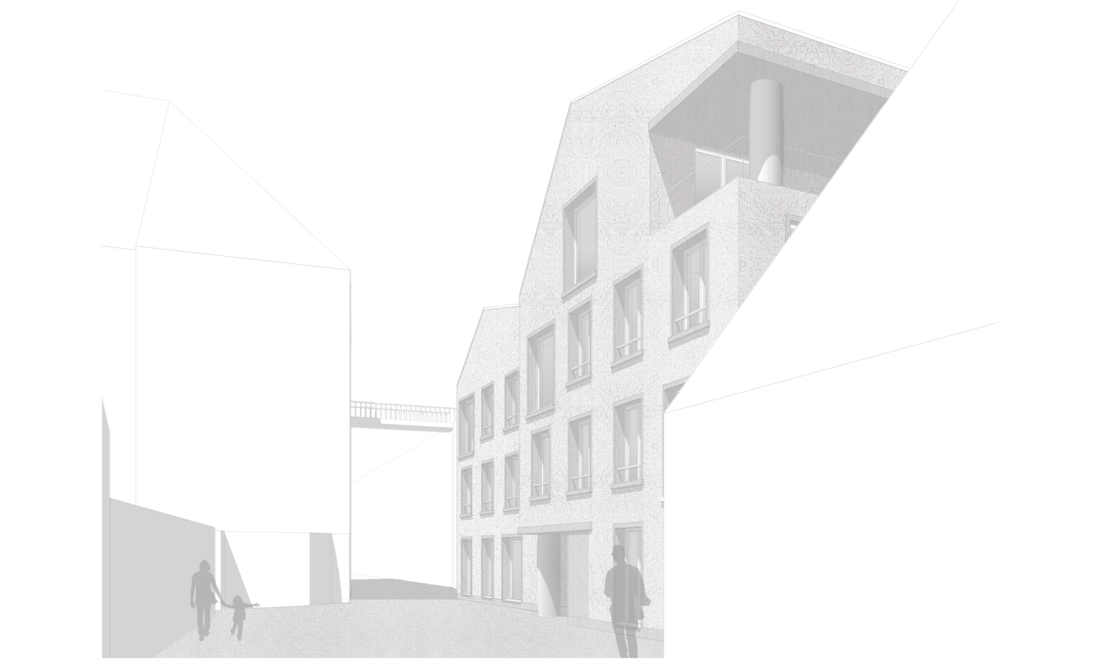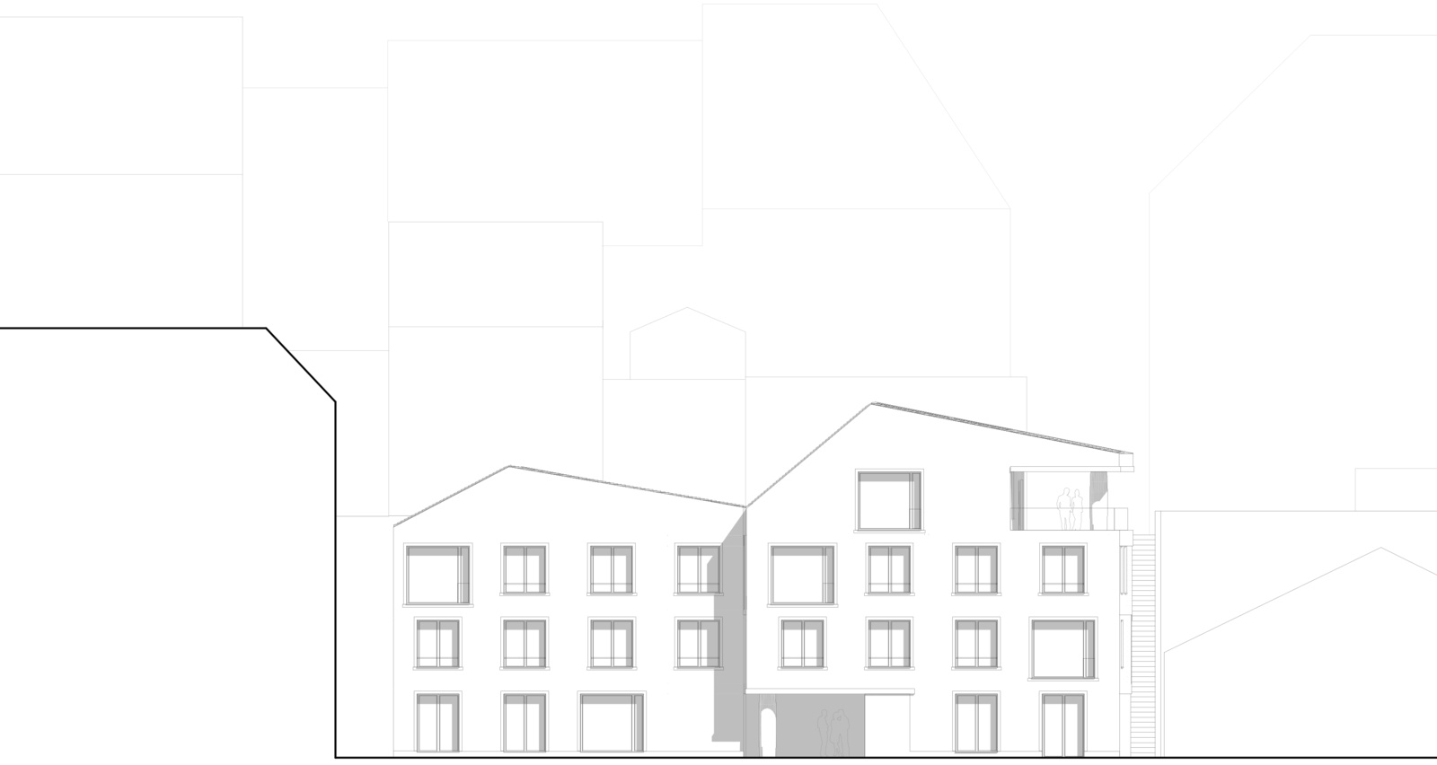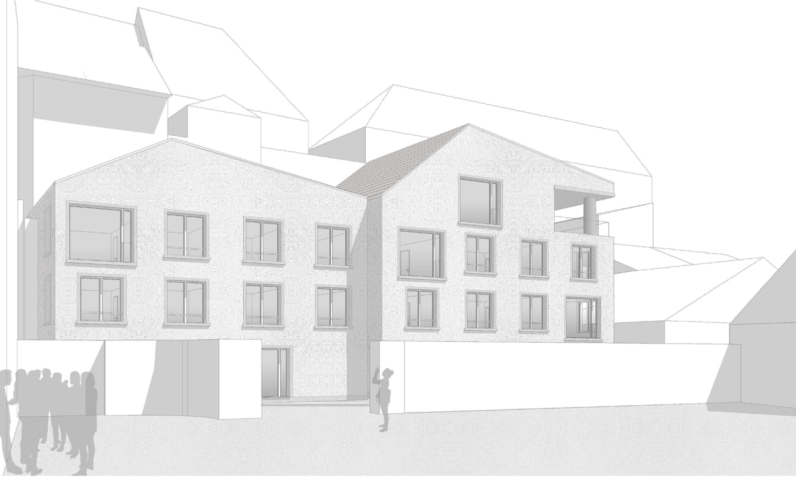 Die «zwei neuen Häuser» sind «ein Haus». Die vorgeschlagene Setzung nimmt Bezug auf die ursprüngliche Bebauung. Die längsrechteckige Proportion des Grundstückes unterstützt eine Lösung mit zwei Giebeln. Zum einen entstehen so attraktive, traufständige Gebäude zur Unterstadtgasse und zum anderen bleiben aber First und Traufe in einem verträglichen Mass bezüglich Altstadt und Propstei. In Grundriss und Höhe gegliedert verschmelzen die beiden Volumina aber letztlich zu einem Gebäude. Das optimiert die Nutzungsmöglichkeiten und die Erschliessung, nicht zuletzt ist es auch Merkmal einer Bebauung aus einem Guss und in einer Etappe. Das zweiteilige Schrägdach bindet sich «niedrig» in die Silhouette entlang der Stadtmauer ein. Der östliche Ausschnitt markiert den Zugang zum Gebäude und dient als Aussichtsterrasse.