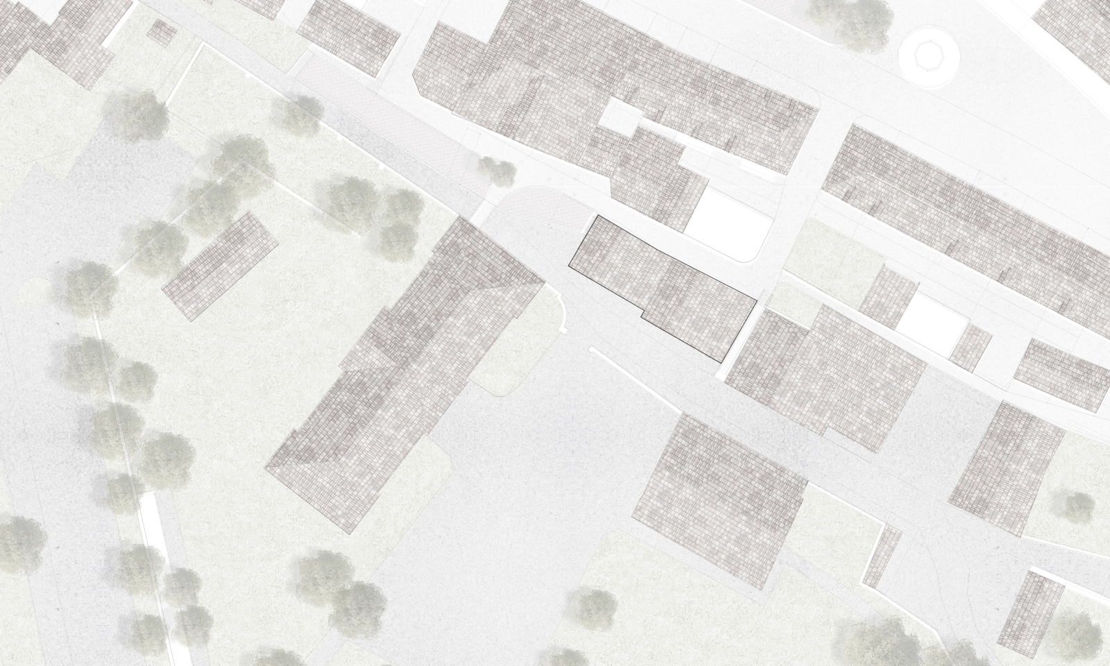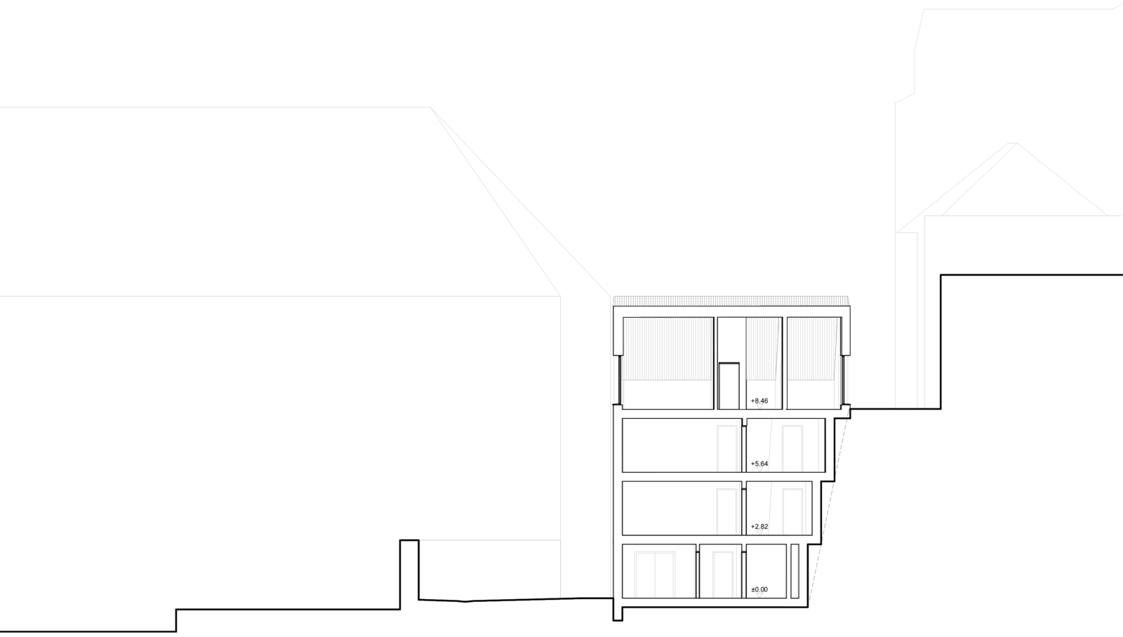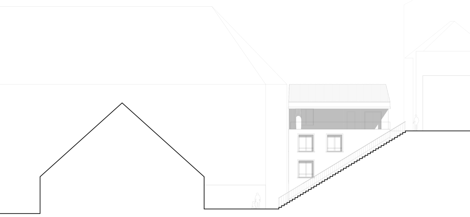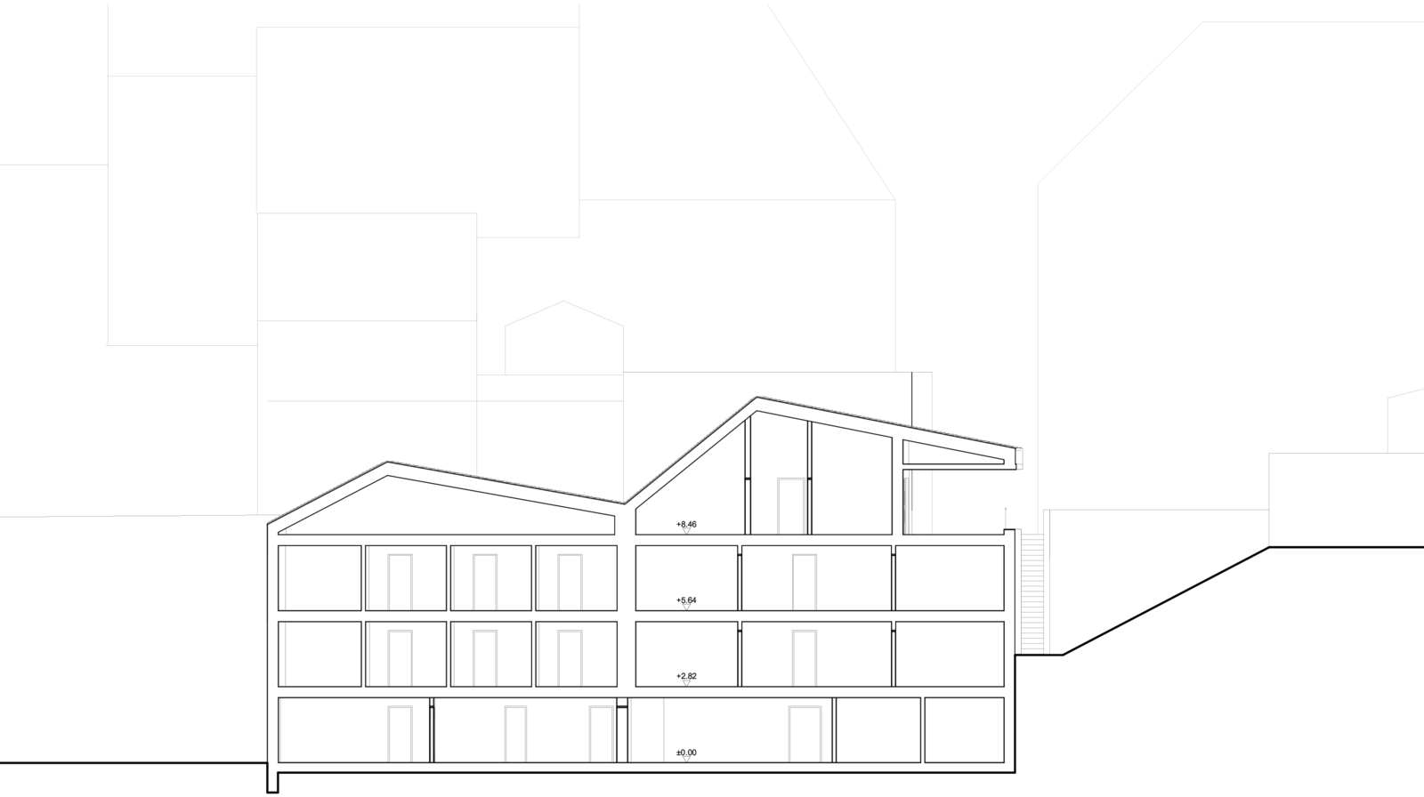 Die «zwei neuen Häuser» sind «ein Haus». Die vorgeschlagene Setzung nimmt Bezug auf die ursprüngliche Bebauung. Die längsrechteckige Proportion des Grundstückes unterstützt eine Lösung mit zwei Giebeln. Zum einen entstehen so attraktive, traufständige Gebäude zur Unterstadtgasse und zum anderen bleiben aber First und Traufe in einem verträglichen Mass bezüglich Altstadt und Propstei. In Grundriss und Höhe gegliedert verschmelzen die beiden Volumina aber letztlich zu einem Gebäude. Das optimiert die Nutzungsmöglichkeiten und die Erschliessung, nicht zuletzt ist es auch Merkmal einer Bebauung aus einem Guss und in einer Etappe. Das zweiteilige Schrägdach bindet sich «niedrig» in die Silhouette entlang der Stadtmauer ein. Der östliche Ausschnitt markiert den Zugang zum Gebäude und dient als Aussichtsterrasse.