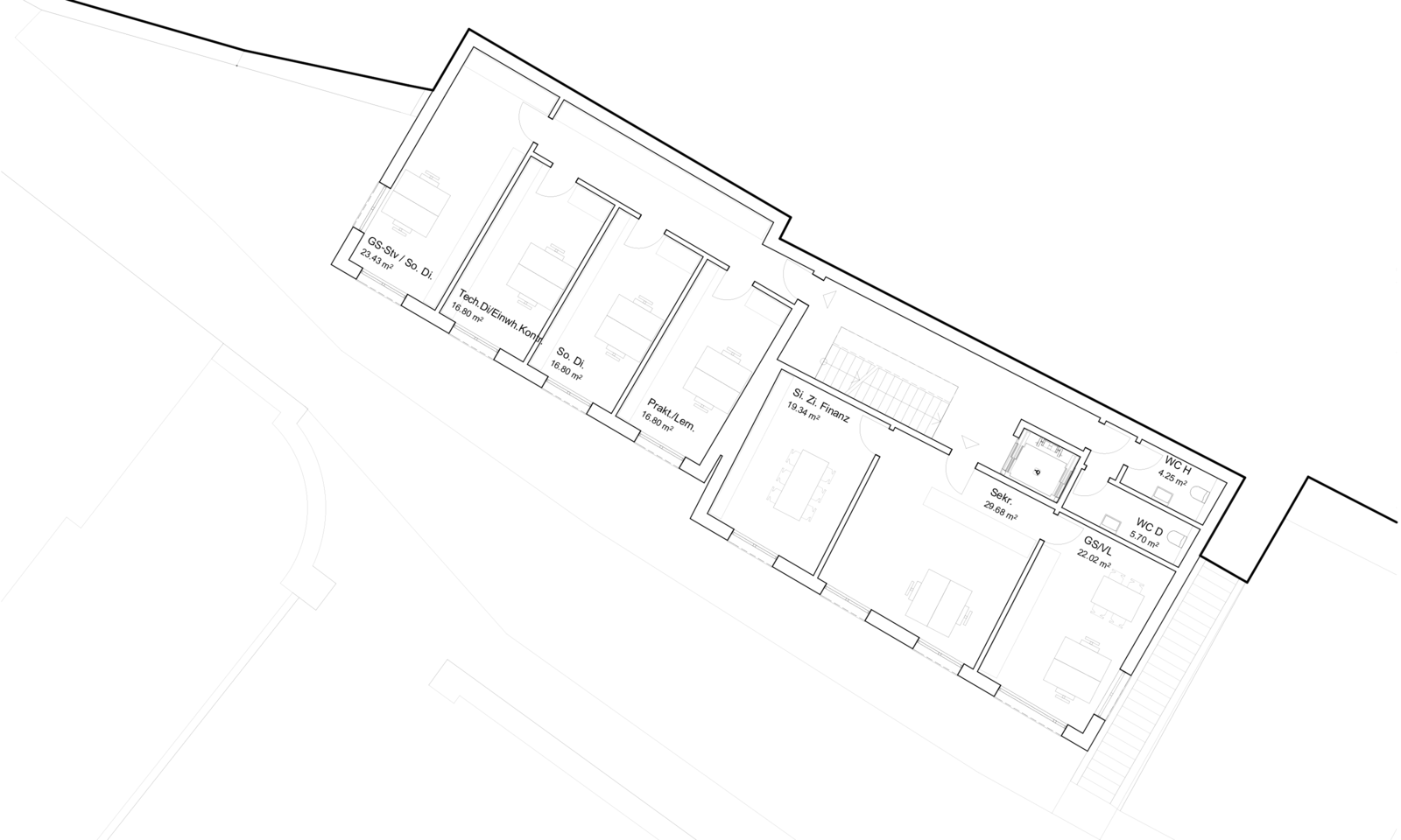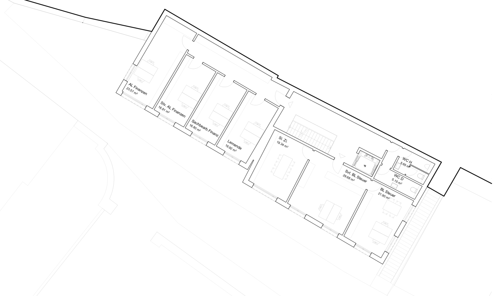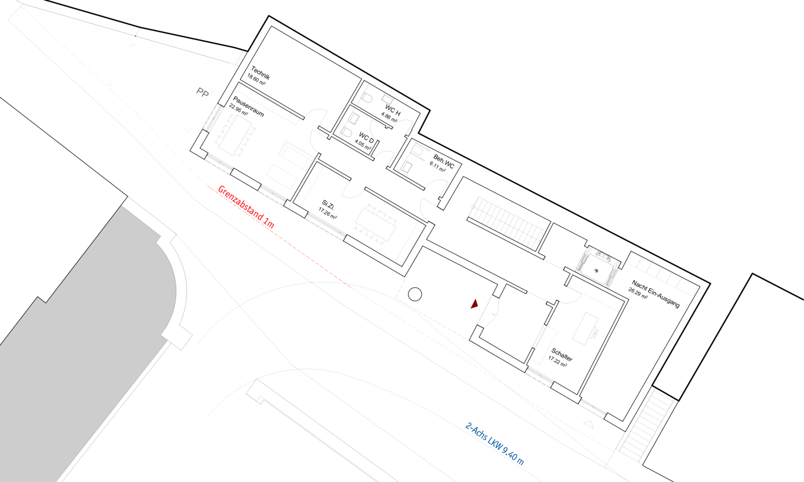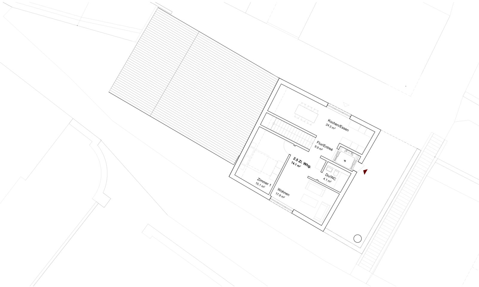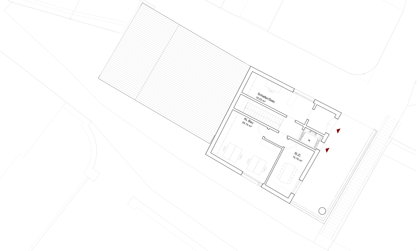 Die «zwei neuen Häuser» sind «ein Haus». Die vorgeschlagene Setzung nimmt Bezug auf die ursprüngliche Bebauung. Die längsrechteckige Proportion des Grundstückes unterstützt eine Lösung mit zwei Giebeln. Zum einen entstehen so attraktive, traufständige Gebäude zur Unterstadtgasse und zum anderen bleiben aber First und Traufe in einem verträglichen Mass bezüglich Altstadt und Propstei. In Grundriss und Höhe gegliedert verschmelzen die beiden Volumina aber letztlich zu einem Gebäude. Das optimiert die Nutzungsmöglichkeiten und die Erschliessung, nicht zuletzt ist es auch Merkmal einer Bebauung aus einem Guss und in einer Etappe. Das zweiteilige Schrägdach bindet sich «niedrig» in die Silhouette entlang der Stadtmauer ein. Der östliche Ausschnitt markiert den Zugang zum Gebäude und dient als Aussichtsterrasse.