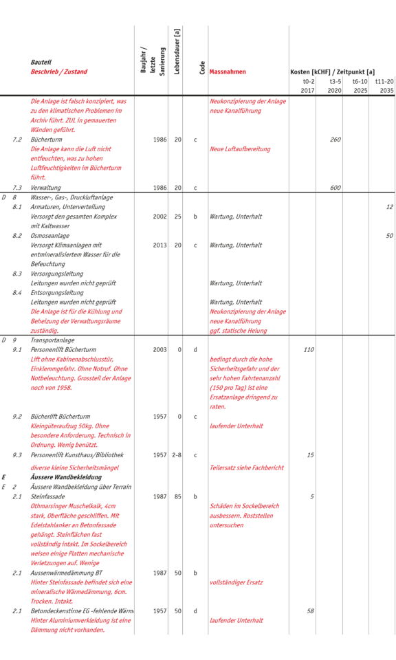 Zur Bewertung von Gebäuden haben wir - angelehnt an CRB/LCC-Methoden - ein Analysetool entwickelt. Die Bewertung des einzelnen Zustandes erfolgt in Ähnlichkeit zur erprobten Codierung der IP Bau.