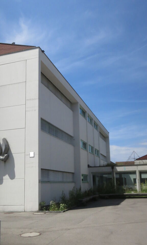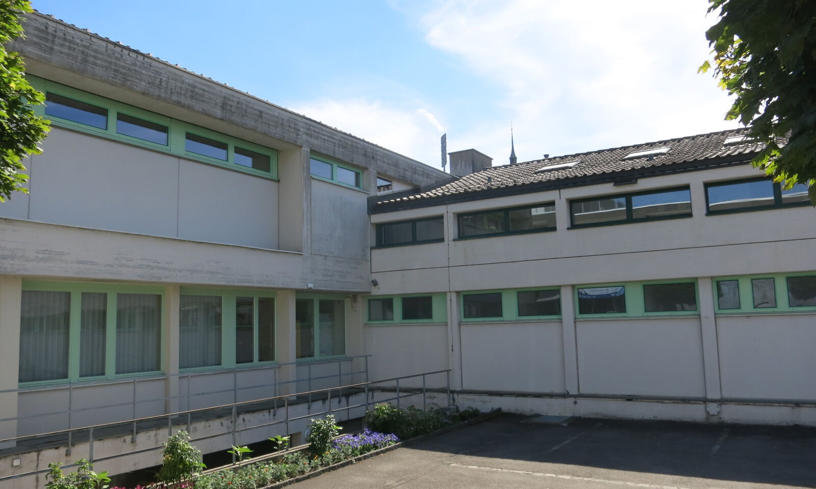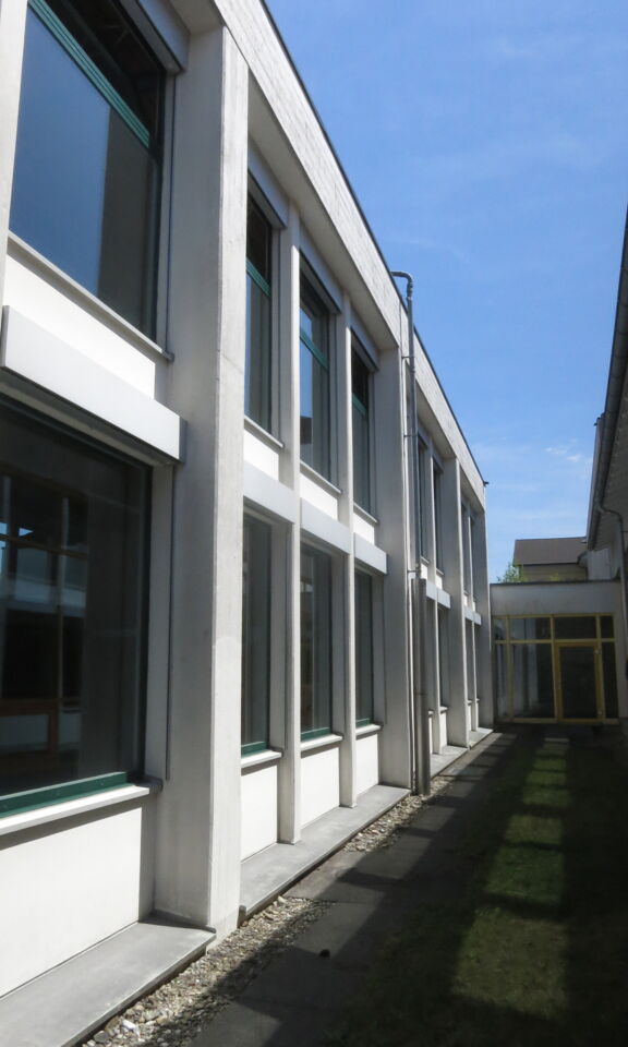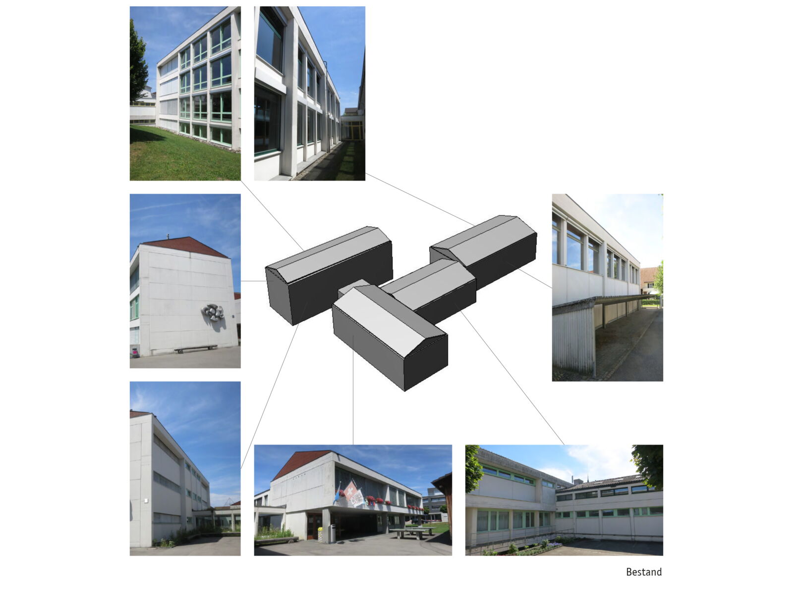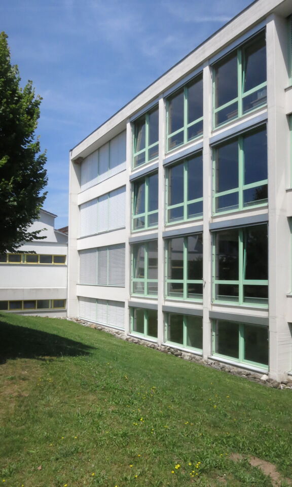 Das Gebäude von 1966 verfügt aktuell über ausreichend Schulraum. Die später hinzugefügte Aufstockung ist aufgrund des Steildachs mit seiner niedrigen Raumhöhe für den Schulbetrieb unvorteilhaft. Die bestehende Betonfassade ist aus unserer Sicht erhaltenswert und sollte daher nur saniert werden.