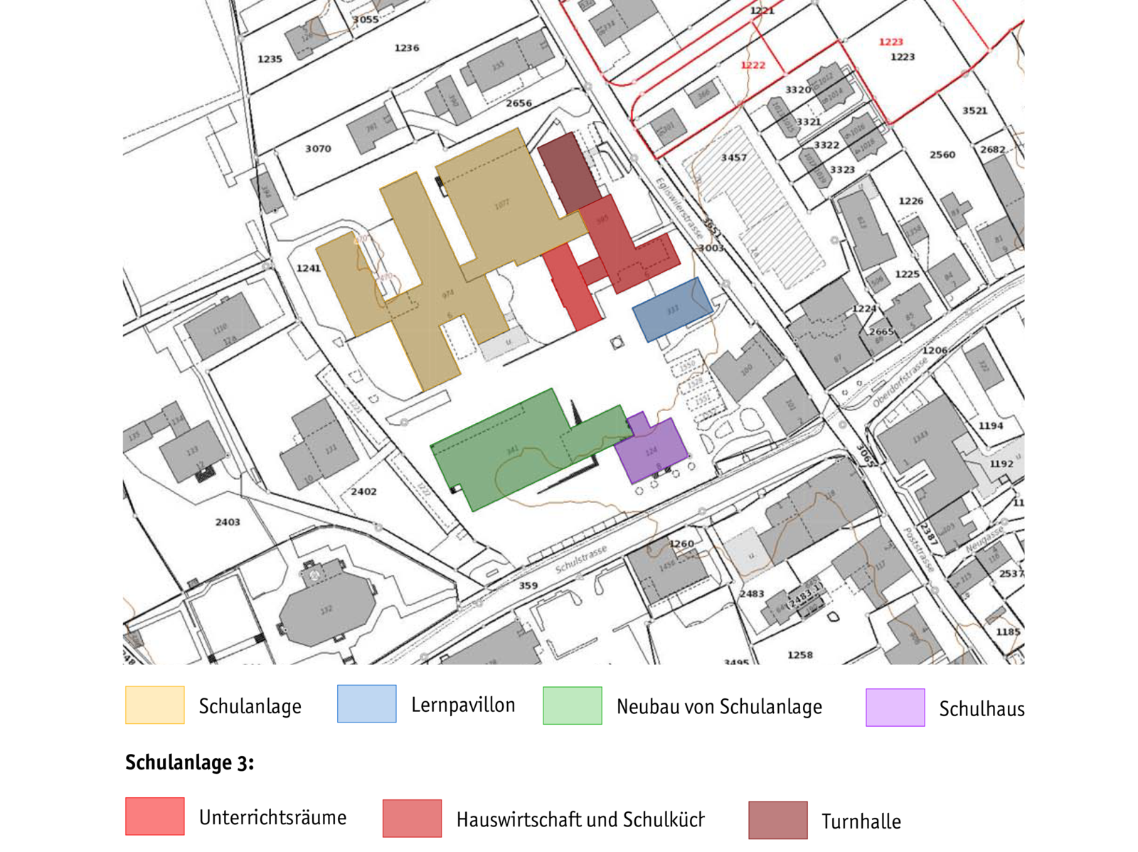 Das Schulhaus 3 steht vor der Sanierung der Gebäudehülle. Die Gebäude sind klimatisch in einem schlechten Zustand, zudem sind die Dächer der Gebäude undicht. Die Innenräume wurden laufend unterhalten. Die Haustechnik ist teilweise erneuert, respektive steht im Verbund mit den anderen Schulhäusern.