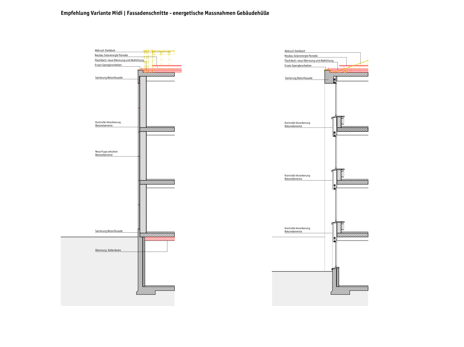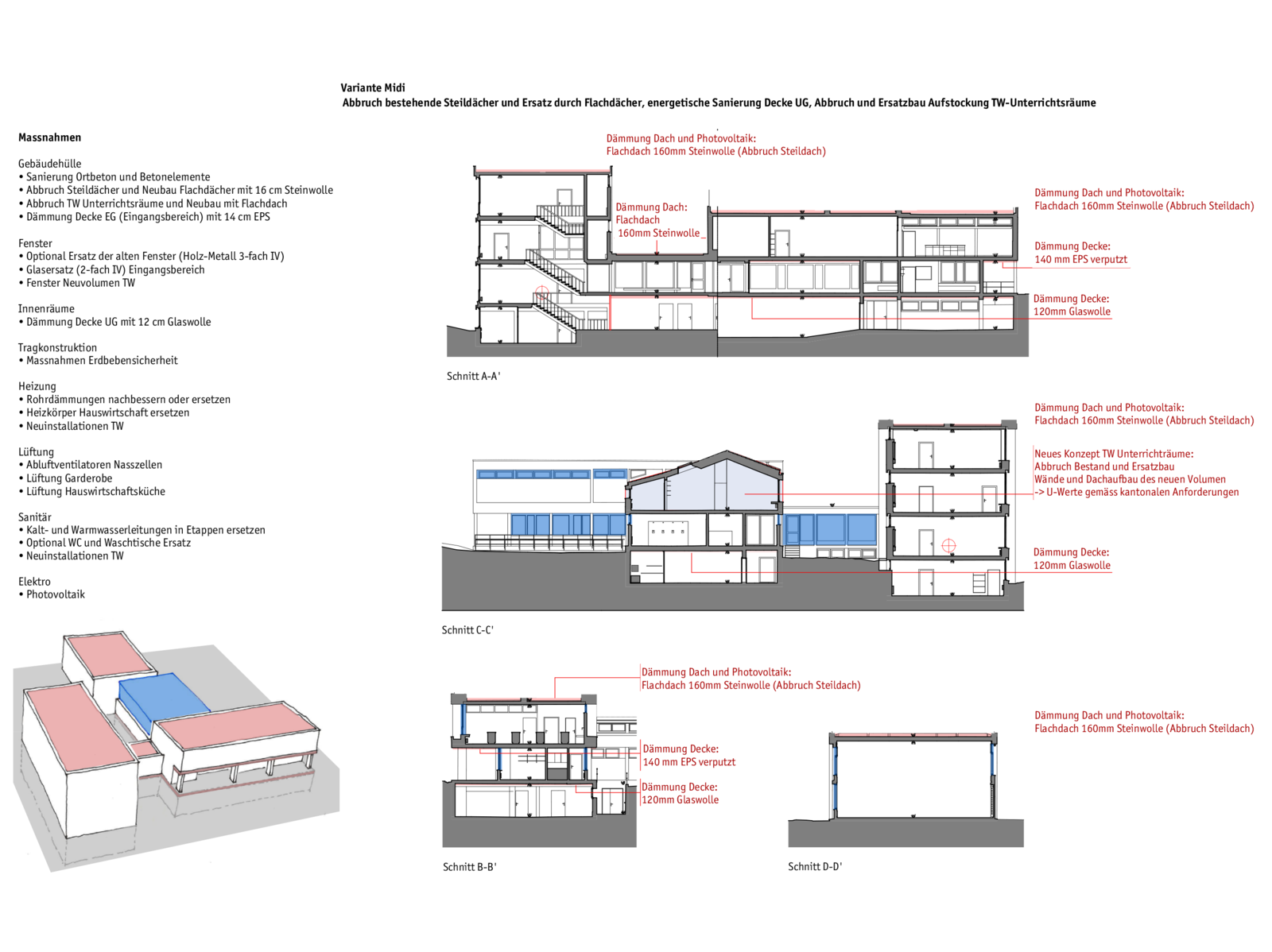 Nachfolgend wurden im Team Lösungsvarianten erarbeitet. Faktoren, wie Machbarkeit, Kosten und architektonische Belange wurden in die weiteren Abwägungen mit einbezogen. Aus diesem Grund schlagen wir statt einer kostenintensiven Sanierung der Steildächer den Abbruch mit Ersatz durch Flachdächer vor, was im Übrigen auch den ersten Entwürfen des Schulhauses entspricht. Im Bereich des späteren Erweiterungsbaus wäre ein Komplettersatz des Steildachs mittels Zusatzgeschoss in Holzbauweise denkbar.