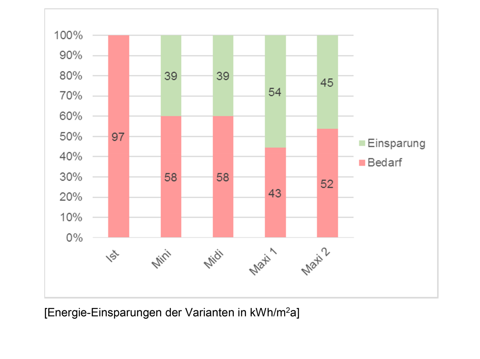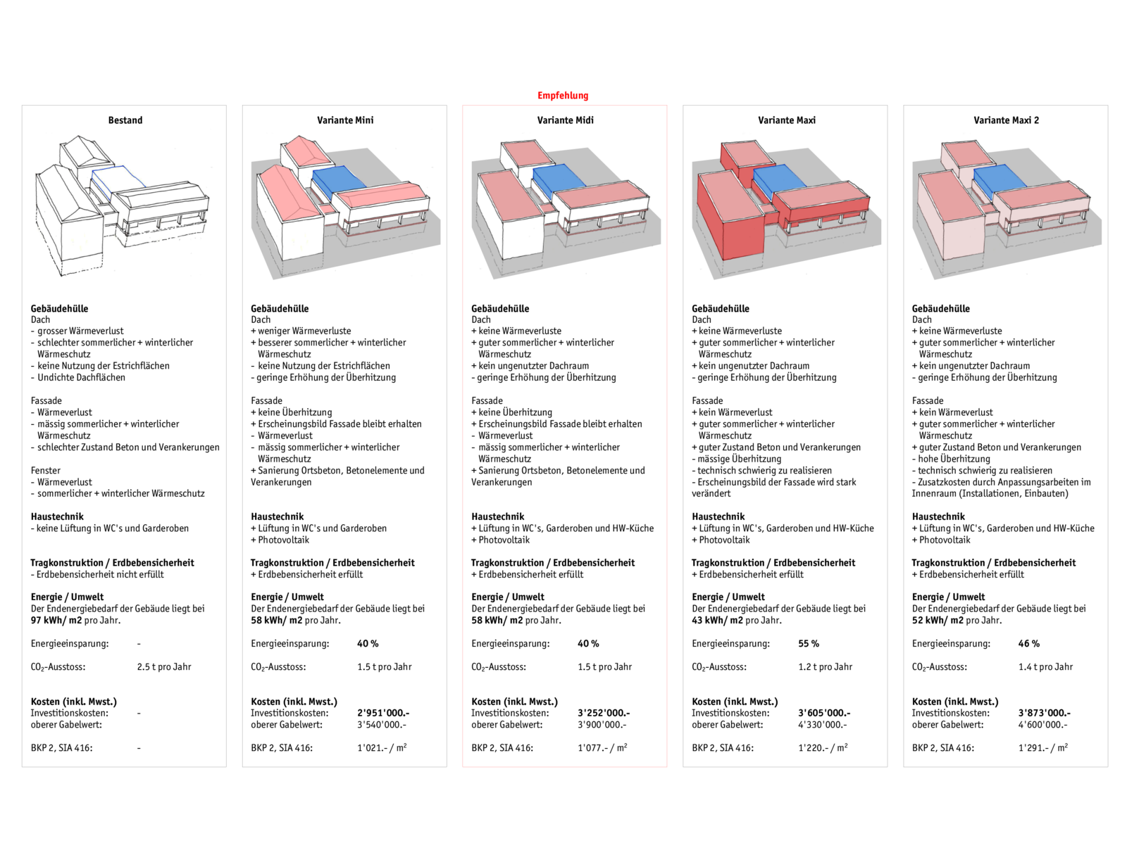 Die energetischen Massnahmen können über Erneuerungen der Haustechnik, Dachsanierung sowie teilweiser Dämmung der Kellerdecken erreicht werden. Die erfolgten Untersuchungen haben gezeigt, dass Nachrüstungen vorgenommen werden können, ohne dass das Erscheinungsbild angetastet werden muss.