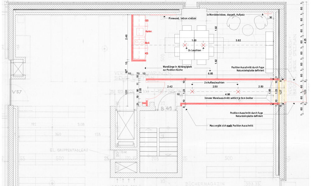Auslöser für die baulichen Massnahmen war eine vorangegangene Bauwerksanalyse, die unter anderem gezeigt hatte, dass die gegebene Fluchtweg- und teilweise Arbeitsplatzsituation nicht zulässig ist. Daraufhin wurde, in Abstimmung mit verschiedenen Behörden, im Erdgeschoss des Magazinturmes ein zusätzlicher Fluchtwegausgang geplant und ausgeführt. Im gleichen Zusammenhang wurde die bis dato unbefriedigende Pausensituation der Mitarbeiter stark verbessert, indem der Pausenbereich neu definiert wurde. Der Einbau einer Küche, ein neues Beleuchtungskonzept und neues Mobiliar tragen nun zu einer gelungenen Aufenthaltsqualität bei. Die geometrischen Gegebenheiten des orthogonalen Natursteinrasters, zusammen mit einer zweischaligen Betonkonstruktion mit innenliegenden Lüftungskanälen stellten in der Planung, wie auch in der Ausführung, eine spannende Herausforderung dar. Die Arbeiten konnten innerhalb eines sehr begrenzten Kostendaches und engem Terminprogrammes erfolgreich umgesetzt werden.