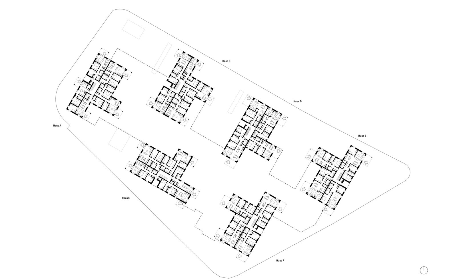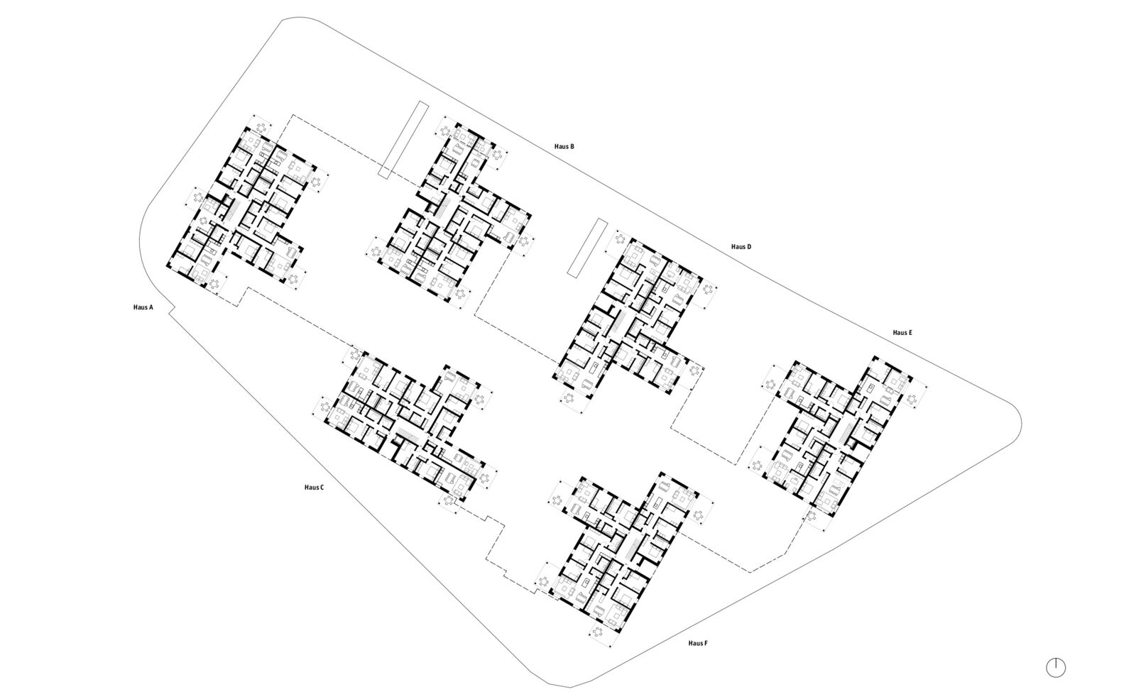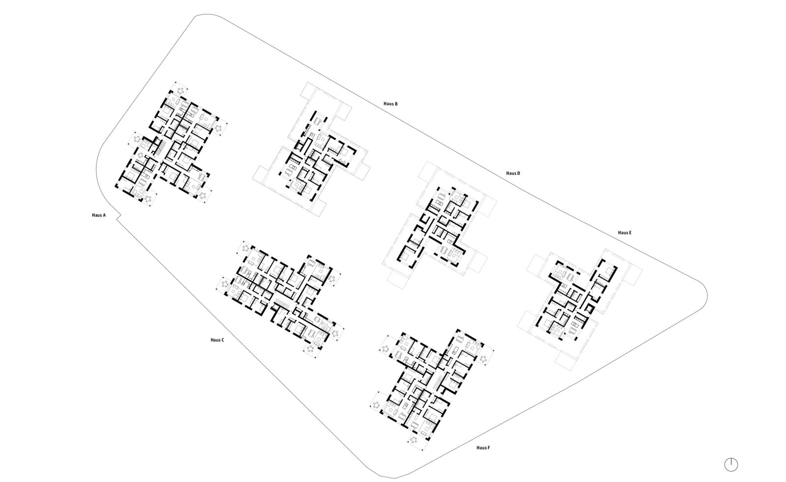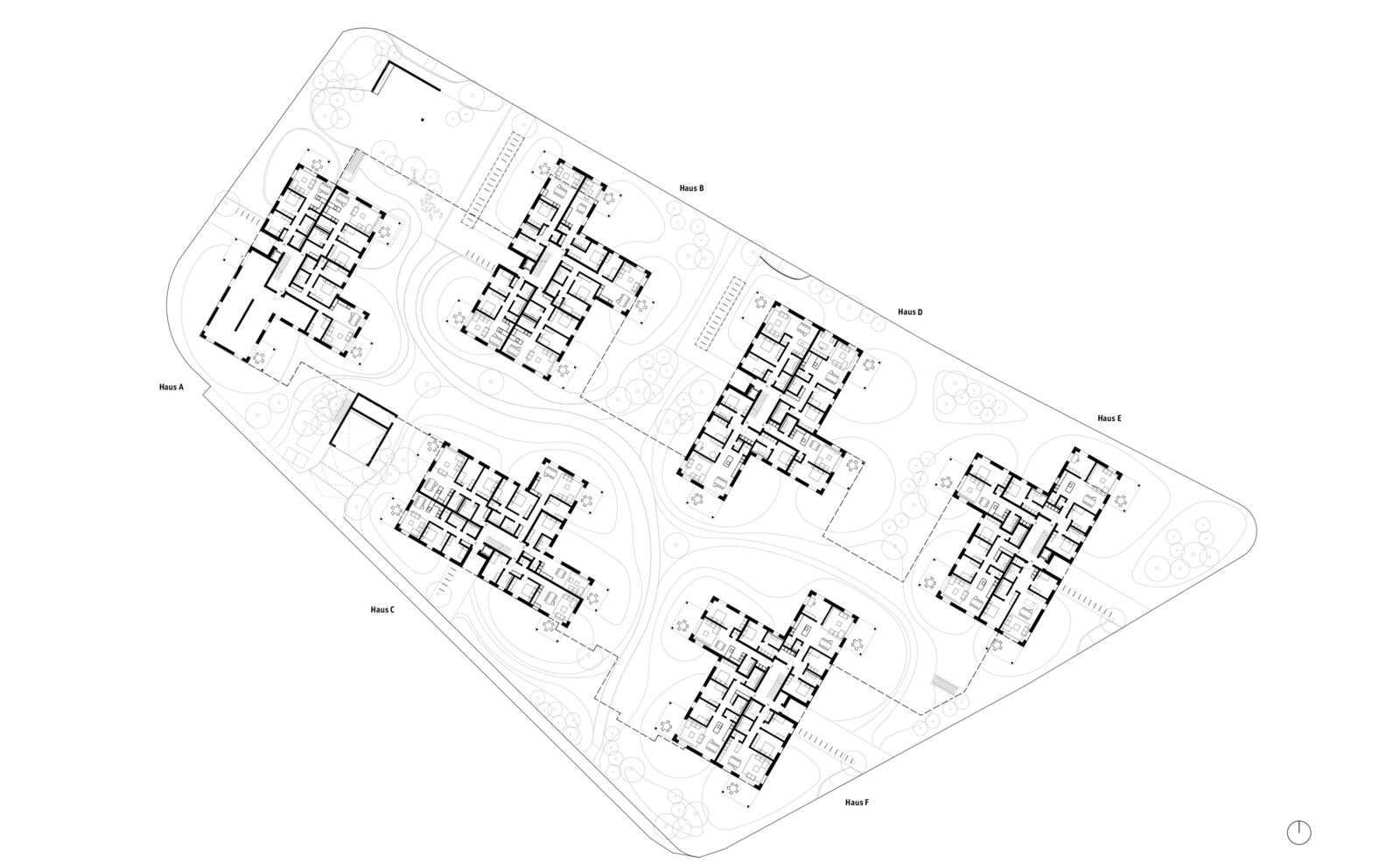 Das Spiel mit einheitlichen Körpern sorgt für eine hohe Identität. Die Übergänge an den Rändern werden mit differenzierten, grosszügigen Freiräumen umgesetzt. Eine freie Mitte bildet einen qualitativ hochwertigen, halböffentlichen Freiraum. Alle Gebäude sind von den Rändern her erschlossen. Die Haupterschliessung liegt an der Seite der grössten Lärmbelastung zur Industriezone hin.