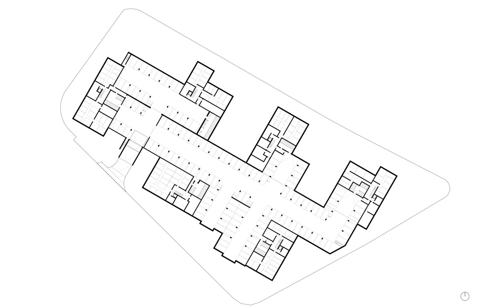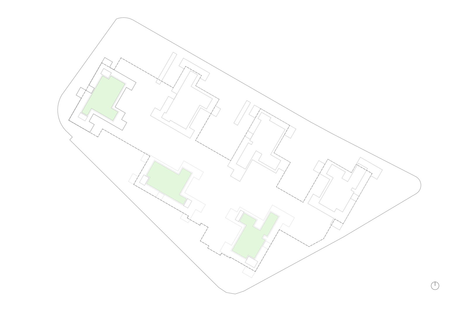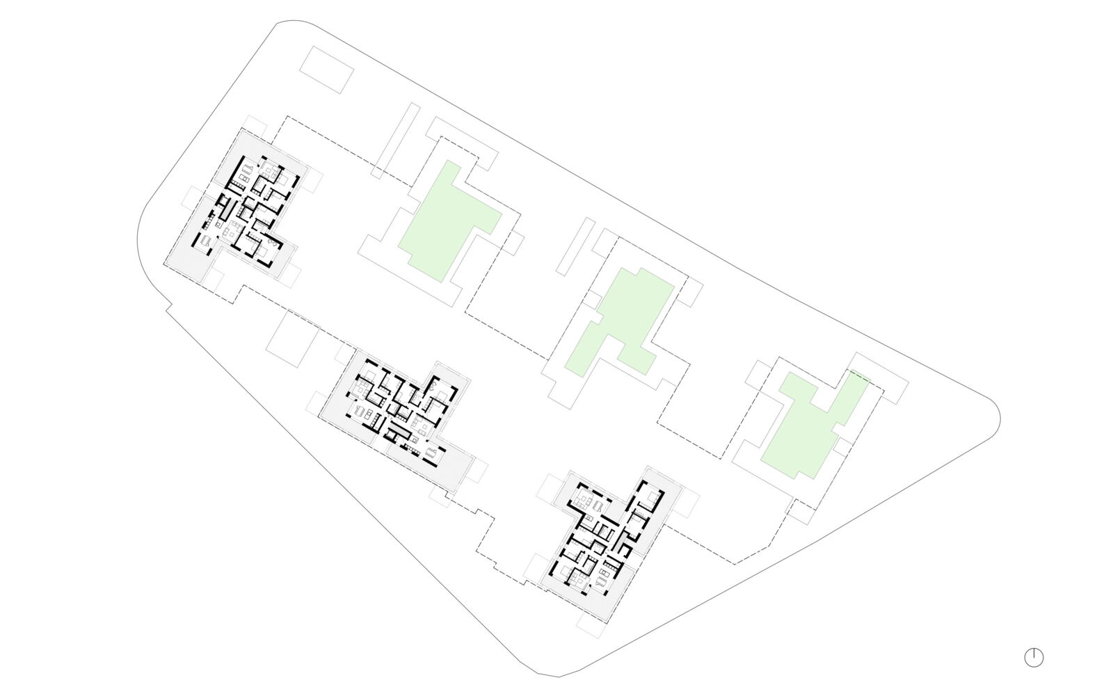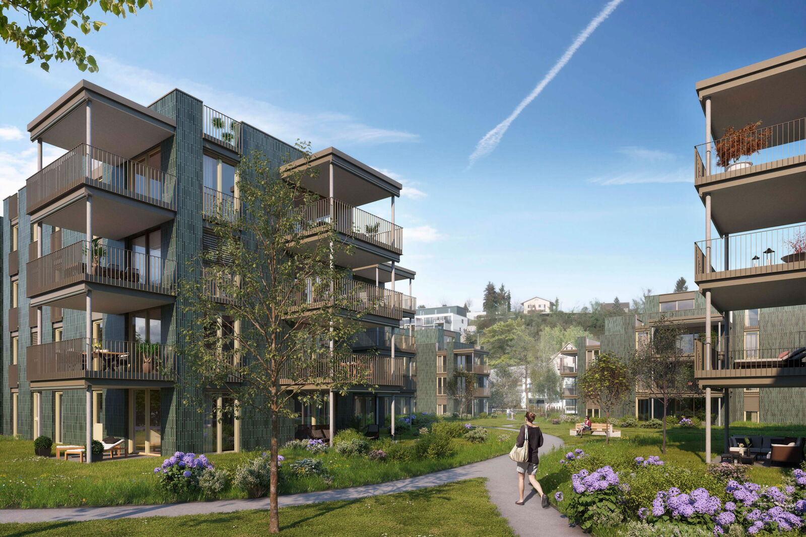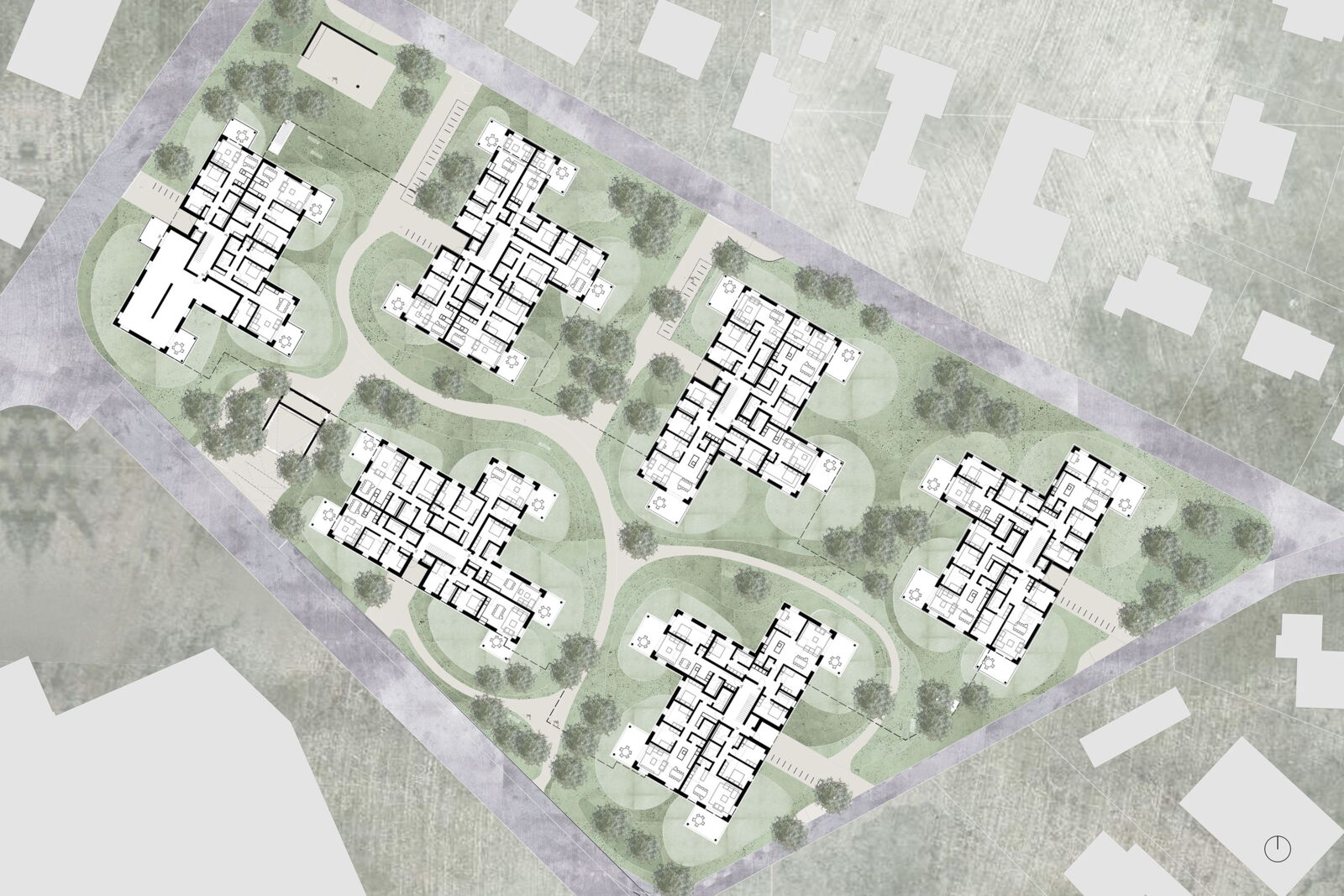 Das Spiel mit einheitlichen Körpern sorgt für eine hohe Identität. Die Übergänge an den Rändern werden mit differenzierten, grosszügigen Freiräumen umgesetzt. Eine freie Mitte bildet einen qualitativ hochwertigen, halböffentlichen Freiraum. Alle Gebäude sind von den Rändern her erschlossen. Die Haupterschliessung liegt an der Seite der grössten Lärmbelastung zur Industriezone hin.