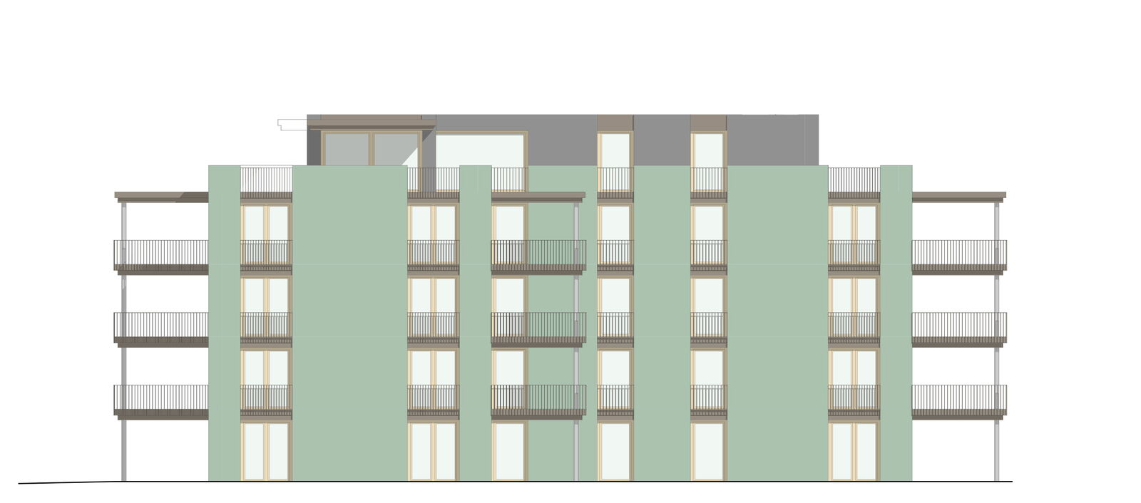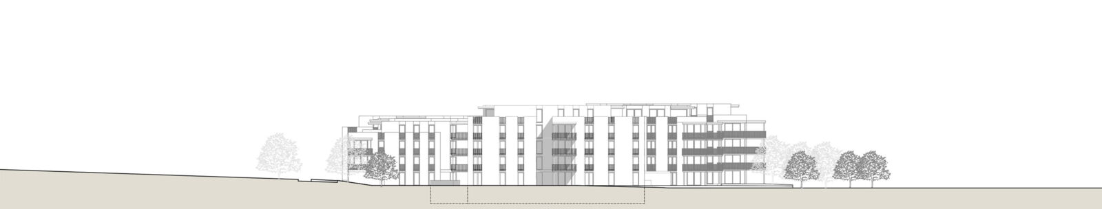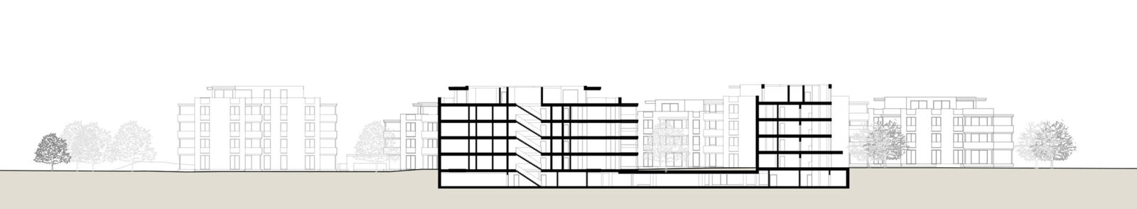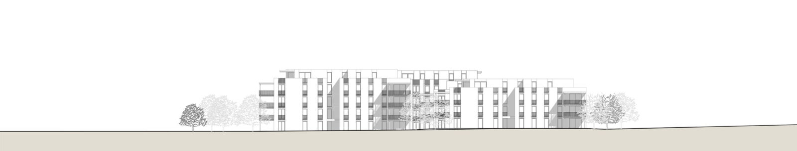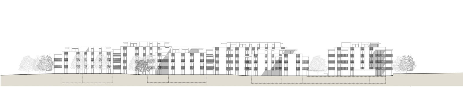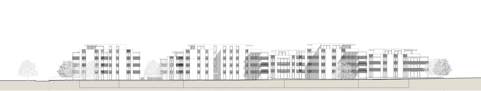 Eine abgetreppte und feingliedrige Ausbildung der Baukörper spiegelt die Körnung der gegenüberliegenden Wohnbauten. Sichtachsen sorgen für Durchlässigkeit. Vorgesetzte Balkonelemente verkleinern die Volumina und sorgen für «weiche» Kanten.