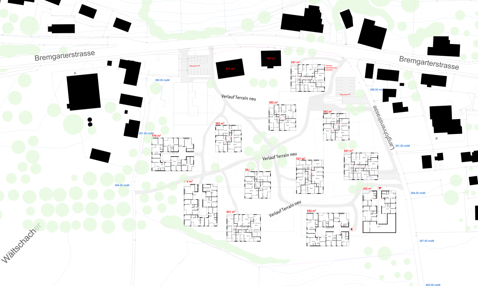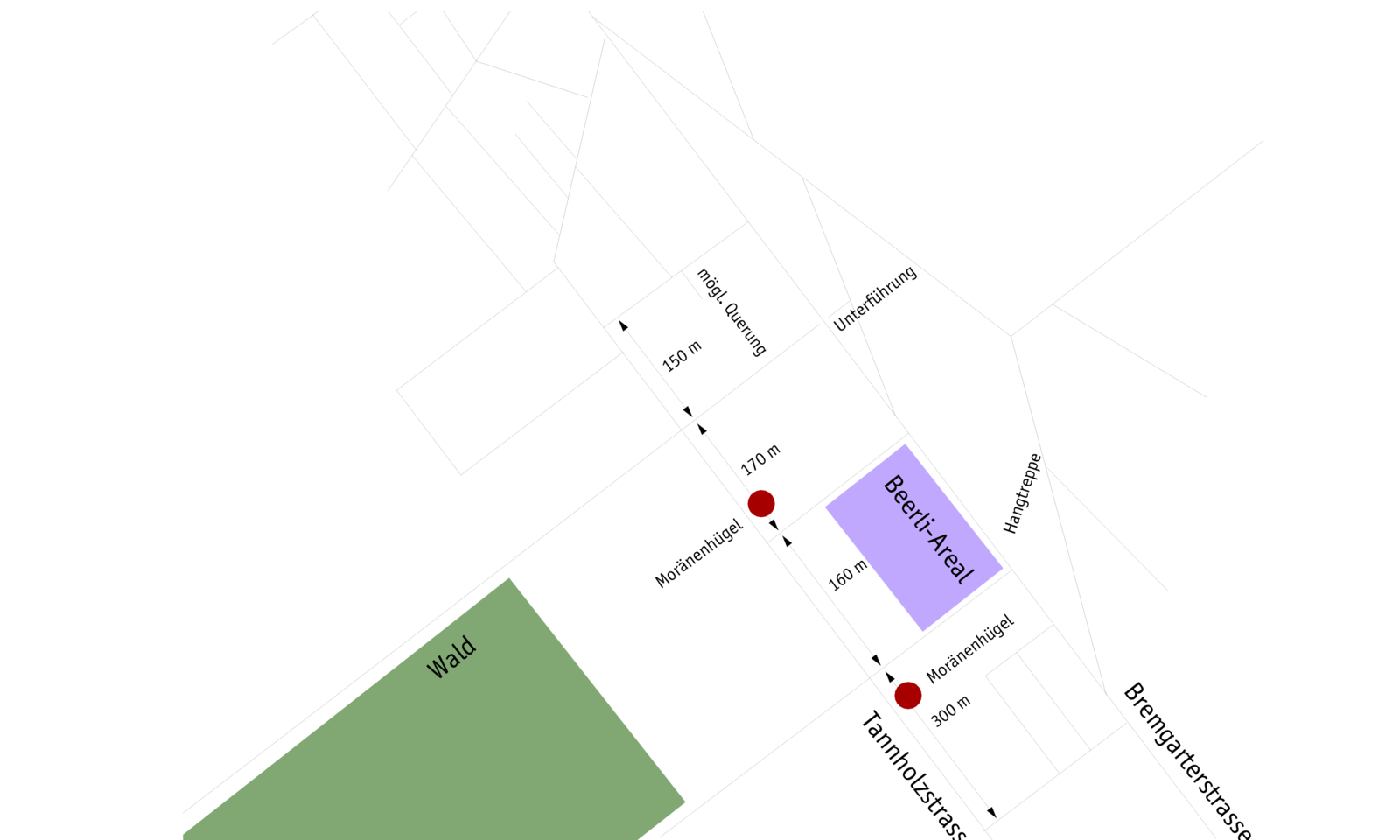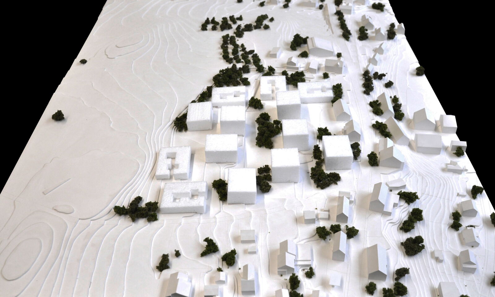 Bei der Testplanung geht es im Wesentlichen um die umfassende Analyse und Erfassung der Gesamtsituation betreffend bestehender Infrastruktur und die Erkundung von Nutzungsmöglichkeiten. Diese Planung untersucht den Ort auf seine Charakteristik und Eigenart hin und zeigt im Variantenstudium Entwicklungsstrategien auf: Das Grundstück grenzt an eine intakte Moränenlandschaft, liegt von der Hauptstrasse aus betrachtet zwischen zwei Moränenhügel und wird von einem Wanderweg tangiert. Die Liegenschaft liegt attraktiv zwischen zwei starken landschaftlichen Polen: Reussdelta und Drumlin-Topografie. Das Grundstück hat das Potenzial die beiden Dorfteile, trotz aussenräumlicher Zäsur, näher zu bringen. Es ist wichtig, dass hier keine neue einförmige Besiedlung entsteht, welche nur Siedlungs-Lücken schliesst. Die künftige Siedlung hat dank ihrer Grösse und der zusammenhängenden, neuen Zone, gute Voraussetzungen, um eine landschaftlich-subtile und dennoch aussenräumlich-prägnante Bebauung zu etablieren.