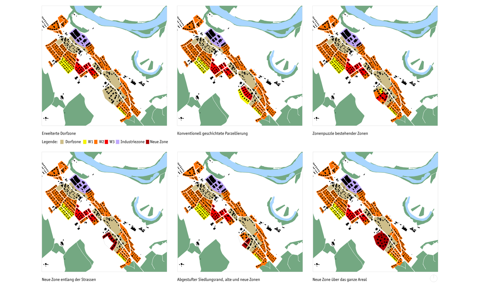 Als Resultat der Testplanung wird, aufgezeigt, dass eine neue Zone etabliert werden soll. Die Dorfzone hier zu übernehmen würde das Risiko einer Übernutzung (ca.45‘000m2 aGF) und einer einförmigen Bebauung bergen. In der Dorfzone sind 14 Meter hohe Gebäude möglich und die AZ ist unbeschränkt. Anhand der Testplanung wurde eine maximale Dichte (24‘000m² aGF) und Gebäudehöhe bis 18 Meter festgelegt. Um das Wettbewerbsresultat nicht vorwegzunehmen, lässt die neue Zone einen klaren Spielraum für die Anordnung der Voluminas.