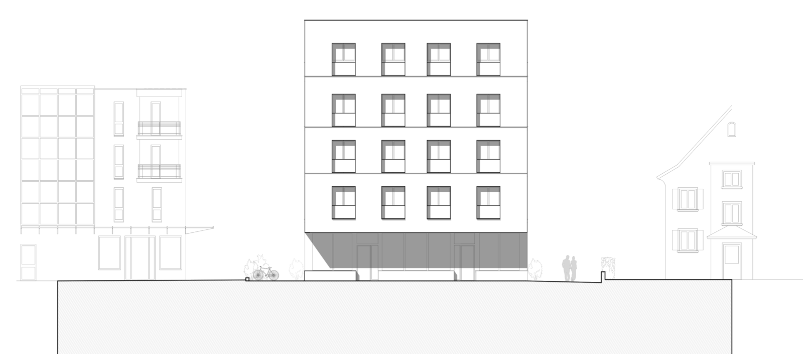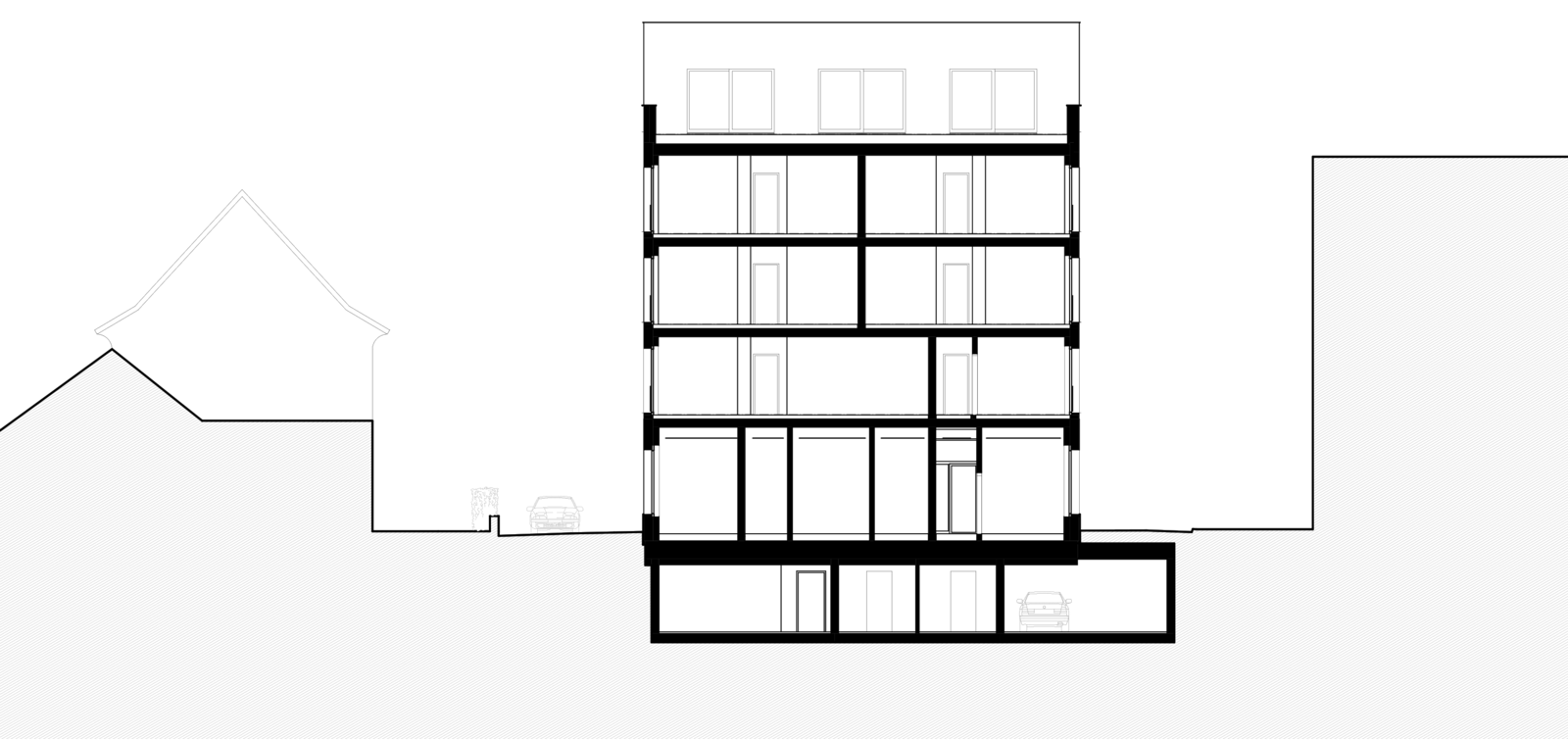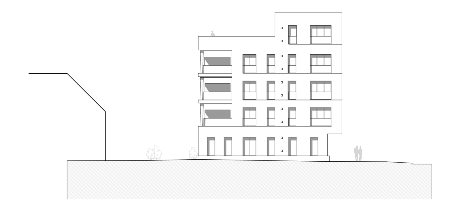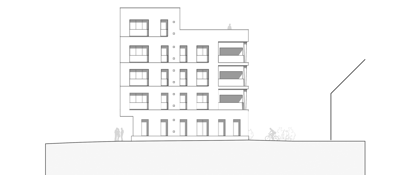 Der Baukörper präsentiert sich als 5-geschossiger Kubus, wobei das Attikageschoss bündig an der Landstrasse angeordnet wird um diese Erscheinung zu unterstützen.