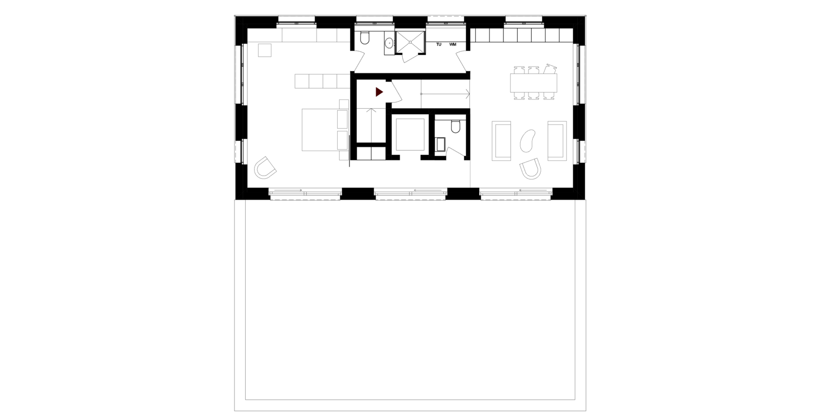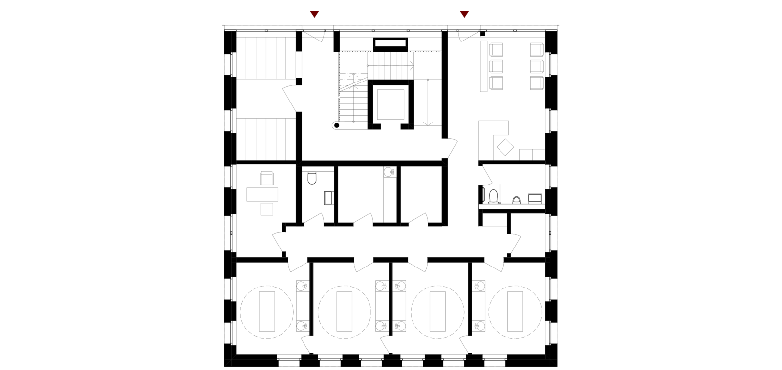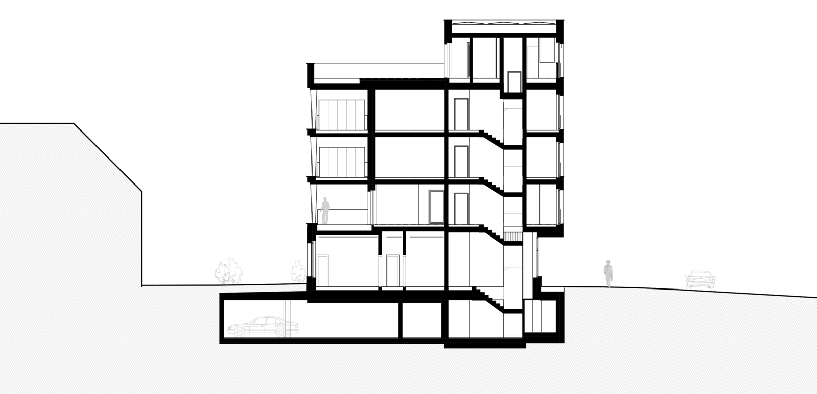 Der Baukörper präsentiert sich als 5-geschossiger Kubus, wobei das Attikageschoss bündig an der Landstrasse angeordnet wird um diese Erscheinung zu unterstützen.