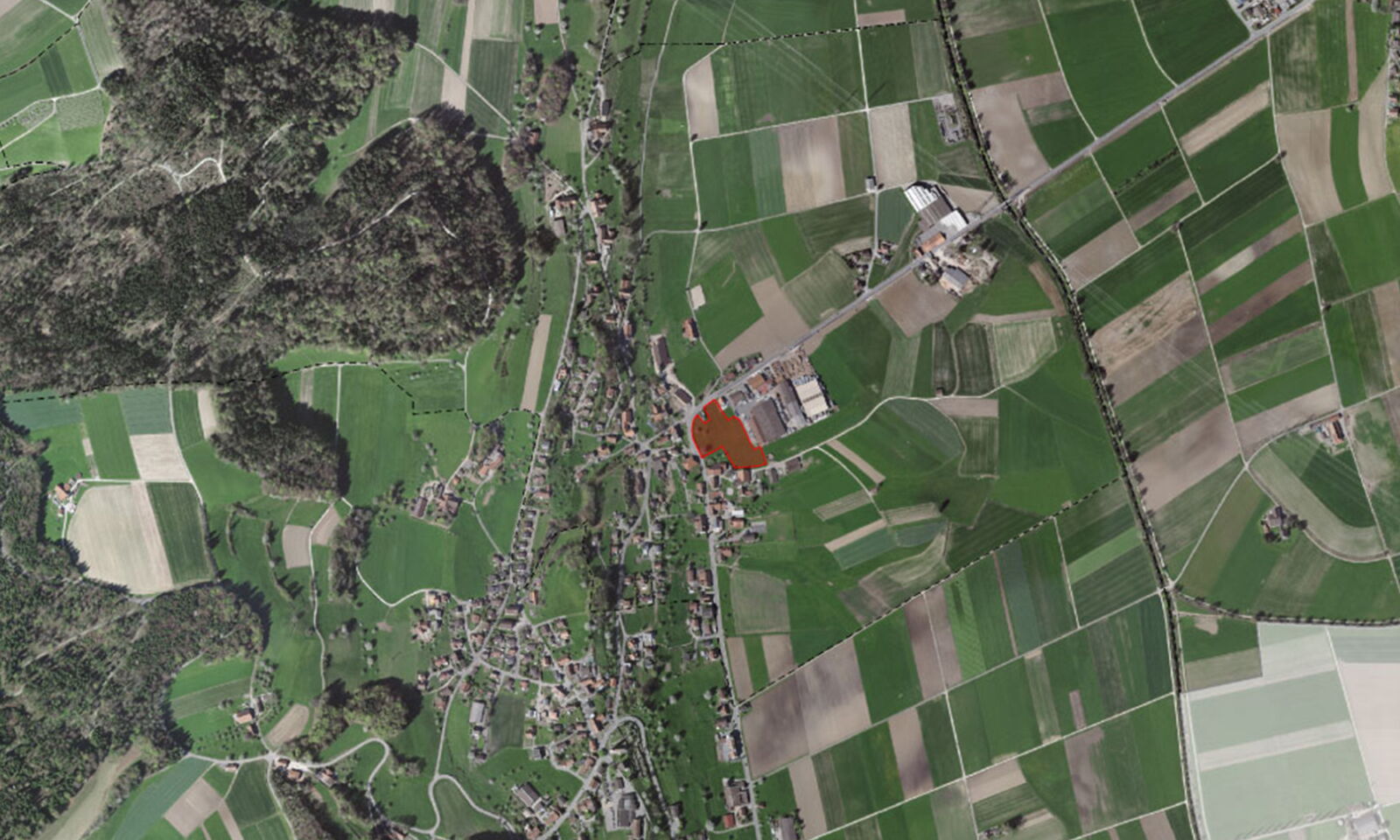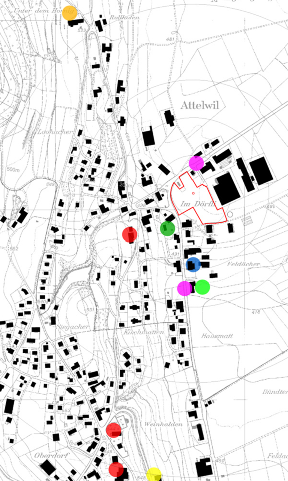 Dort wo die Landkarte mit dem Flurnamen «Im Dörfli» bezeichnet ist, befindet sich in Tat und Wahrheit heute eine nach Osten zum Gewerbegebiet abfallende Wiese. Ein Gebiet fast so gross wie der engere Dorfkern zu entwickeln bedarf einer sehr differenzierten und abgewogenen Vorgehensweise. Das Ortsbild- heute durch die landwirtschaftliche Bauform, Streusiedlung und grosszügigem Kulturlandanteil geprägt – soll behutsam und doch selbstbewusst weiterentwickelt werden.