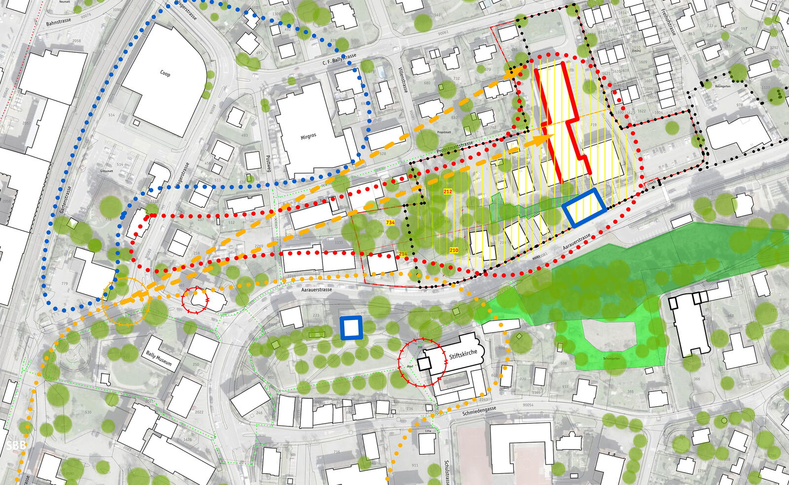 Für das zentrumsnahe Nabholz-Areal haben wir das Richtprojekt für den Gestaltungsplan entwickelt. Kubische Baukörper lehnen sich an den Bestand der Industriebauten an, die orthogonale Setzung wurde vom bestehenden Raster übernommen und damit auch die Lärmsituation an der Aarauerstrasse gelöst. Zeilen- und Punktbauten unterschiedlicher Prägung formen ein abwechslungsreiches Quartier. Die Raumwirkung entsteht nicht primär durch eng verwandte Bauten, sondern vielmehr durch deren Zwischenräume. Räumlich prägend ist die Hangkante, die den Geländesprung zwischen der Aarauerstrasse und dem tieferen Niveau des Areals akzentuiert und dass die Gebäudehöhen zwischen vier und fünf Vollgeschossen variieren.