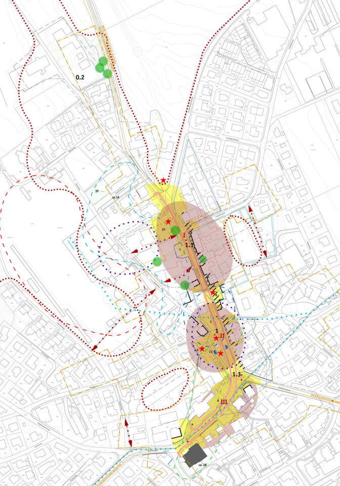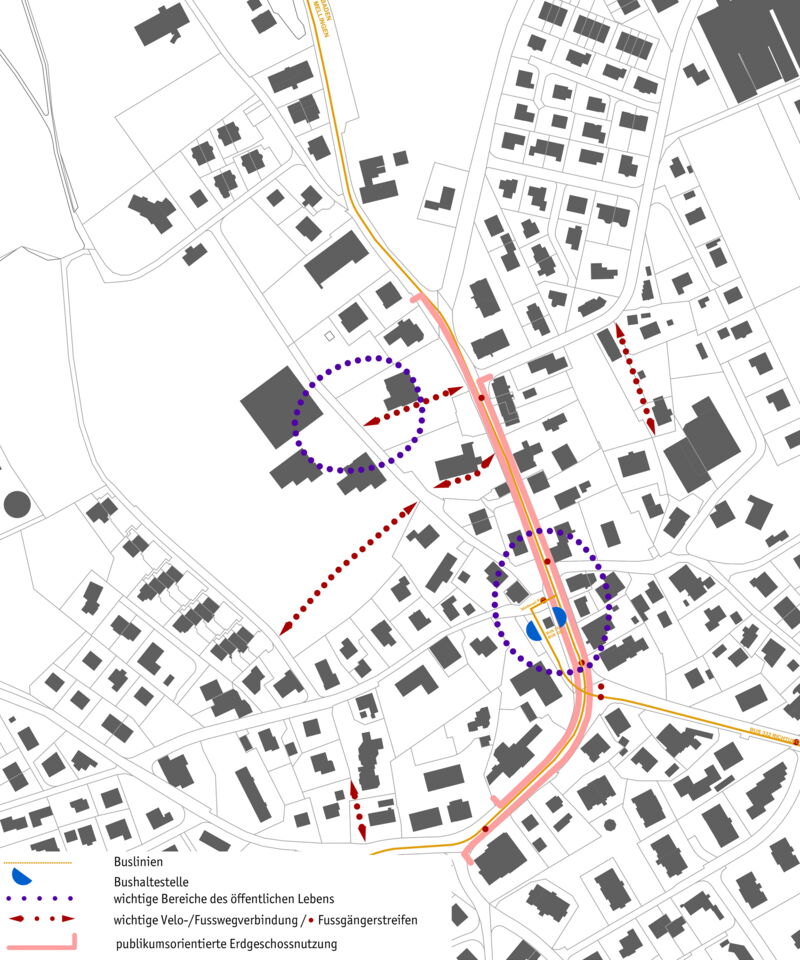 Als Grundlage wird eine ortsbauliche Analyse der historischen Entwicklung und heutigen Gegebenheiten erstellt, die sowohl räumliche als auch funktionale sowie Aspekte der Erschliessung berücksichtigt. Der Fokus liegt auf der Untersuchung der Hauptstrasse und ihren angrenzenden Räumen, ein wichtiger öffentlicher Raum und merkantiles Zentrum der Gemeinde. Ziel ist es, den strassen- zu einem siedlungsorienterten Raum umzuwandeln und so seine identitätsstiftende Funktion zu stärken.