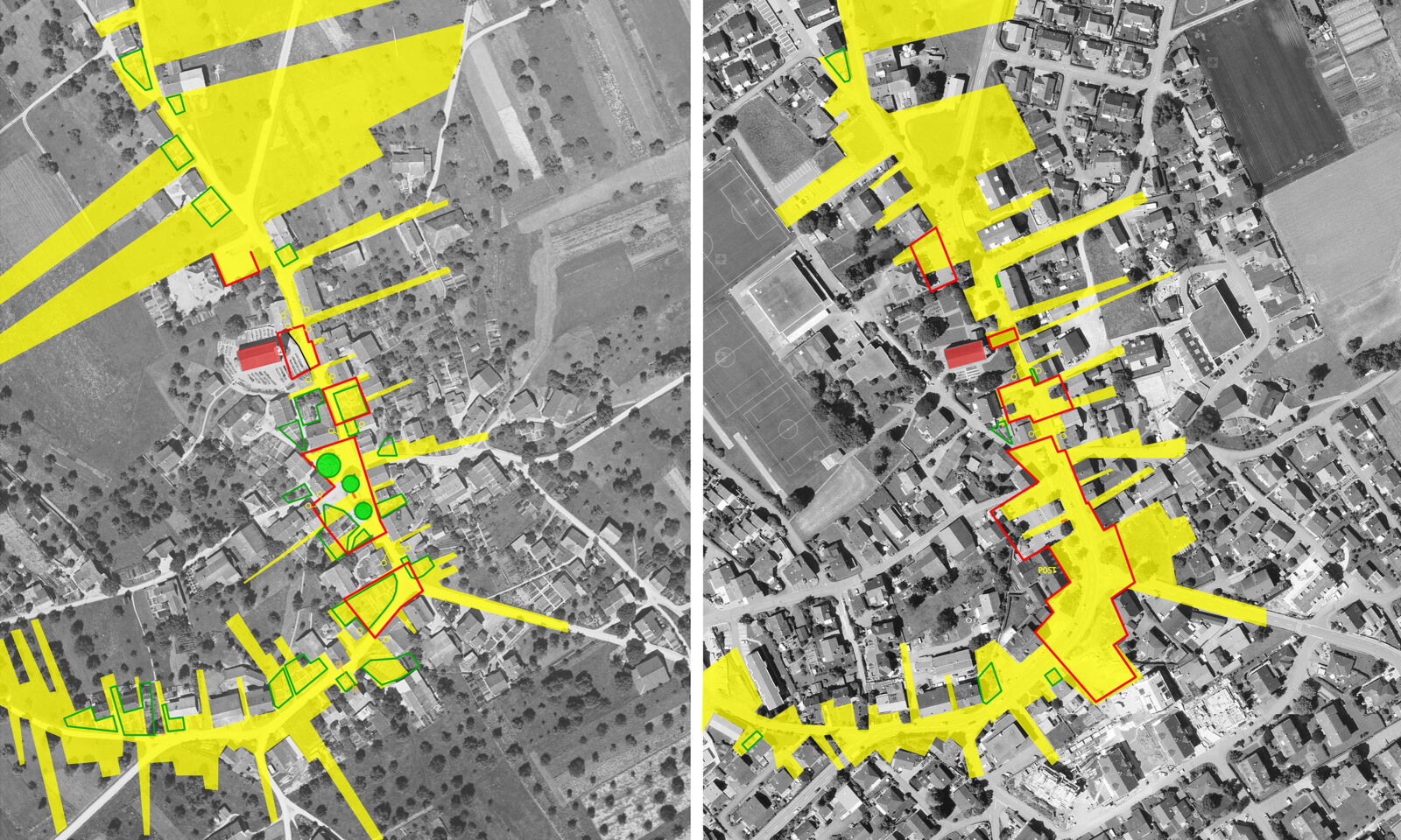 Diese Analysen zeigen, dass sich der öffentliche Raum im Dorfzentrum in den vergangenen siebzig Jahren grundlegend verändert hat. Mit der Ausbreitung der Siedlungsfläche in Ein- und Mehrfamilienhausquartiere ging auch eine Auflockerung des Zentrums einher.