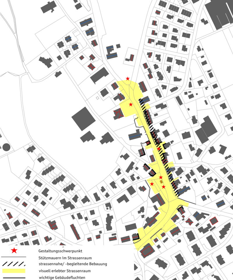 Die städtebauliche Besonderheit der, vom Gemeindehaus bis zum Dorfplatz, dicht an die Hauptstrasse gebauten Häuser, hat sich weitgehend erhalten. Diese sollte als Basis für einen klaren Strassenraum beibehalten werden. Die Prägnanz des Strassenraums kann durch gezielte Einführung von Engstellen mit Hilfe von Baukörpern oder Baumpflanzungen gestärkt werden.