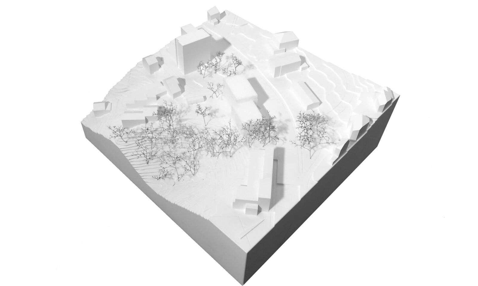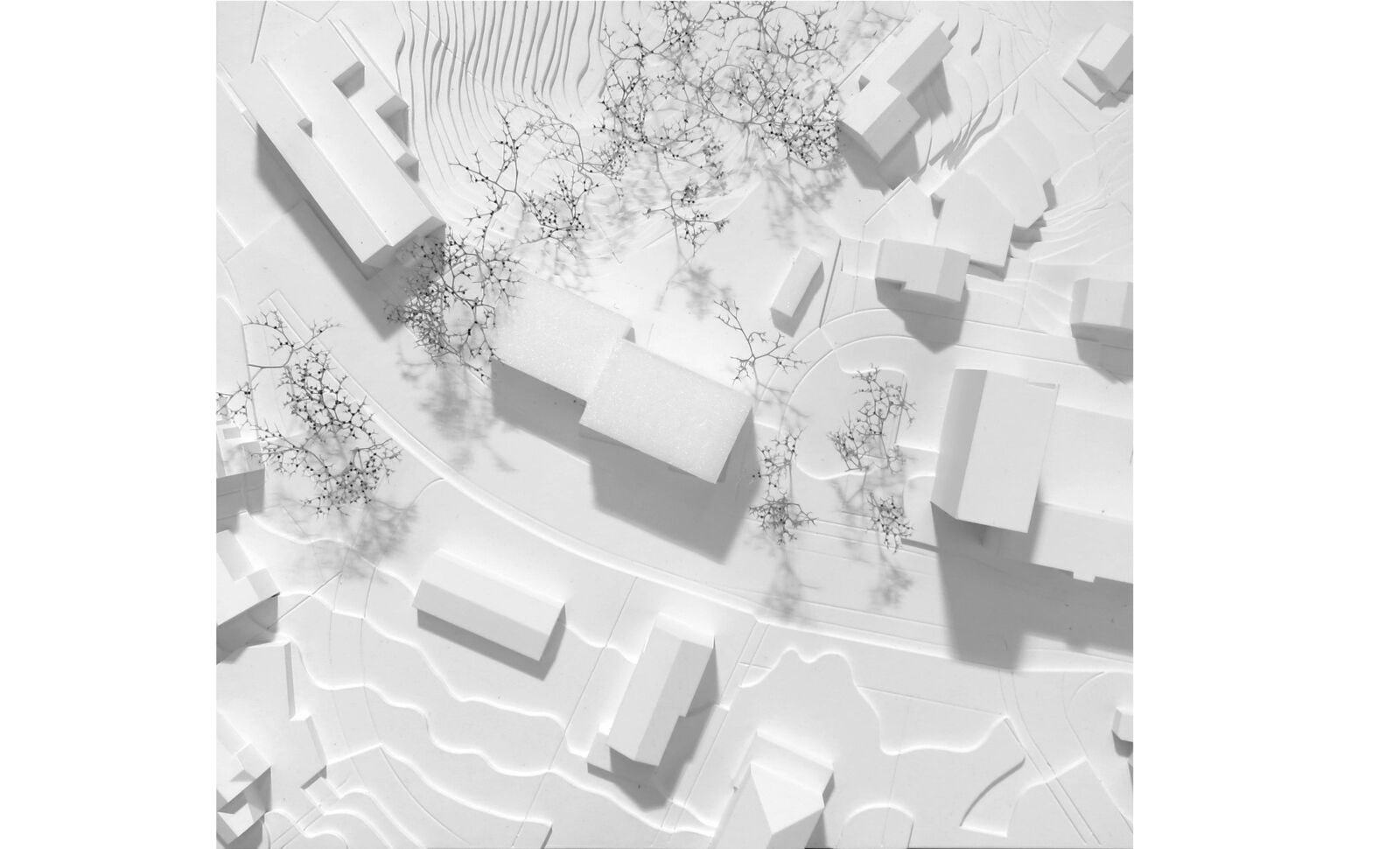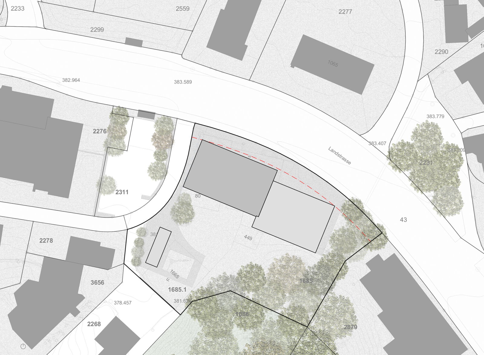 Das projektierte Gebäude wird im Nord-Westen der Parzellen angeordnet. Dem Strassenverlauf folgend nimmt es die Ausrichtung der im Westen liegenden Gebäude auf. Mit einem Versatz im Volumen reagiert das Gebäude auf die Parzellenform und setzt sich mit dem östlich liegende Gebäude in Beziehung.