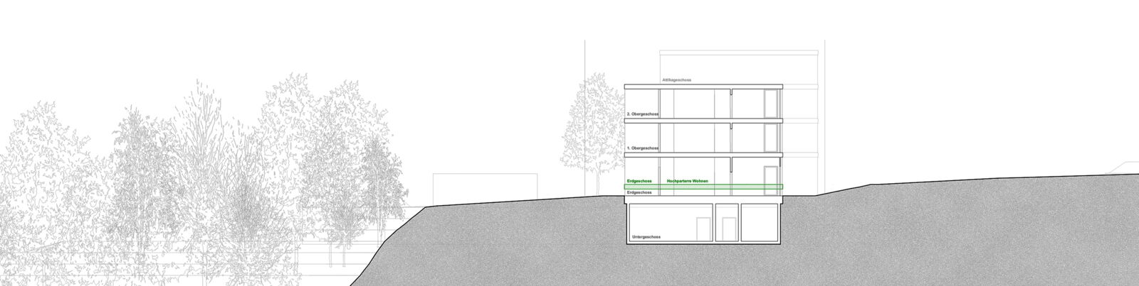 Der in der Höhe gestaffelte Gebäudekörper schliesst eine städtebauliche Lücke und reagiert auf die Höhen der umliegenden Gebäude.Das im Süden liegende Waldstück des Niklausgraben soll weiterhin eine Präsenz an der Landstrasse haben und zusammen mit dem vis-a-vis liegenden "Pocketpark" in Beziehung gesetzt werden. Die zwei- oder dreispännig erschlossenen Wohnungen sind nach Süden orientiert. Grosszügige Wohnzimmer, eine geschützte Loggia welche den Wohnraum nach aussen erweitern und jeweils ein Zimmer pro Wohnung profitieren von der lärmabgewandten Orientierung.