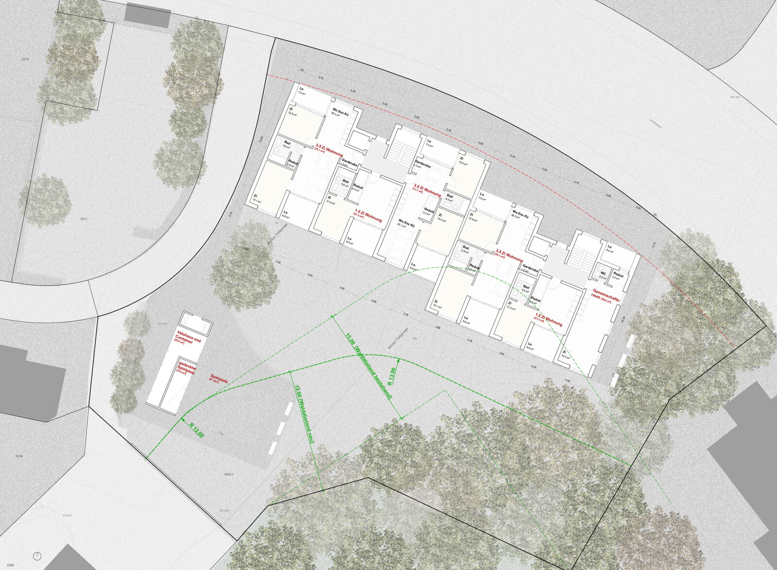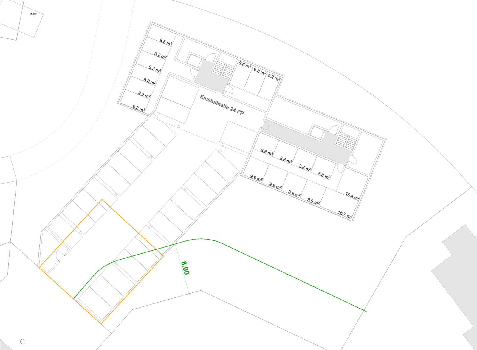 Die Einfahrt der Einstellhalle zur projektierten Überbauung erfolgt über die im Süden liegende Parzelle. Der natürliche Verlauf des Terrains und bereits bestehende, nicht mehr in Gebrauch stehende Bauten [Abbruch] ermöglichen eine kompakte, effiziente Anordnung der Einstellhalle.