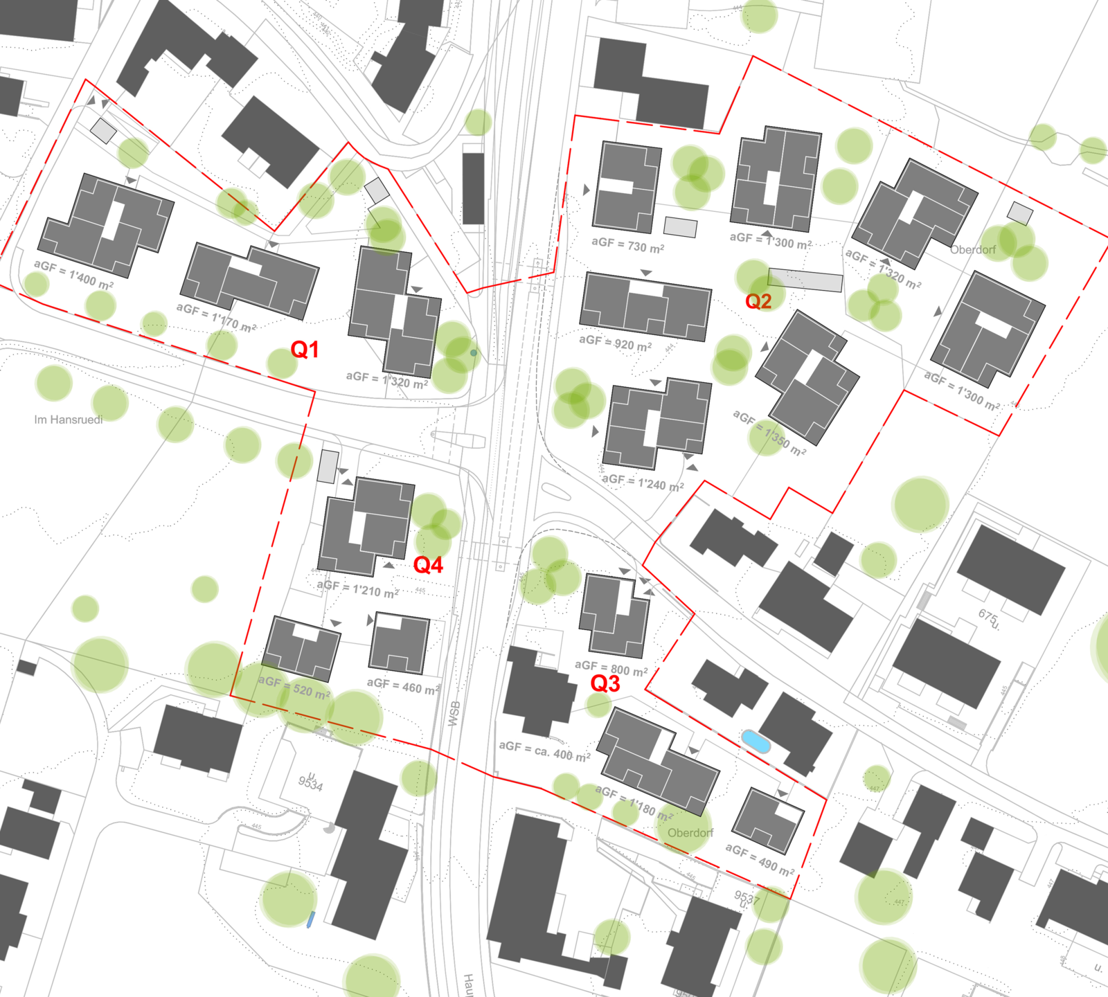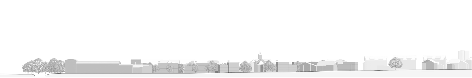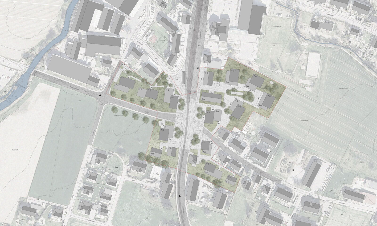 Die Volumina sind in der Regel gegliedert und gestaffelt und somit der gewachsenen Struktur verwandt. Deren Setzung unterstützt eine Siedlungs- beziehungsweise Freiraumvernetzung über den eigentlichen Perimeter hinaus. Die Attikageschosse sollen die Gliederung der Volumina aufnehmen und unterstützen. Die Geschossigkeit misst jeweils drei Geschosse plus Attika respektive plus Dach. So wird eine Ausnutzung von 0.85 erreicht, die mit einem Bonus bei Arealüberbauungen erhöht wird. Somit stellen die Freiraummassnahmen um die Kreuzung die nötige Kohärenz, die Gebäude wiederum eine gewünschte und angenehme Diversität sicher.