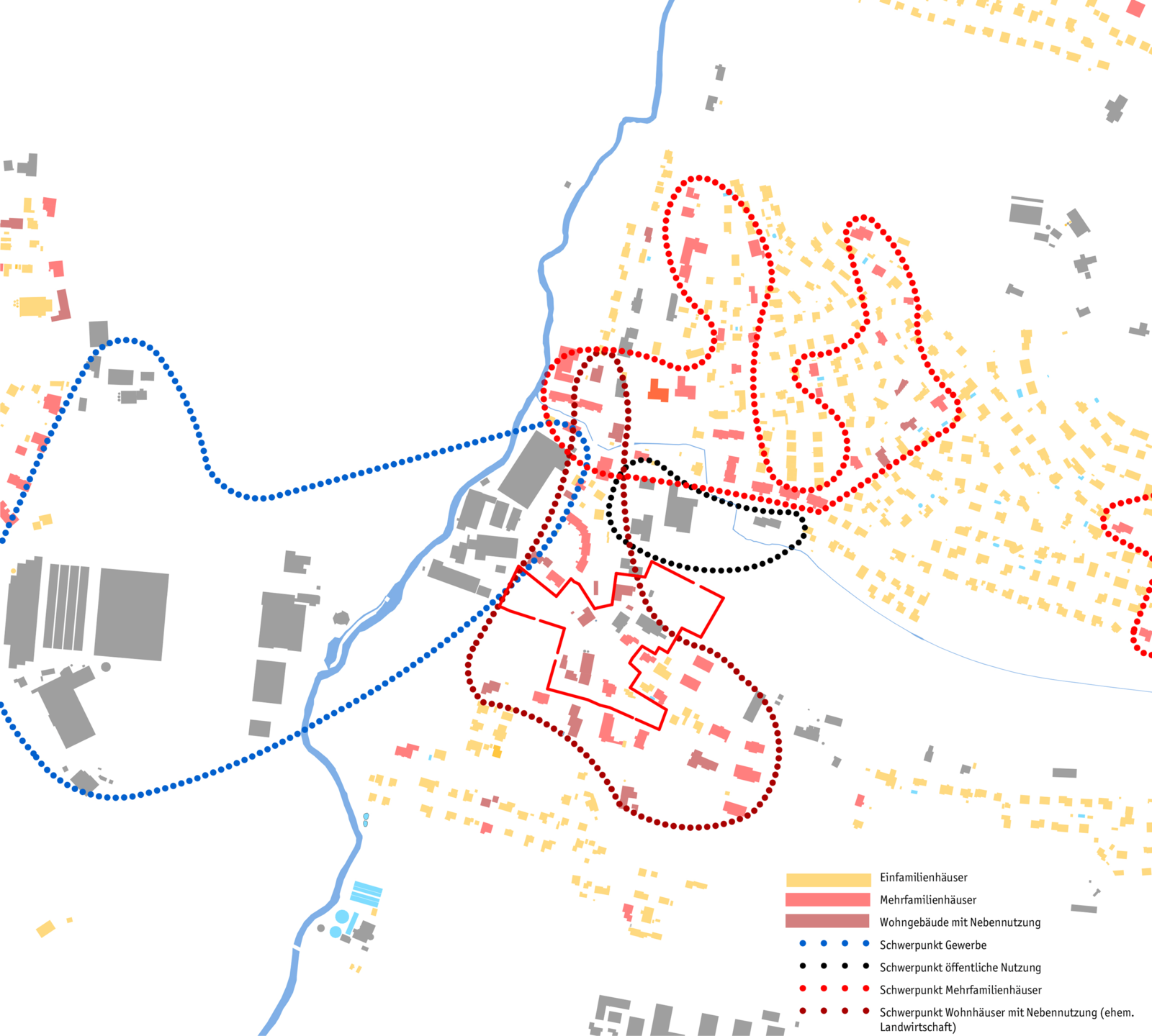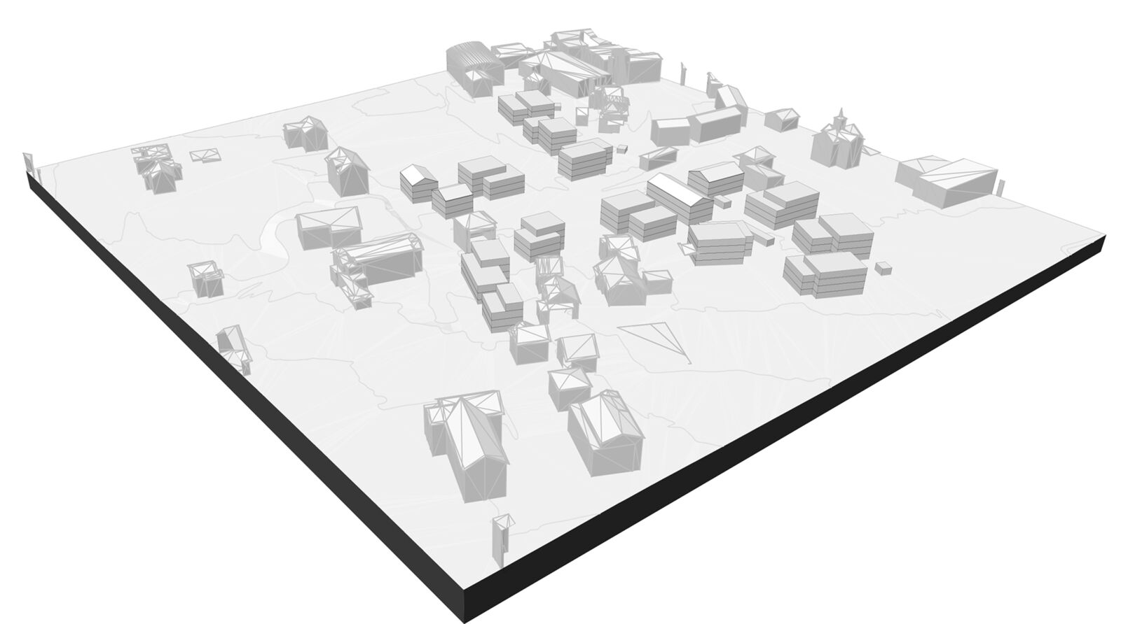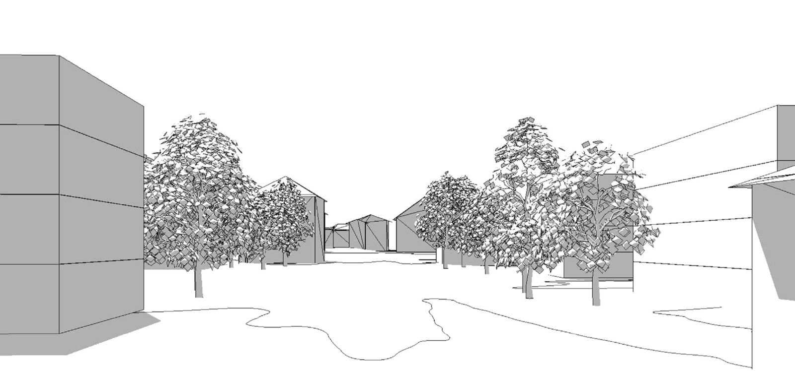 Die Volumina sind in der Regel gegliedert und gestaffelt und somit der gewachsenen Struktur verwandt. Deren Setzung unterstützt eine Siedlungs- beziehungsweise Freiraumvernetzung über den eigentlichen Perimeter hinaus. Die Attikageschosse sollen die Gliederung der Volumina aufnehmen und unterstützen. Die Geschossigkeit misst jeweils drei Geschosse plus Attika respektive plus Dach. So wird eine Ausnutzung von 0.85 erreicht, die mit einem Bonus bei Arealüberbauungen erhöht wird. Somit stellen die Freiraummassnahmen um die Kreuzung die nötige Kohärenz, die Gebäude wiederum eine gewünschte und angenehme Diversität sicher.
