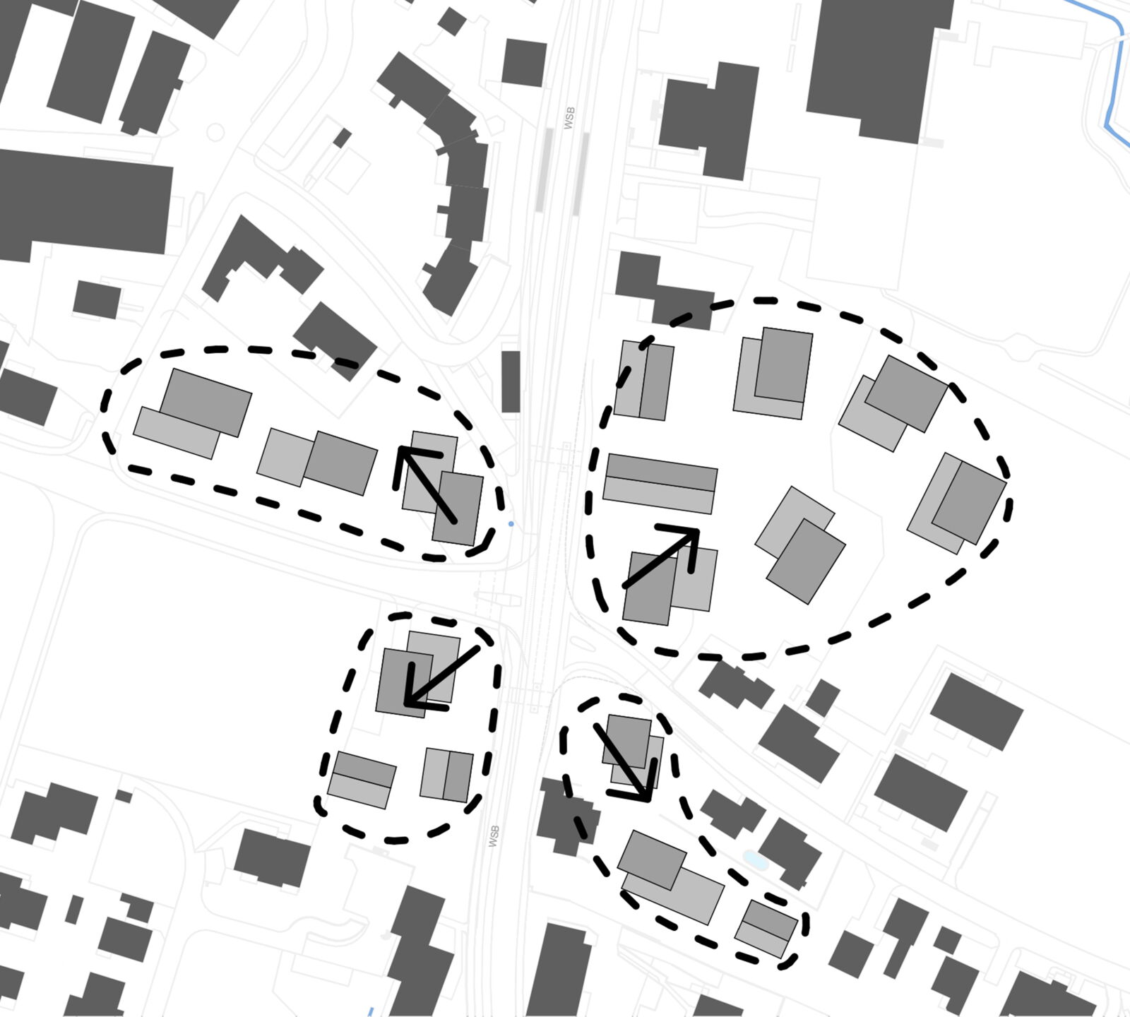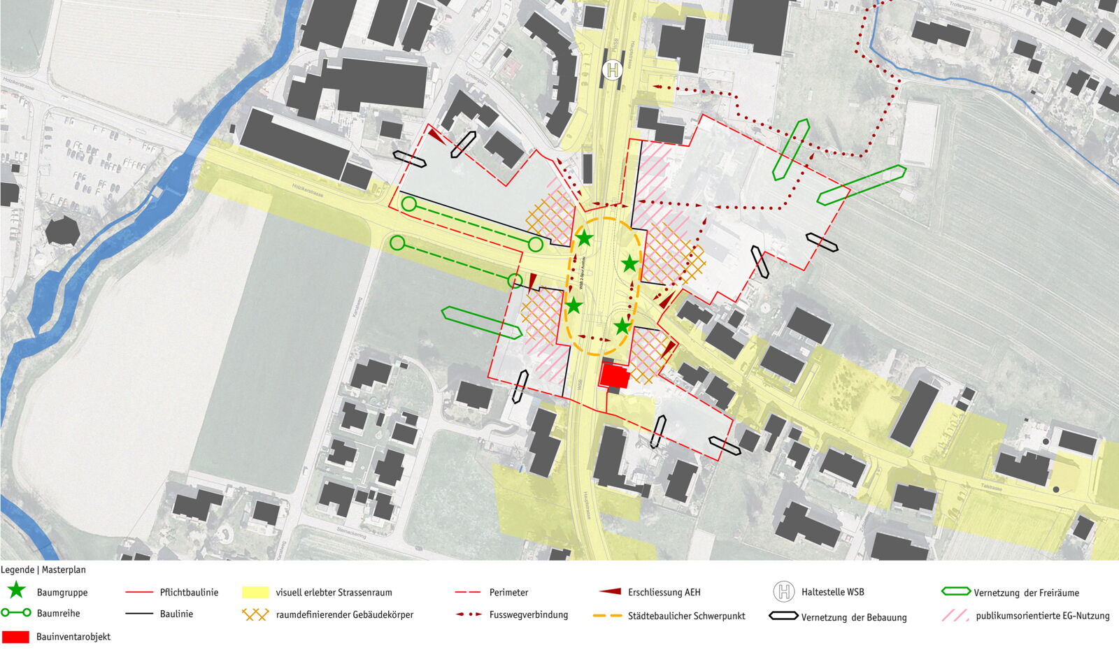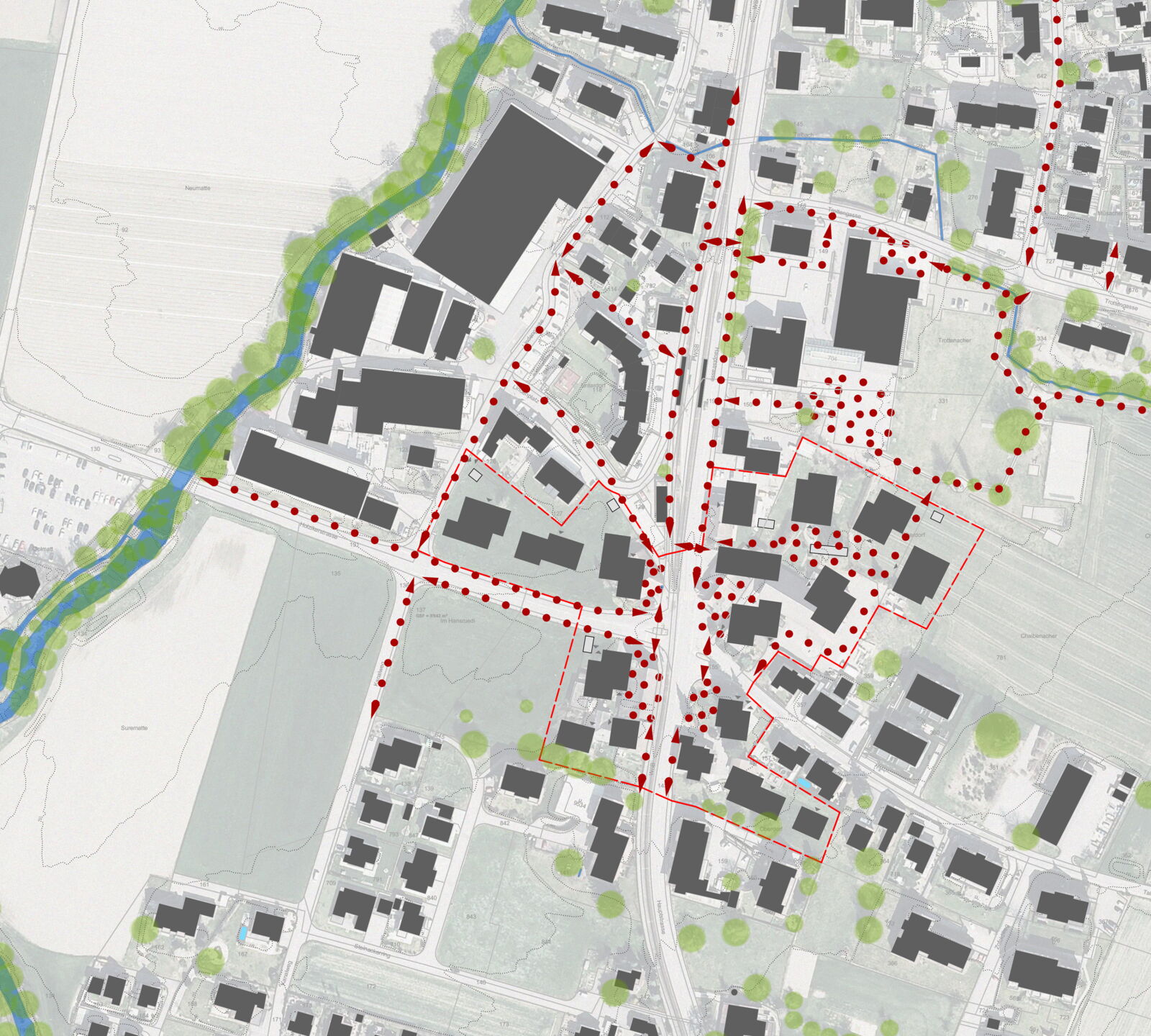 Das Rückgrat unserer Massnahmen bilden die Ausweitung und die Aufwertung des Strassen- und Freiraums im Bereich der Kreuzung. Die vorhandenen und die neuen Aussenräume werden eng vernetzt. Ausserhalb des engeren Perimeters des Knotens verengen die entsprechend gesetzten Volumina den Strassenraum, ohne jedoch Interessenlinien von Bahn und Strasse zu tangieren. Die Planung schafft den Raum für die Entwicklung der Bahntrasse als auch einer siedlungsorientierten Verkehrsführung.