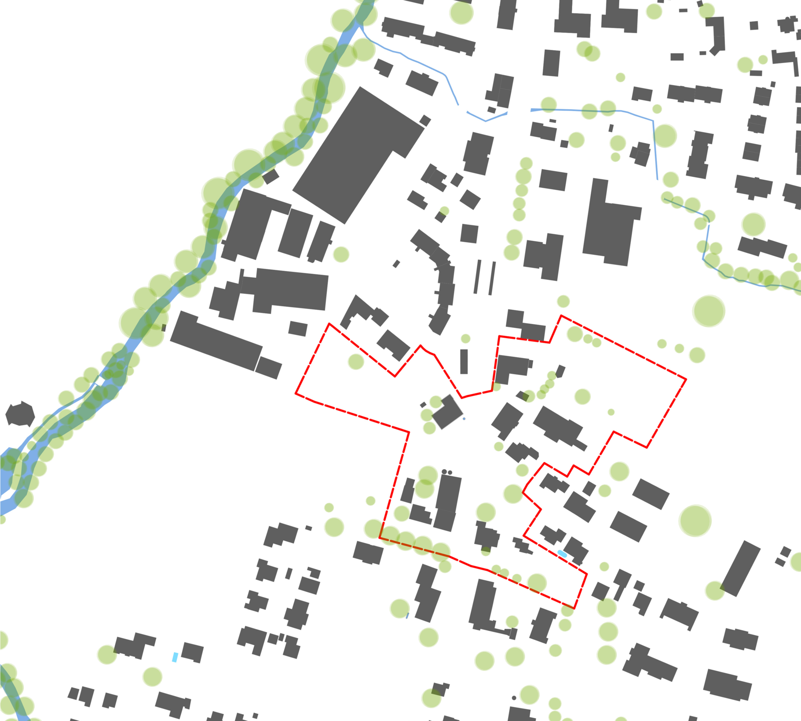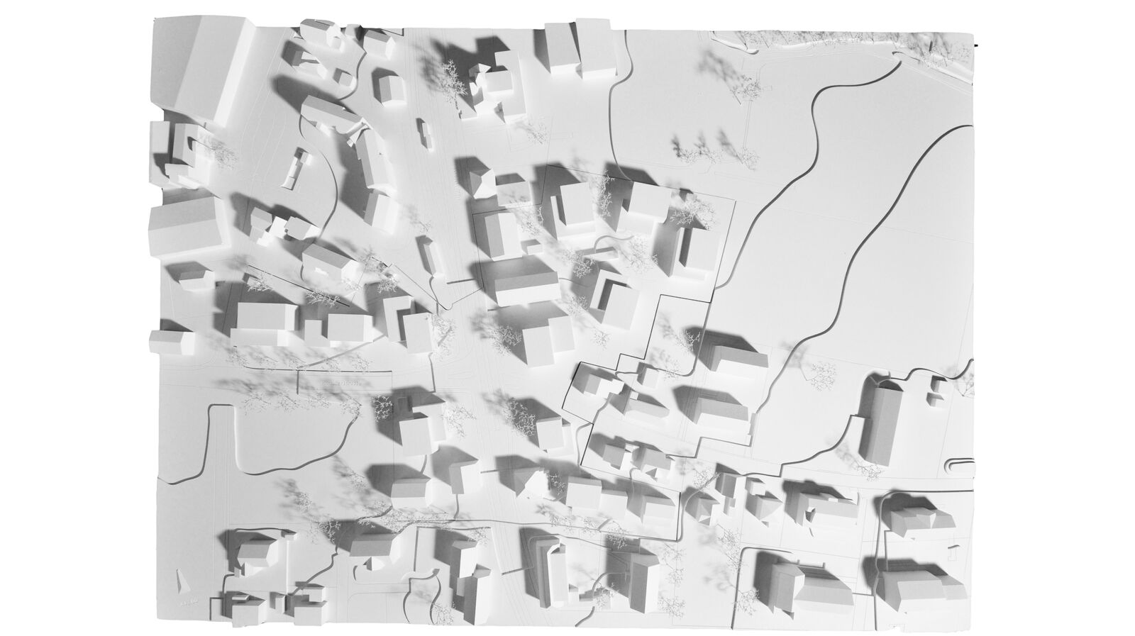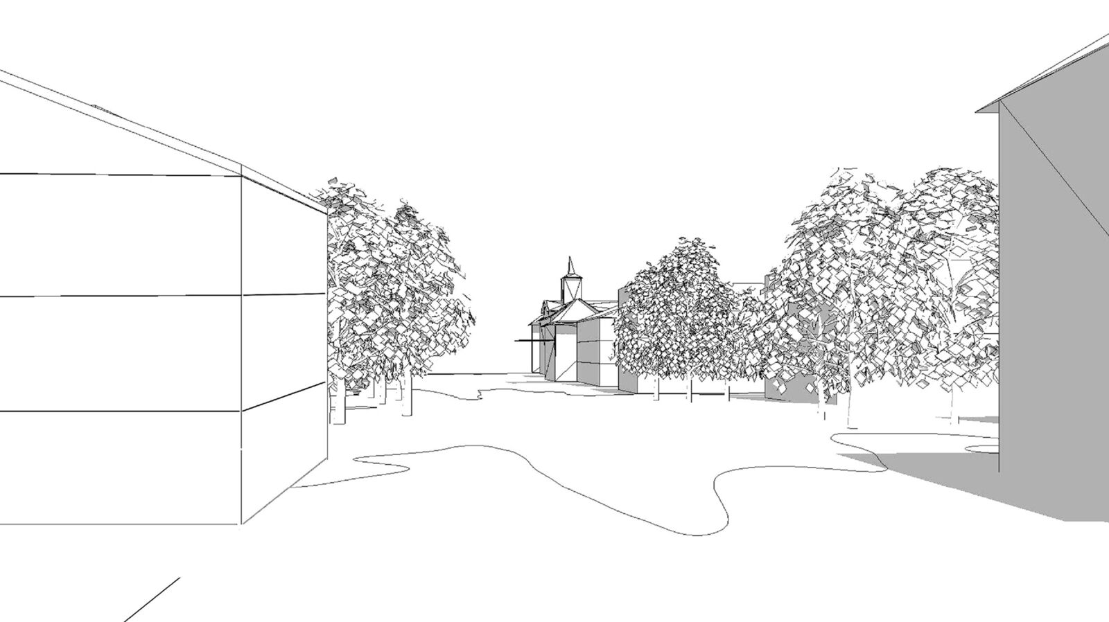 Das Rückgrat unserer Massnahmen bilden die Ausweitung und die Aufwertung des Strassen- und Freiraums im Bereich der Kreuzung. Die vorhandenen und die neuen Aussenräume werden eng vernetzt. Ausserhalb des engeren Perimeters des Knotens verengen die entsprechend gesetzten Volumina den Strassenraum, ohne jedoch Interessenlinien von Bahn und Strasse zu tangieren. Die Planung schafft den Raum für die Entwicklung der Bahntrasse als auch einer siedlungsorientierten Verkehrsführung.