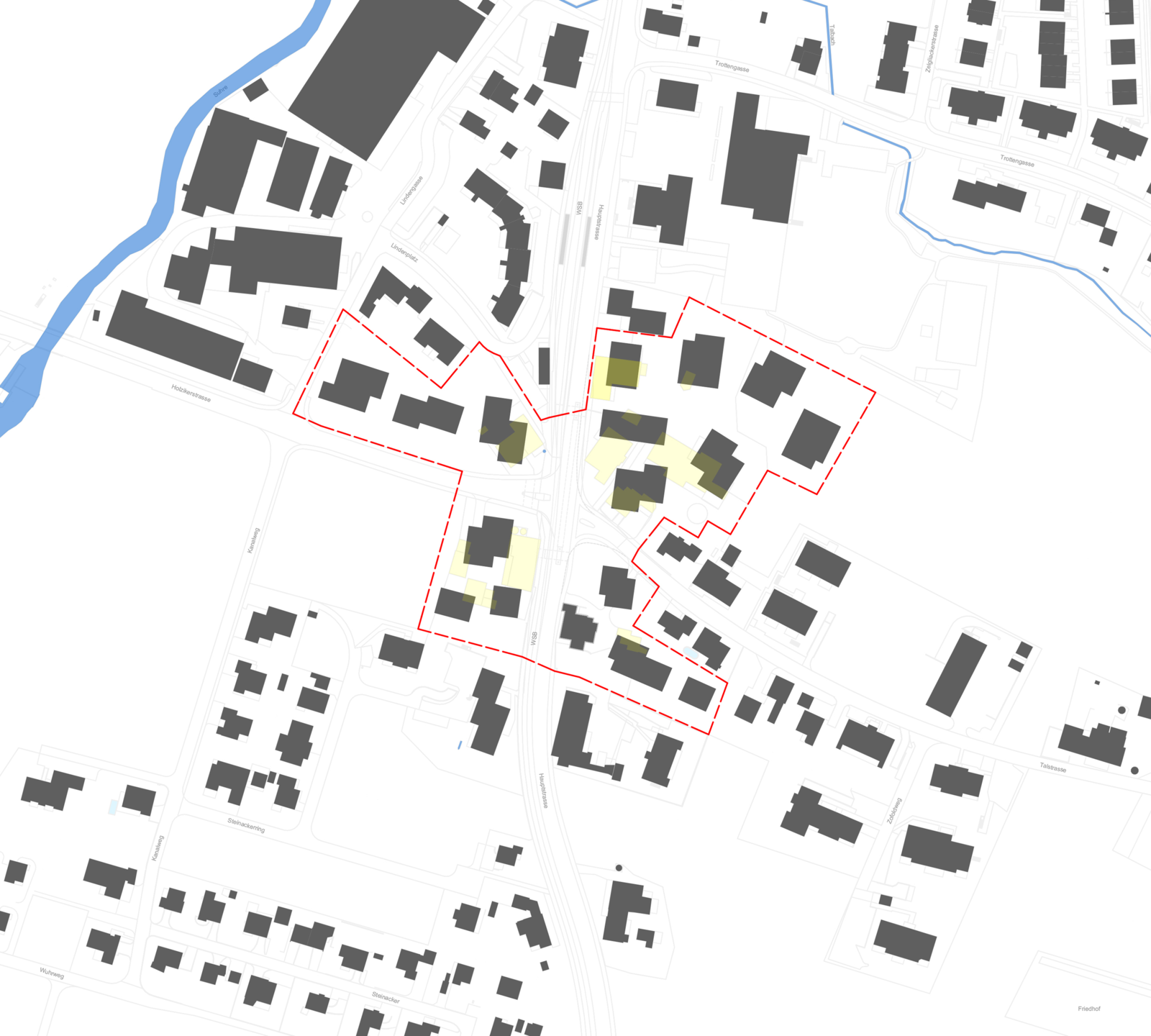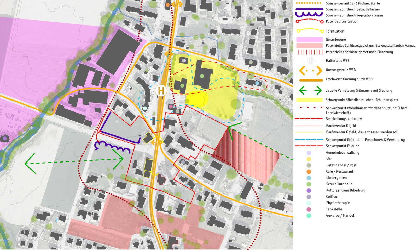 Die Kreuzung Haupt- / Holziker- und Talstrasse ist nicht nur Strasse, nicht nur Platz: sie ist ein Knoten. Einst primär parallel der Suhre entlang verlaufend, ist sie heute mehrfach orientiert und gerichtet. Zusammen mit den noch vorhandenen Teilen des gewachsenen Ortskerns birgt die Planung das Potential, eine Perlenkette identitätsstiftender Elemente zu etablieren.
