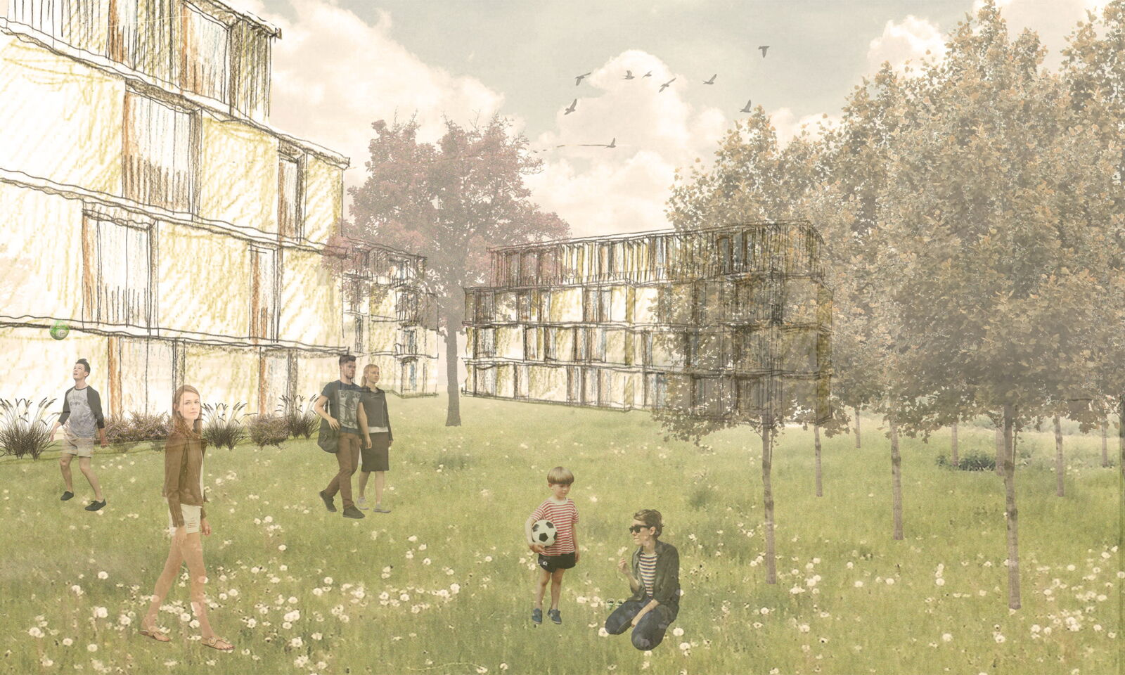 Der zwischen den drei Körpern entstehende grosszügige Aussenraum, bildet gleichsam die Adressierung für Siedlung und Quartier. Durch die Konzentration der drei kompakten neuen Wohnbauten werden innerhalb der Baufelder weite Grünräume geschaffen.