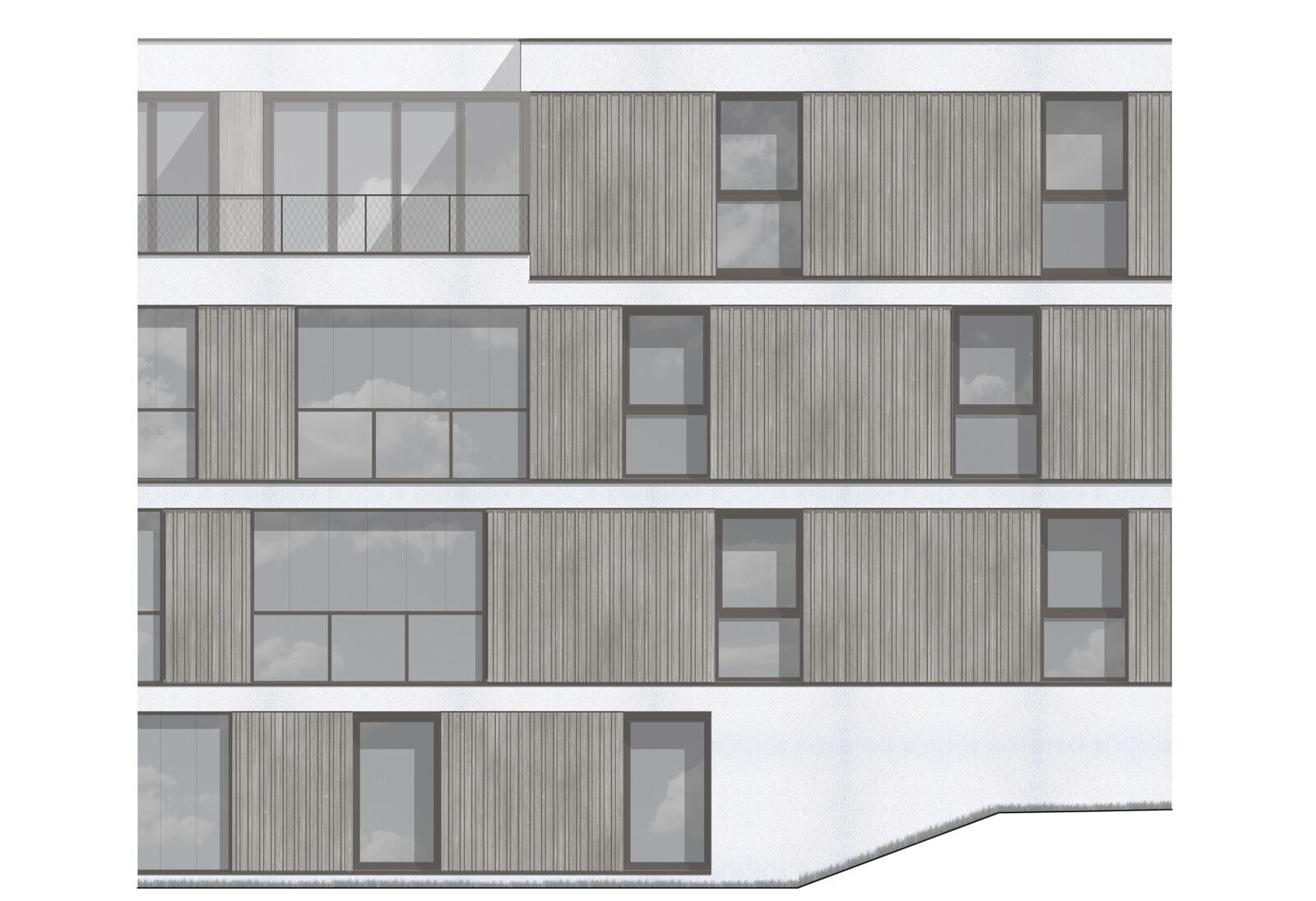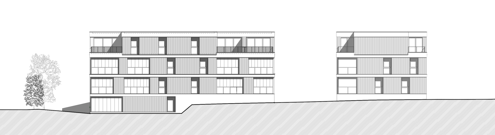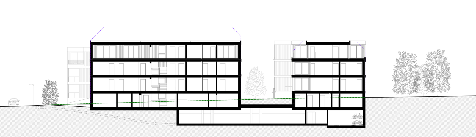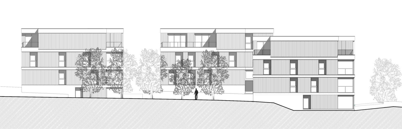 Die Volumen der drei neuen Wohnbauten sind durch Geschossbänder und eingezogene, grosszügige Balkonbereiche gegliedert. Die vierspännigen Grundrisse sind jeweils nach Süden oder Westen ausgerichtet, der Eingang zu den Gebäuden erfolgt jeweils vom grosszügigen gemeinschaftlichen Hofbereich. Die Attikawohnungen verfügen