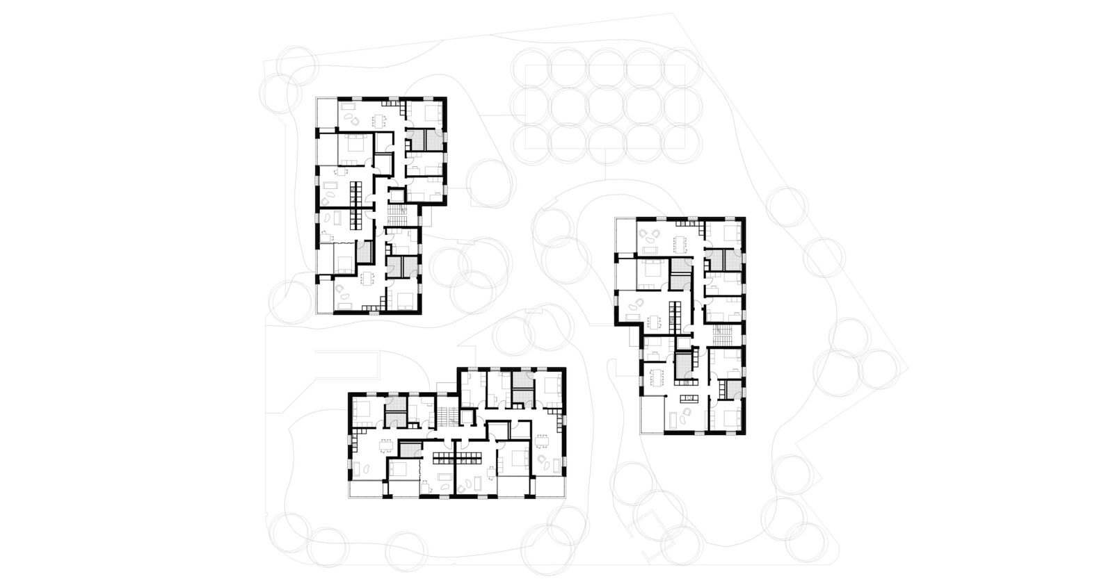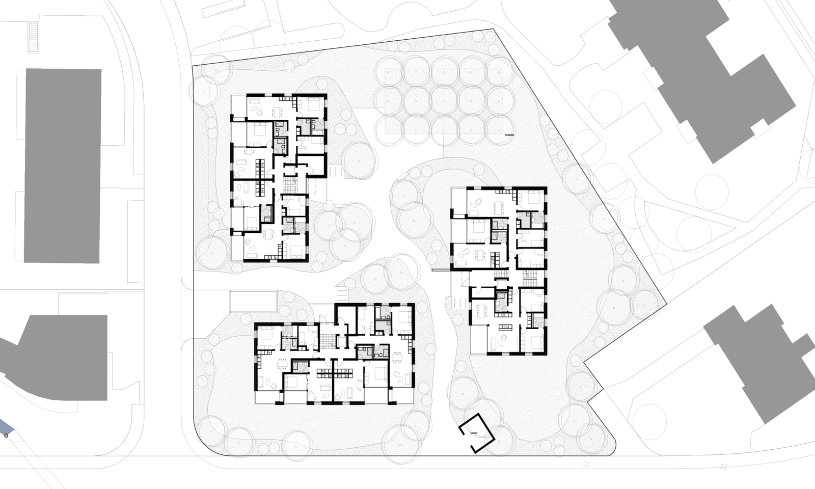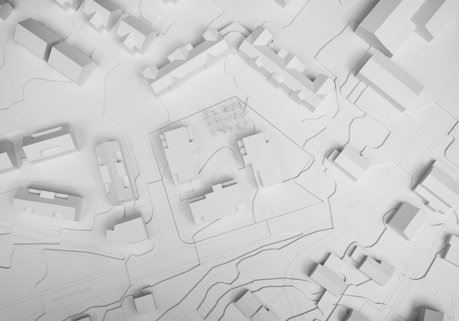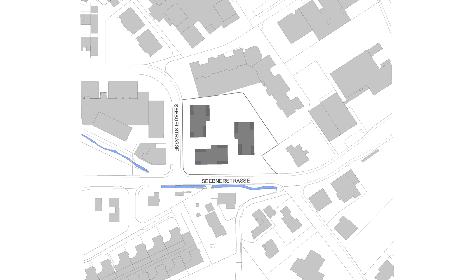 Die drei Mehrfamilienhäuser werden windmühlenartig auf dem Grundstück positioniert. Ein viertes Feld, gleichförmig bepflanzt mit mehrstämmigen Bäumen komplettiert diese Form. Die Überbauung schliesst die unbebaute Ecke Seebnerstrasse und Seebüelstrasse und komplettiere so die erste Bautiefe.