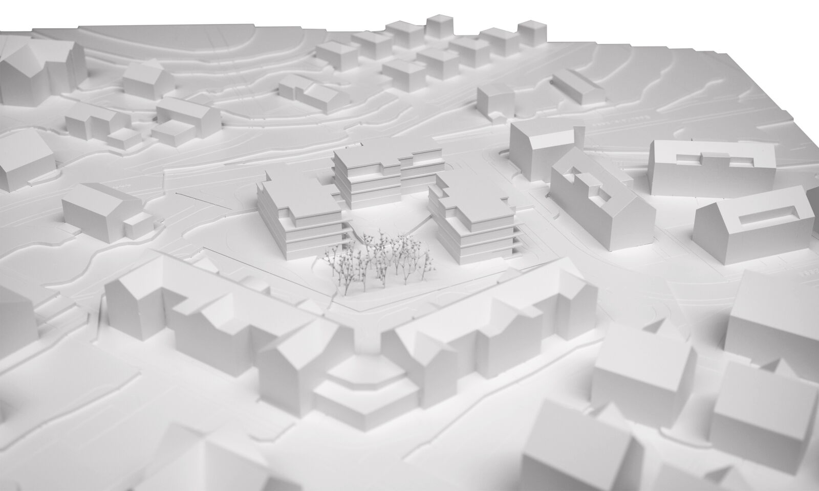 Im Zuge einer städtebaulichen Studie wurden verschiedene Bebauungs- und Dachformen untersucht. In Winkel sind Satteldachformen vorherrschend. Wir konnten jedoch die Gemeinde und Bauherrschaft überzeugen, an diesem Ort eine Überbauung mit Flachdach zu realisieren.