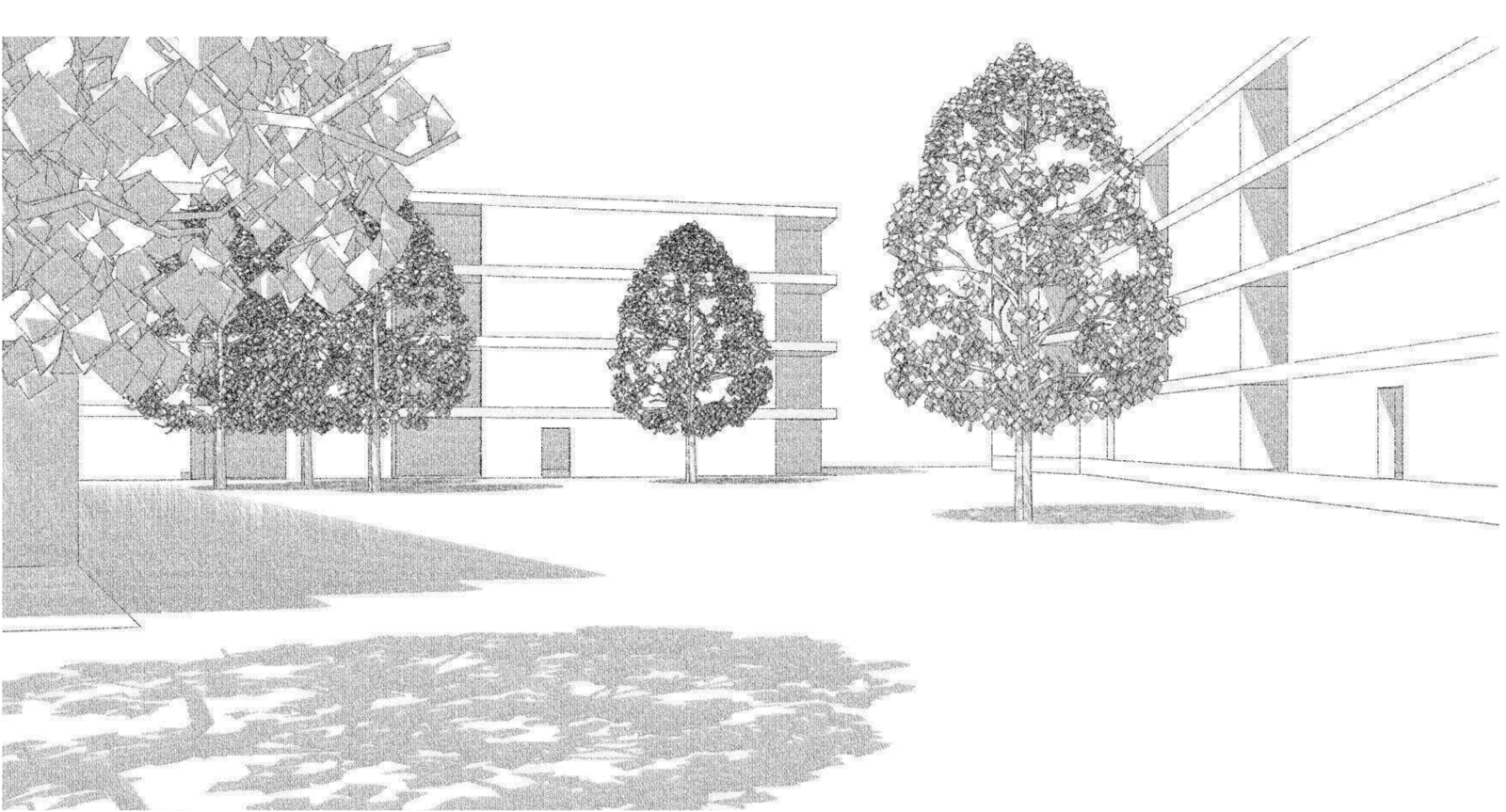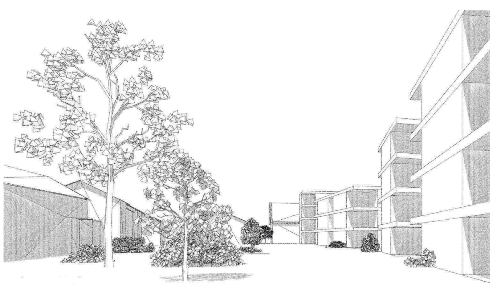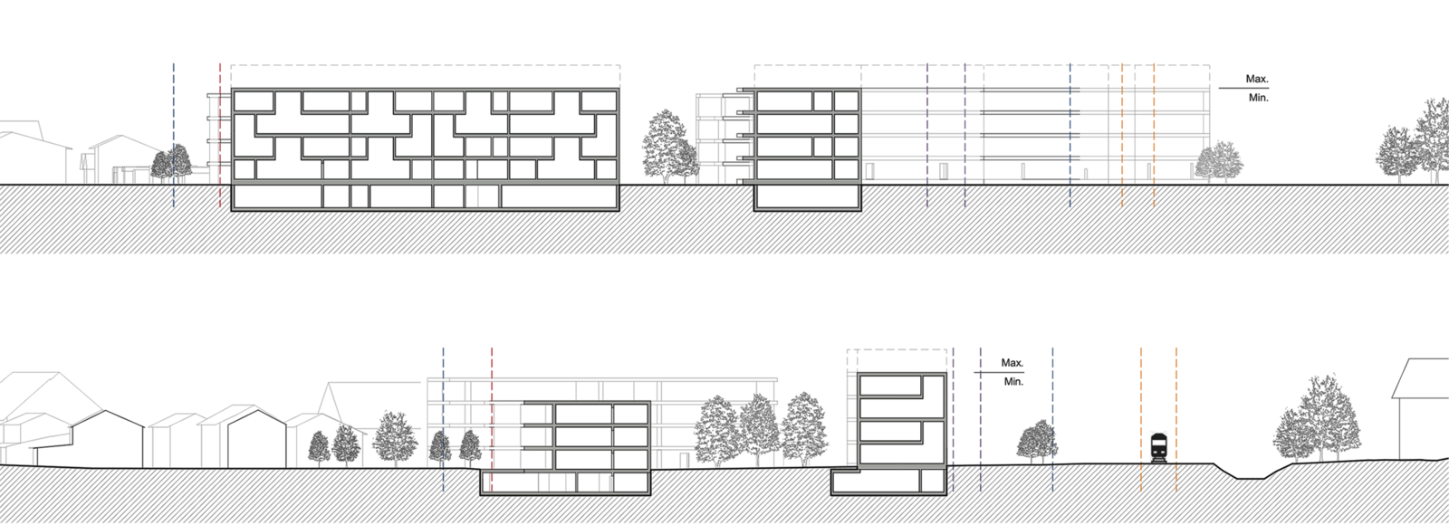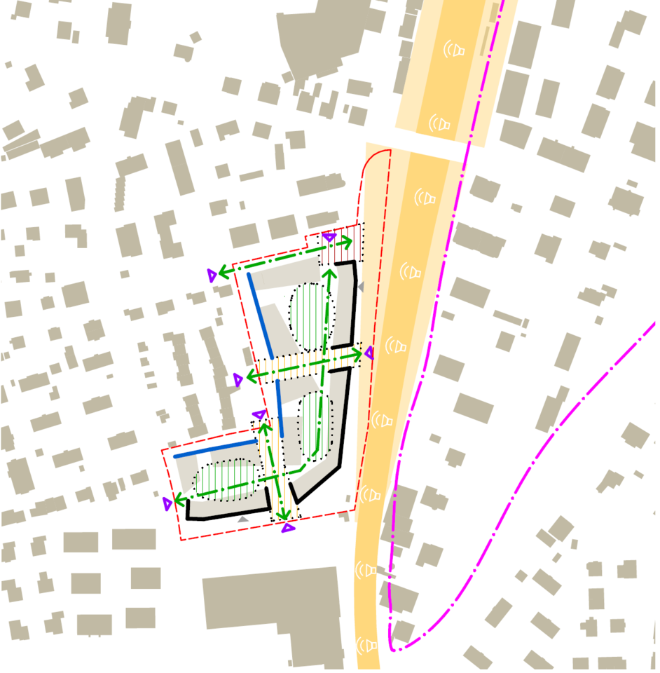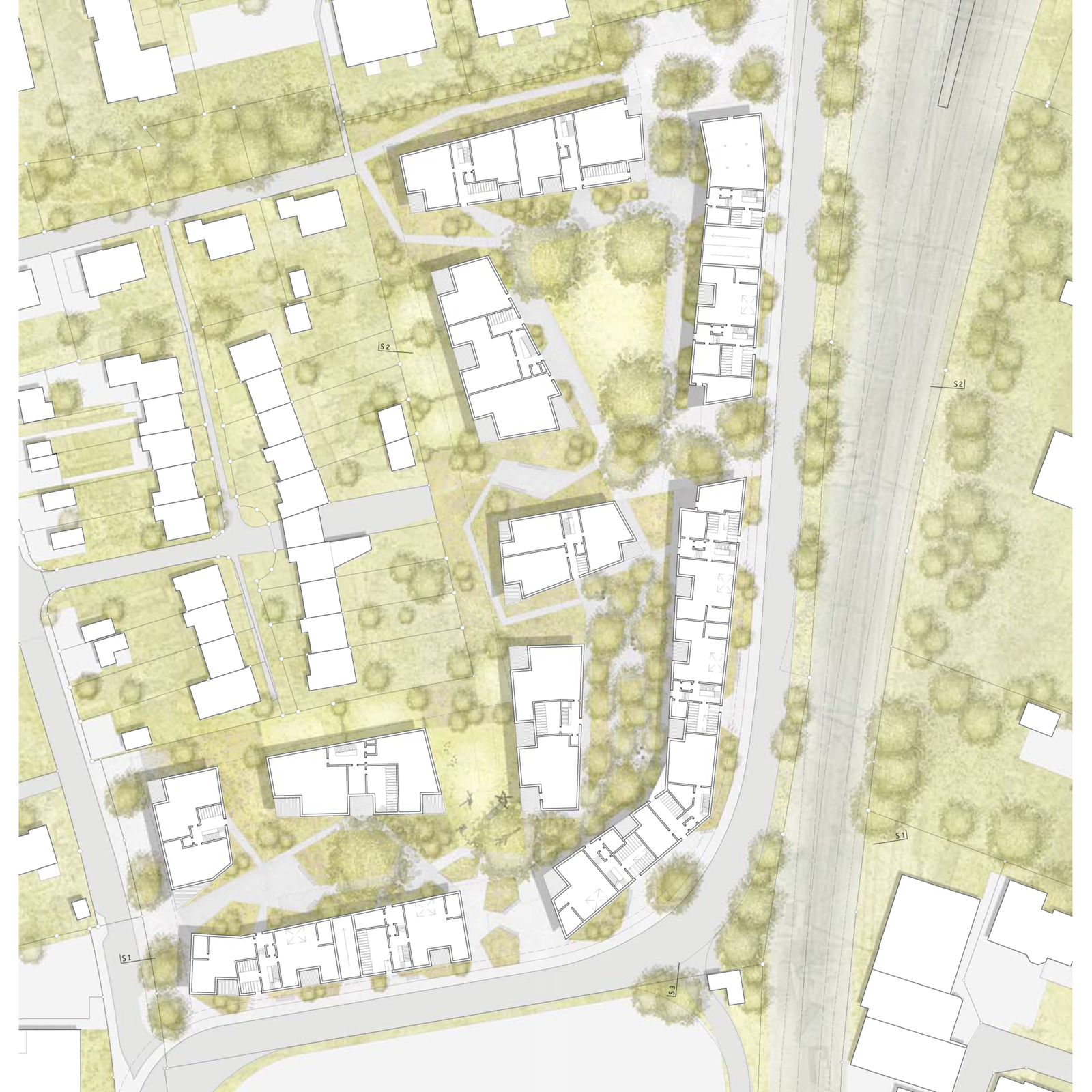 Im Norden der Siedlung öffnet sich der Strassenraum zu einem Platzbereich. Im Erdgeschoss sind öffentliche, respektive gewerbliche Räumlichkeiten gruppiert, welche eine «urbane» Qualität in das verdichtete Quartier bringen. Die Strategie der «grossen Form» erleichtert die Einhaltung der Lärmschutzvorgaben. Indem der Parzellenrand zur Bahn respektive Quartierstrasse als jeweils geschlossene Riegel ausgebildet werden, entstehen für den hinteren Bereich lärmgeschützte Wohn- und Aufenthaltsbereiche.
