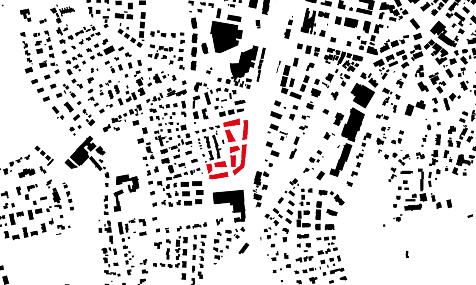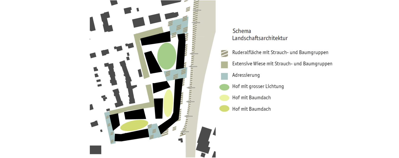 Mit der Überbauung dieser Flächen steigt der Bedarf an qualitätsstiftenden Interventionen. Der erste Schritt der städtebaulichen Konzeption definiert daher Lage und Qualitäten des Raumes, der nicht bebaut werden soll. Ausgehend vom existierenden stadträumlichen Muster grossmassstäblicher Gebäude entlang der Bahnlinie wird eine Grossform entwickelt, in die drei Höfe gestanzt und miteinander verbunden werden. Diese, an den umschlossenen Innenhof der Farnsberg-Siedlung erinnernde «Hoffolge» bildet die Hauptschlagader des neuen Quartierteils. Mittels partieller Auflösung der grossen Form durch Zerlegung in Einzelbaukörper, wird die Körnung der Nachbarschaft übernommen und eine Vernetzung mit dem umliegenden Quartier hergestellt.