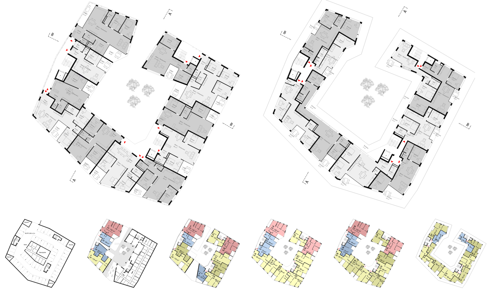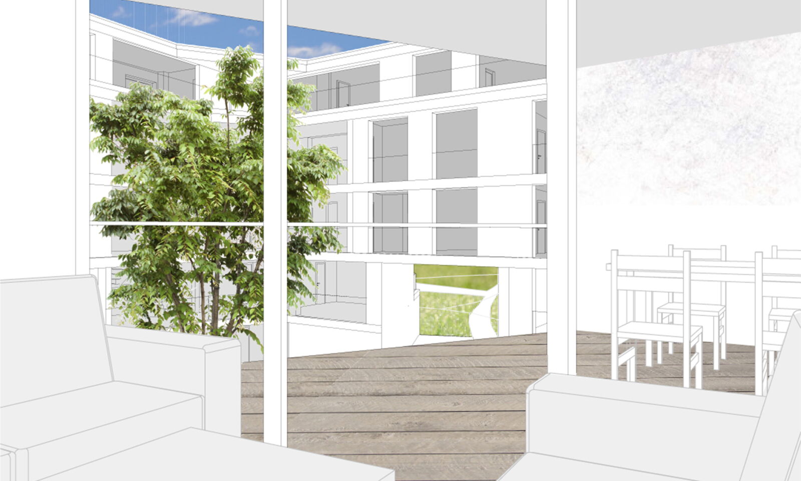 Der Hoftypus erlaubt, dass die Wohnungen über einen Anteil Aussenbezug und einen Anteil Innenbezug verfügen. Dieser Durchwohntypus kann somit von den Qualitäten des Ortes profitieren und über lärmabgewandte Räume oder Loggien die kritische Lärmbelastung ausgleichen. Um den Hof herum entwickelt, findet sich eine Vielfalt unterschiedlichster Wohnungstypen, die immer über einen loggiaartigen Aussenbereich verfügen. Zur Lärmbelastung hin verglast lassen diese Loggien wiederum ein lärmabgewandtes Lüften zu.