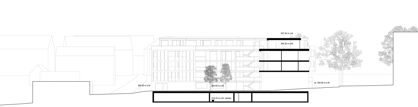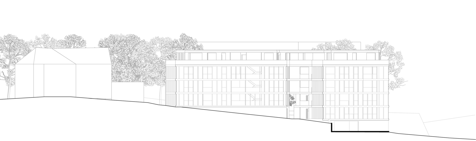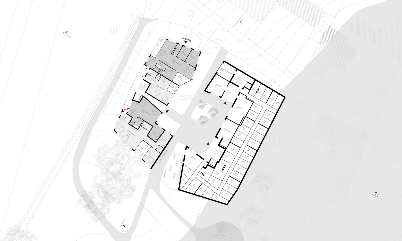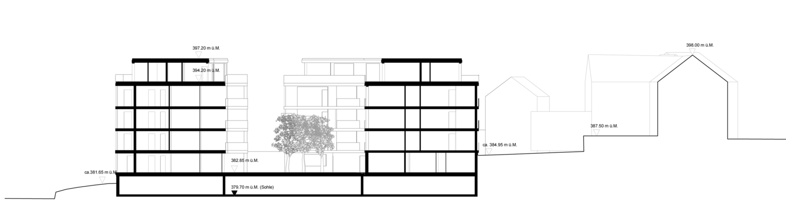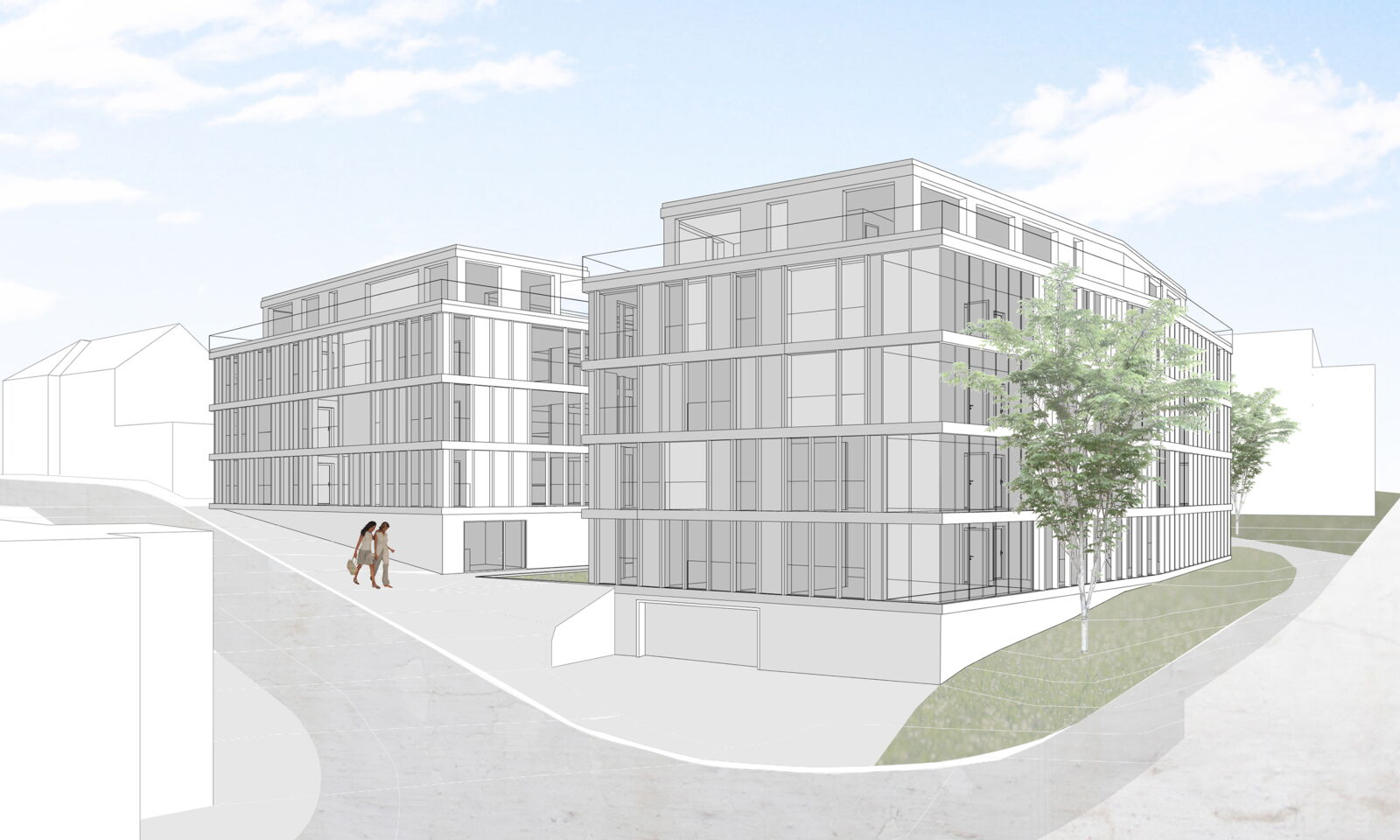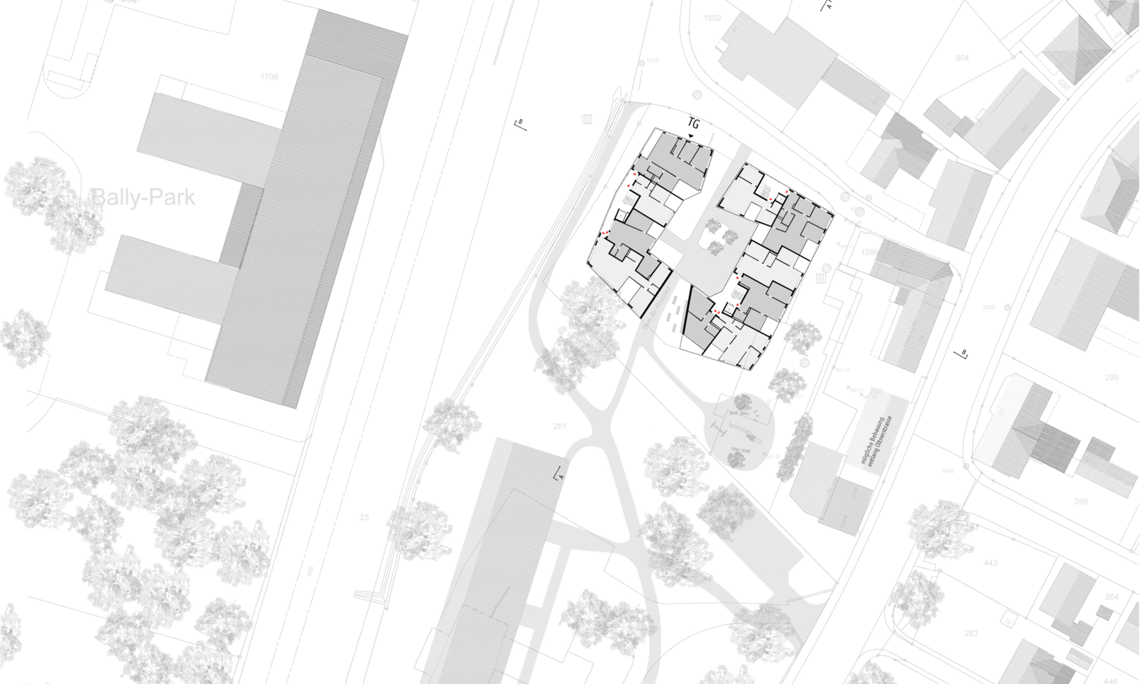 Basierend auf dem dichten Netz von teilweise divergierenden Randbedingungen, setzen wir ein zur Bahnhofstrasse offenes Hofgebäude, das deren Massstäblichkeit aufnimmt. Der «offene Blockrand» bildet den punktförmigen Abschluss des Parks zur Bahnhofstrasse und den Auftakt zum geplanten riegelförmigen Gebäude «im Park» weiter südlich. Der Hof ist nicht nur von Bahn- und Strassenlärm geschützt, er bildet auch einen Identifikationsschwerpunkt der neuen Bebauung.Der dominierende Parkraum erhält einen adäquaten Abschluss, respektive Auftakt. Zusammen mit der südlichen Bebauung «im Park», werden die Ränder des Parks definiert und in einen Kontrast zum frei an die Oltnerstrasse fliessenden Grünraum gesetzt.