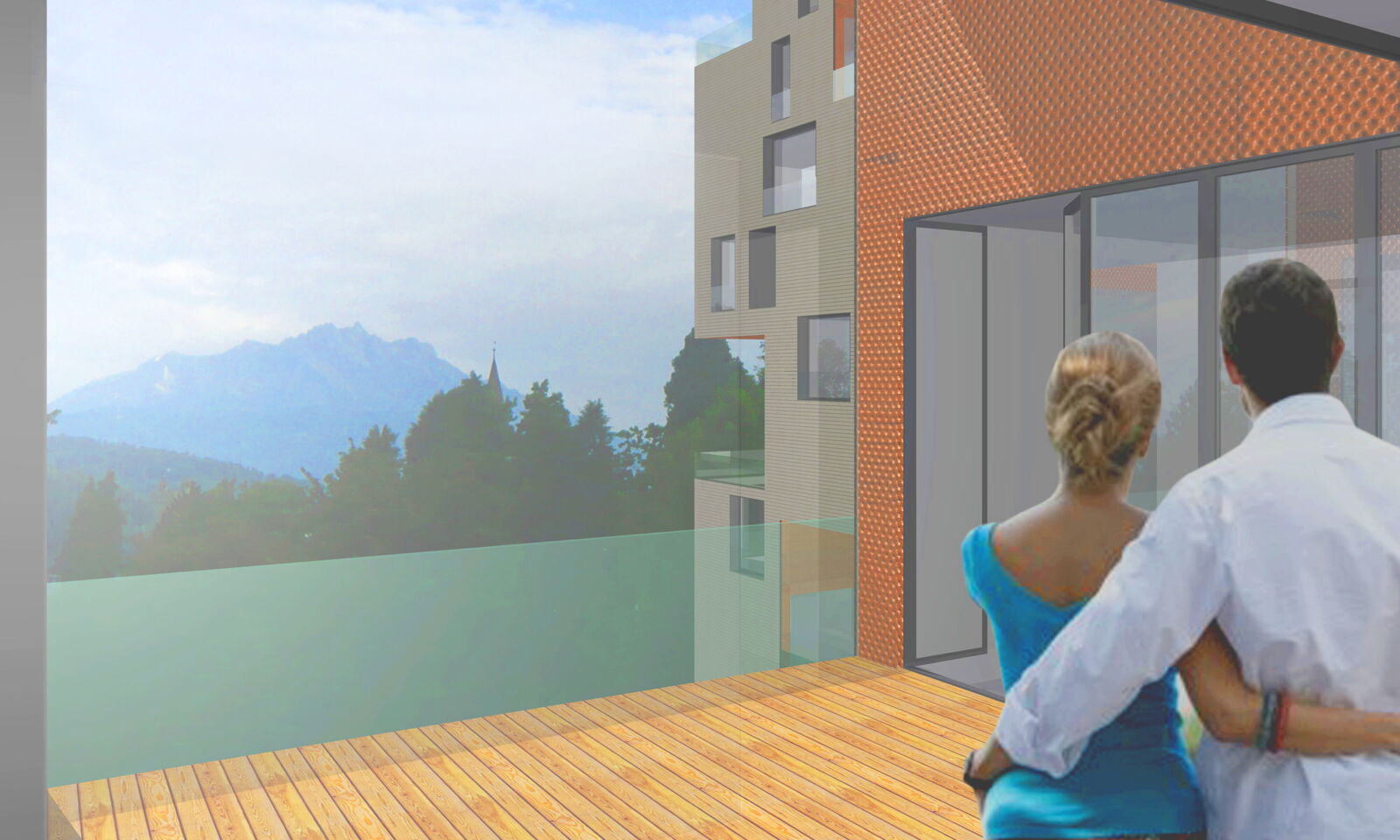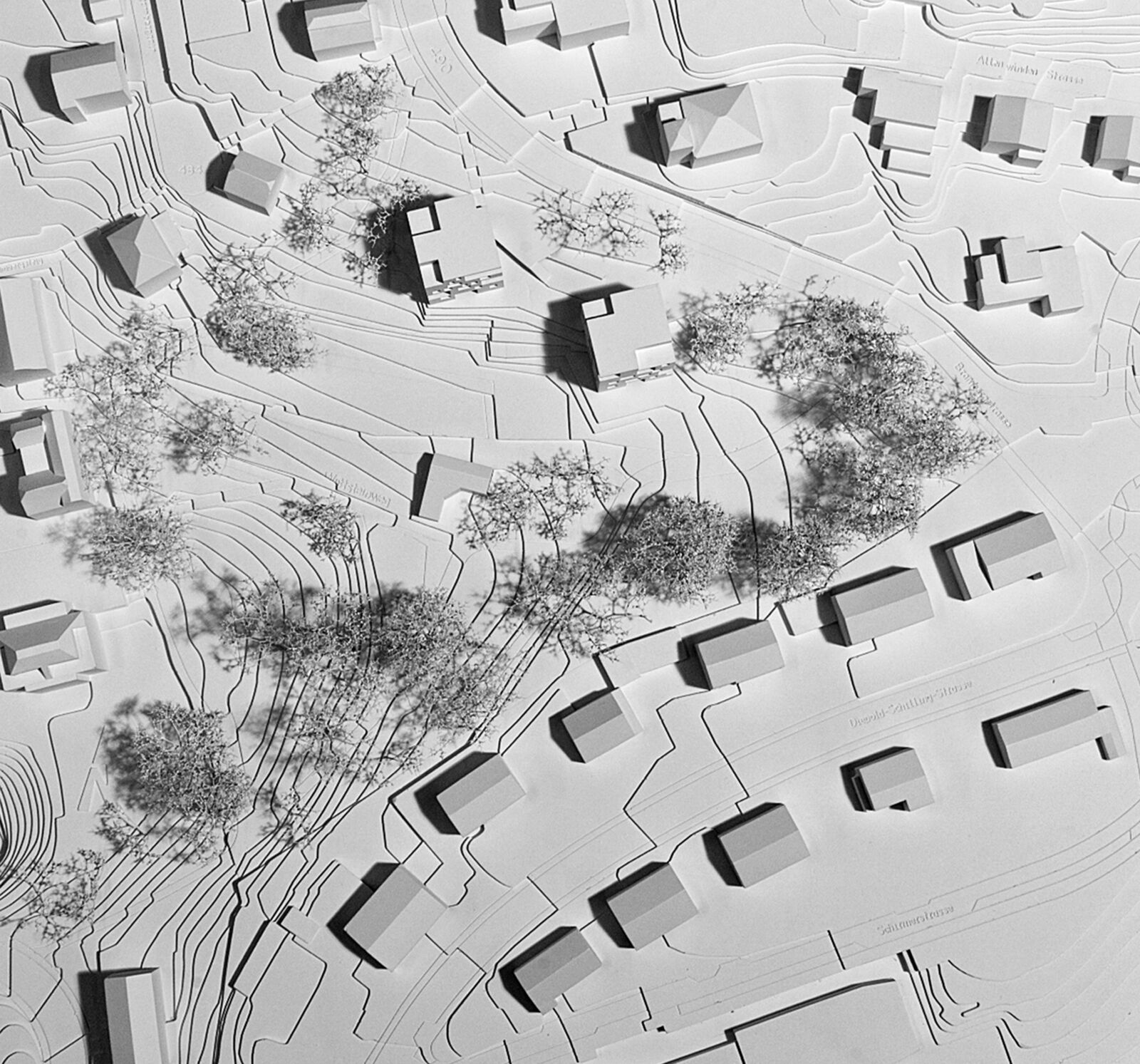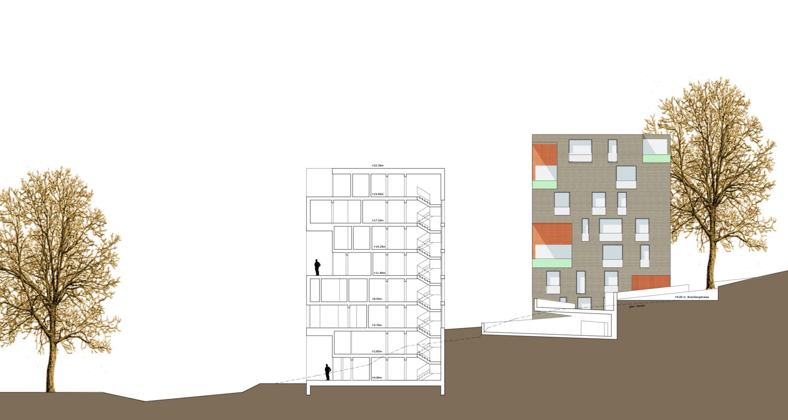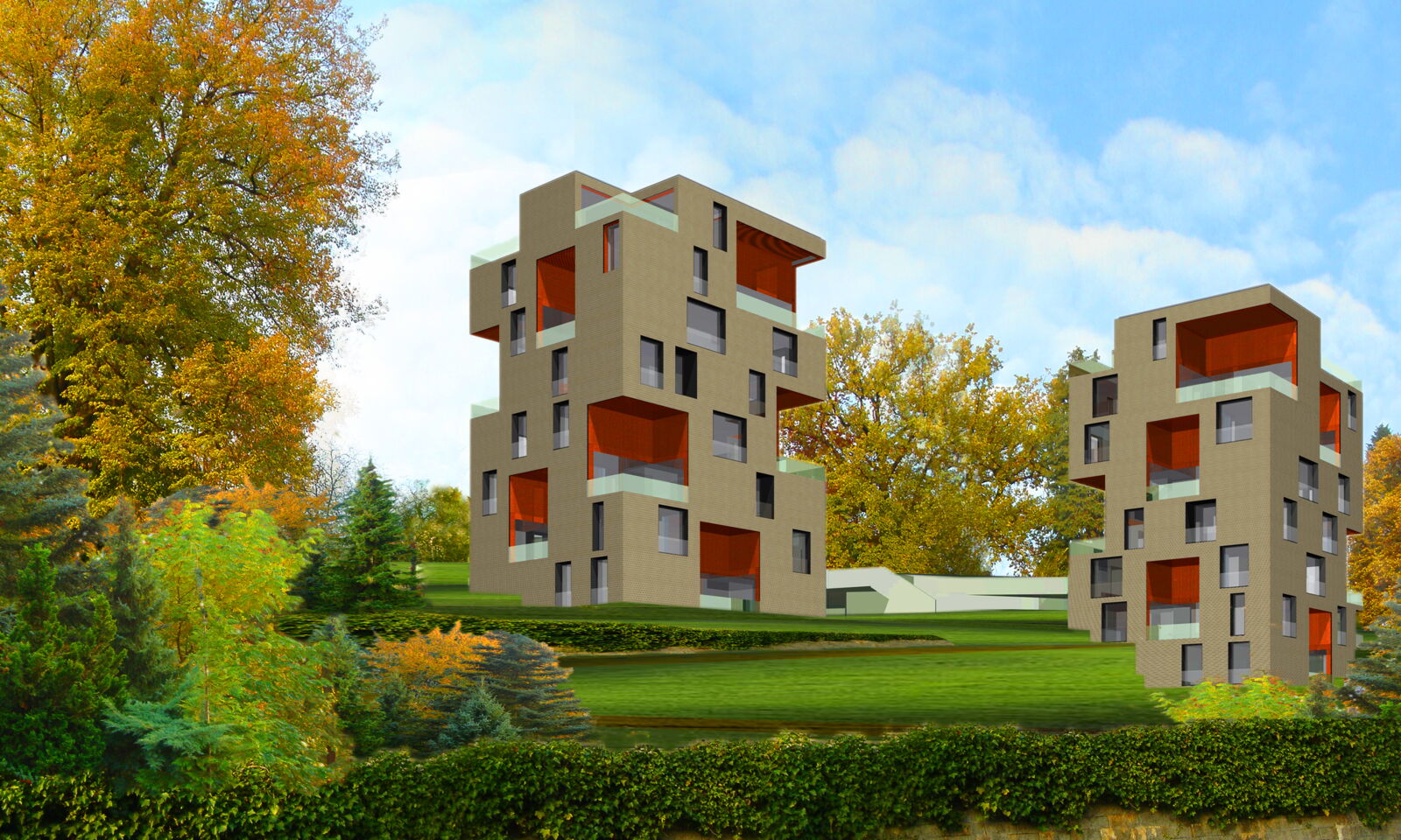 Am oberen Rand des Parks angeordnet, präzisieren die beiden Gebäude die Situation von öffentlichem und privatem Raum, Grün- und Freiraum und Verkehrserschliessung. Einbündig angeordnet nehmen die Wohnungen Bezug auf die villenartige Bebauung im Quartier. Durch den zweigeschossigen Aussenraum erhalten die Wohnungen ein sehr grosszügiges Aussenzimmer.